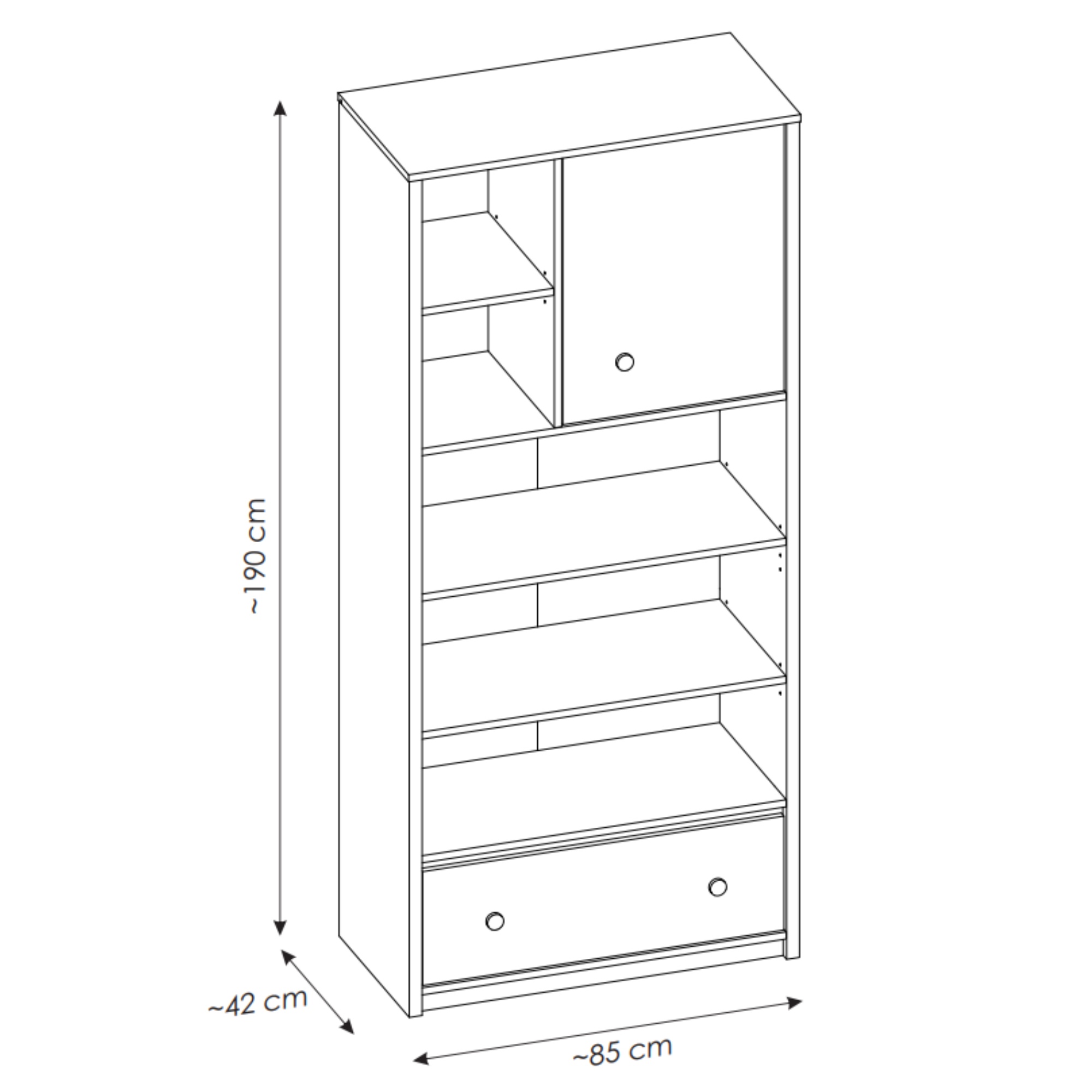 Regál disponuje uzatvárateľným priestorom s otočnými dvierkami. Odkladací priestor je zastúpený v podobe 3 vložených políc, ktoré dobre poslúžia na najrôznejšie dekorácie. Zásuvka v dolnej časti regála poskytuje praktický úložný priestor. Minimalistické rúčkové vyhotovenie umožňuje jednoduché otváranie zásuvky. Regál je vyrobený z laminovanej drevotrieskovej dosky, tento materiál je nenáročný na údržbu.