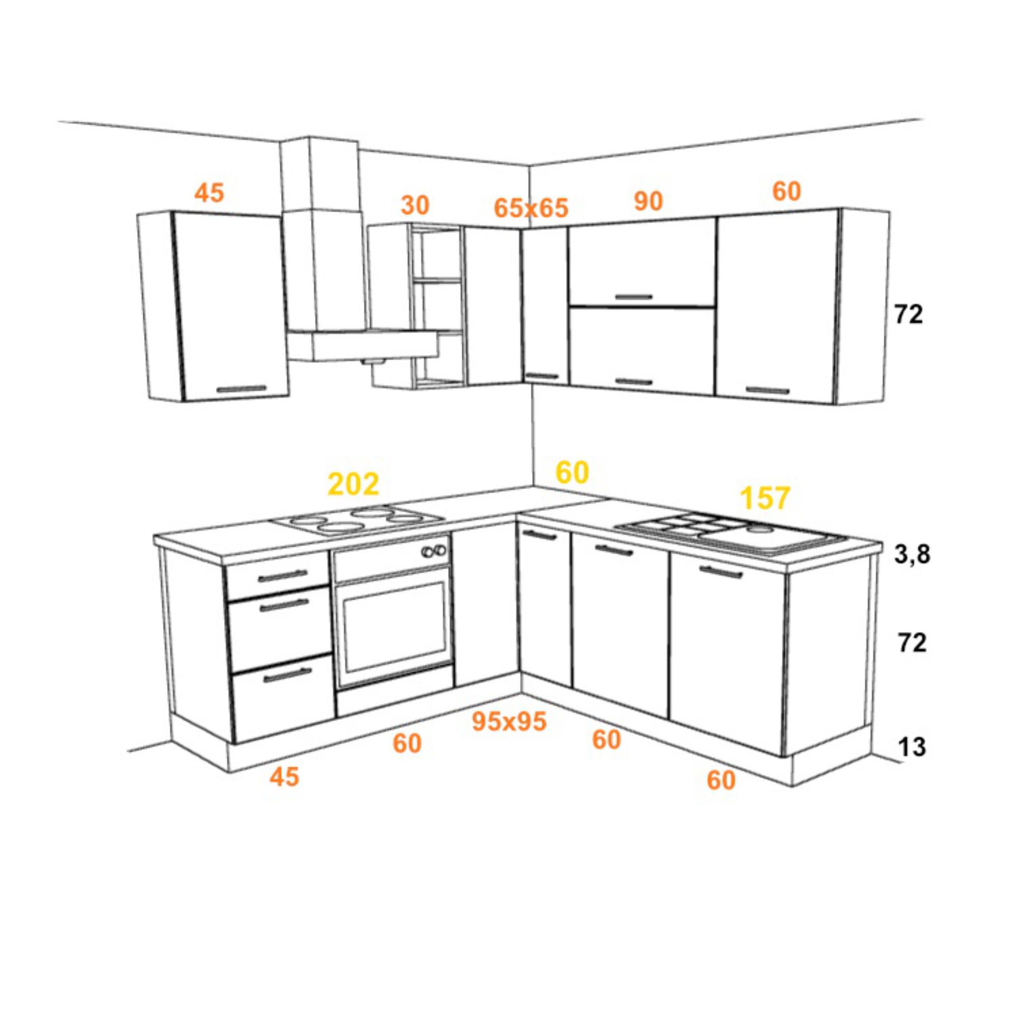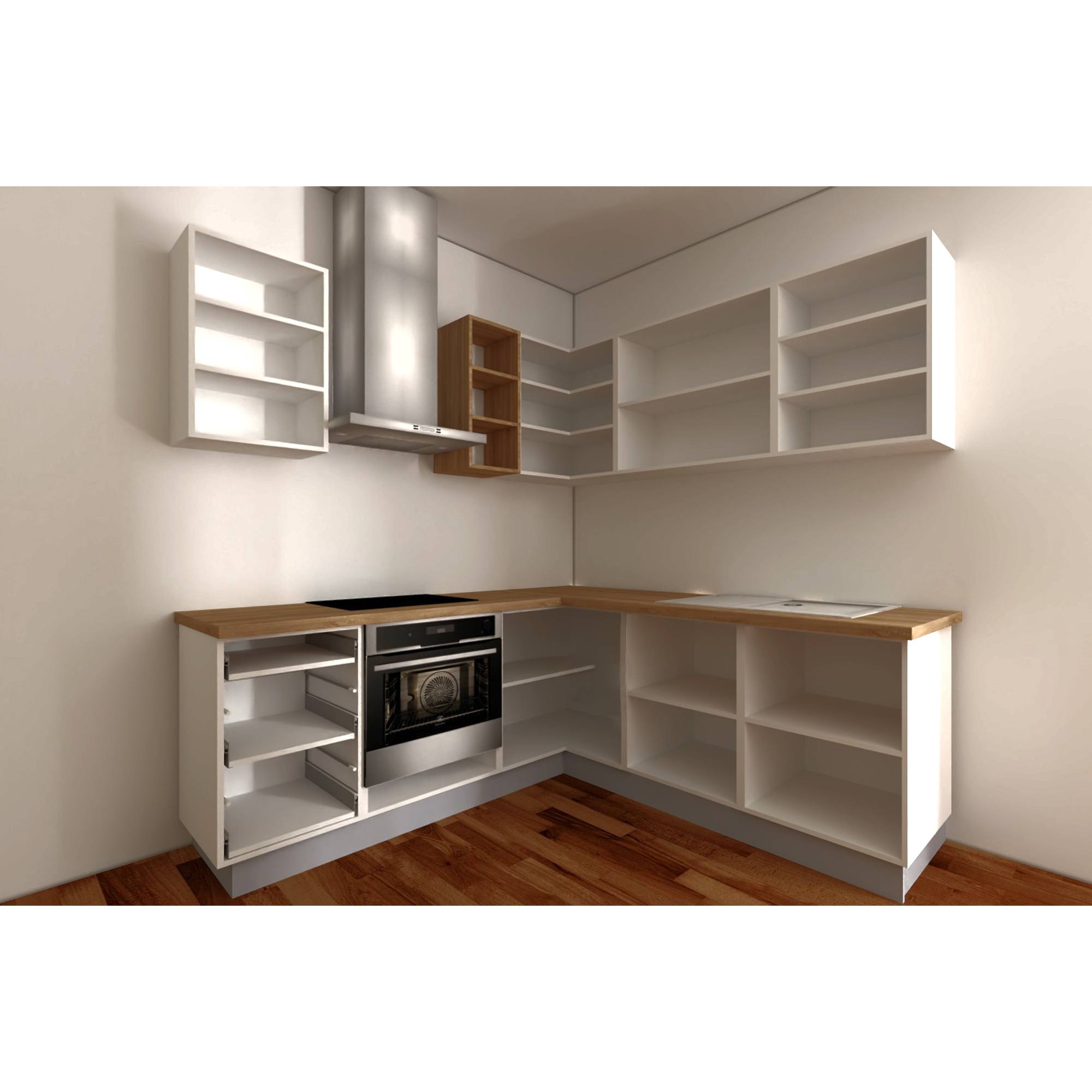 - Zloženie kuchyne: 4 horné skrinky, 1 otvorený regál, spodná zásuvková skrinka, spodná skrinka na vstavanú rúru, rohová spodná skrinka, drezová spodná skrinka