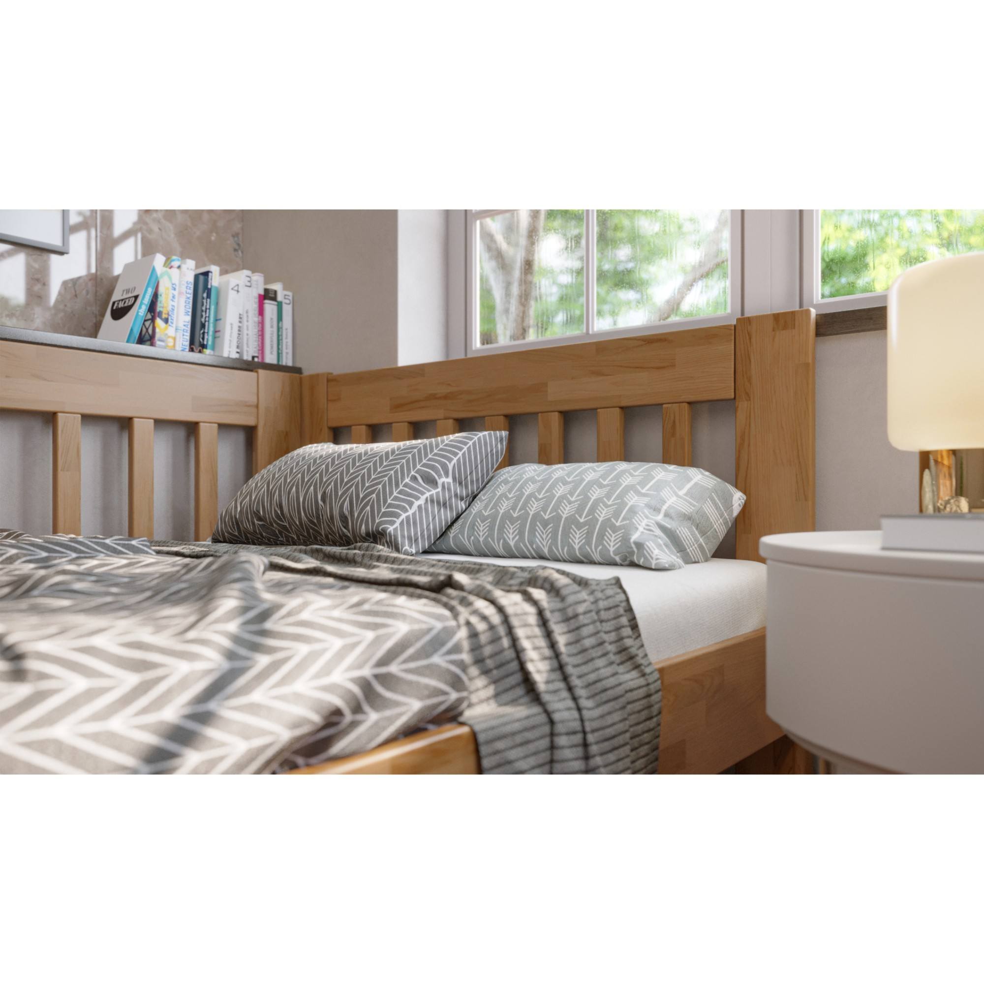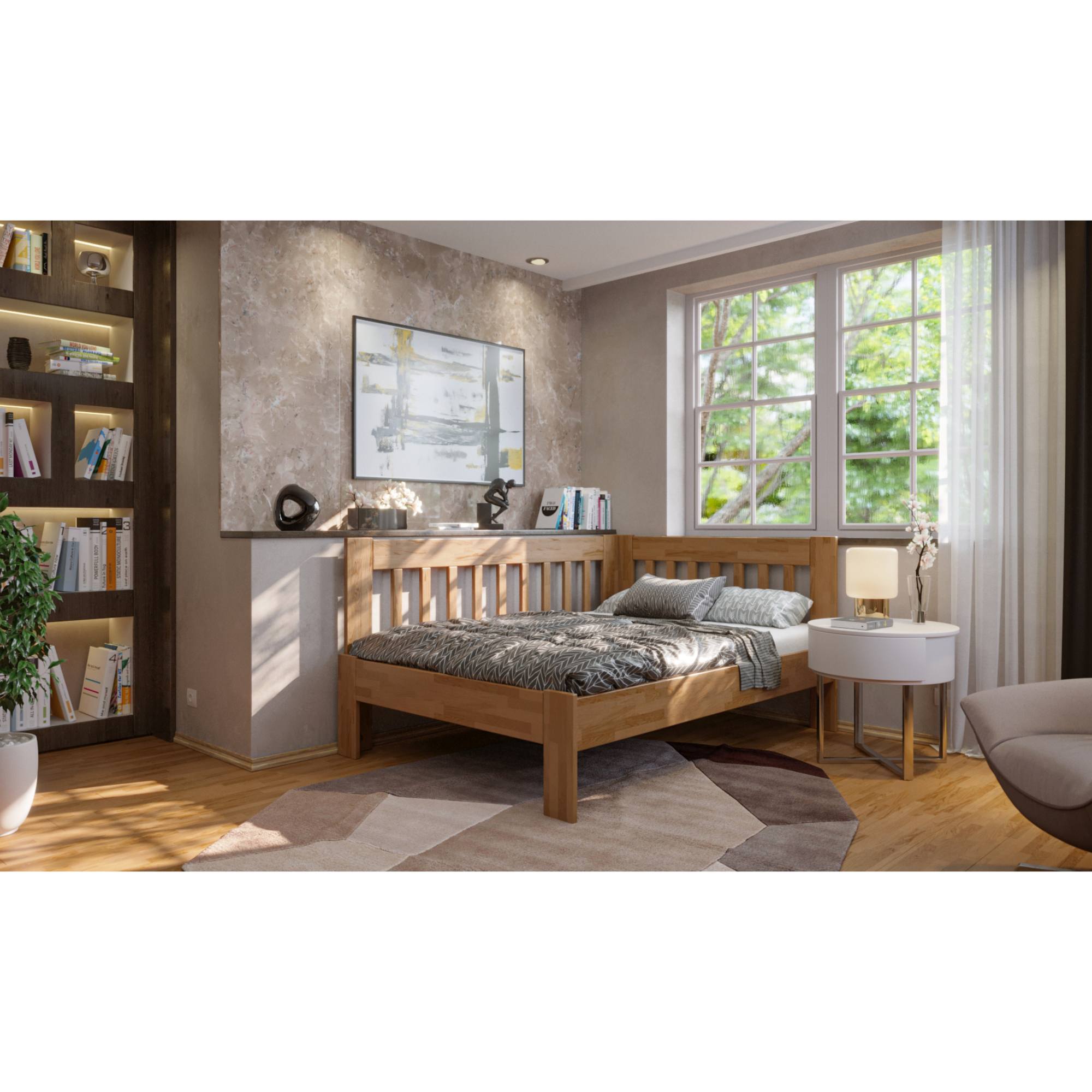 - Doplňujúca poznámka: Posteľ z dubového masívneho dreva je morená do odtieňa svetlý orech. Nosnosť 195 kg na lôžko.