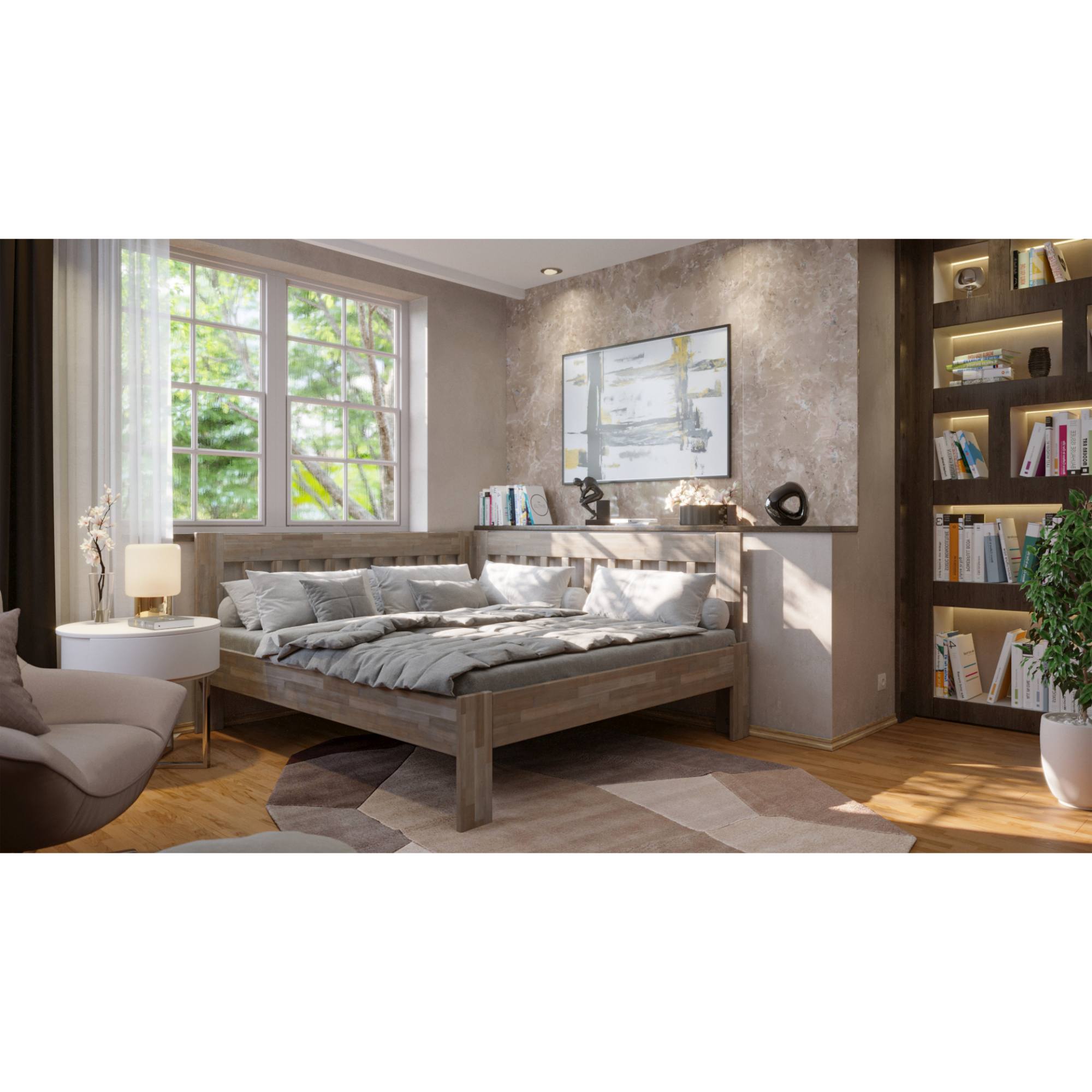 - Doplňujúca poznámka: Postel z bukového masivního dřeva je mořená do šedého odstínu. Nosnost 130 kg pro jednu ložnou plochu.
