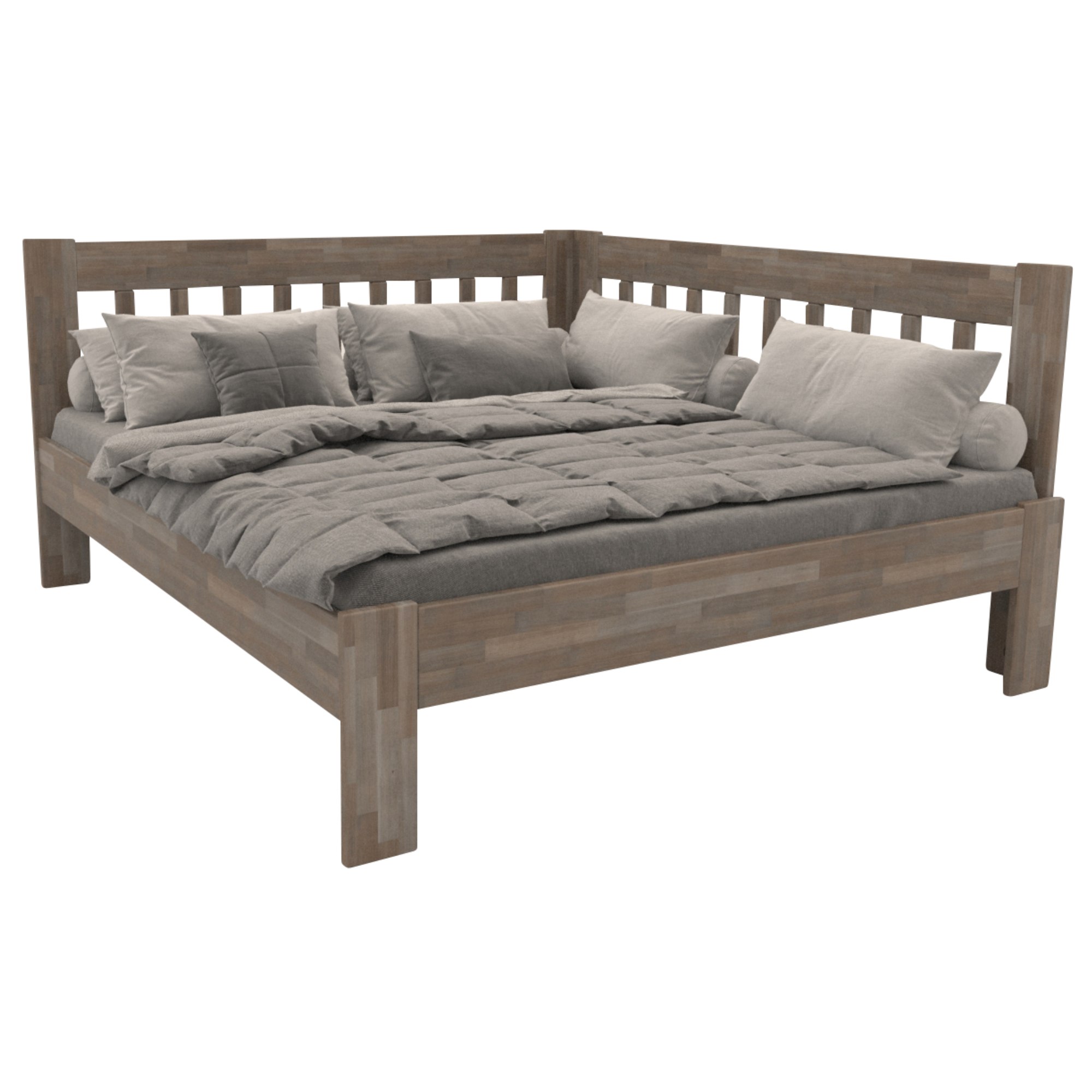 Rohové vyhotovenie umožňuje posteľ umiestniť kamkoľvek, podľa dispozícií vášho interiéru. Čelá postele majú praktické využitie, ak umiestnite posteľ do detskej izby, deti si latky môžu obložiť hračkami, alebo na ne zavesiť menšiu lampičku. Dospelí naopak ocenia vystlanie bočníc vankúšmi pre pohodlné opieranie počas čítania ich obľúbenej knihy. Matrac a rošt si môžete vybrať z našej širokej ponuky, aby bola vaša posteľ kompletná.