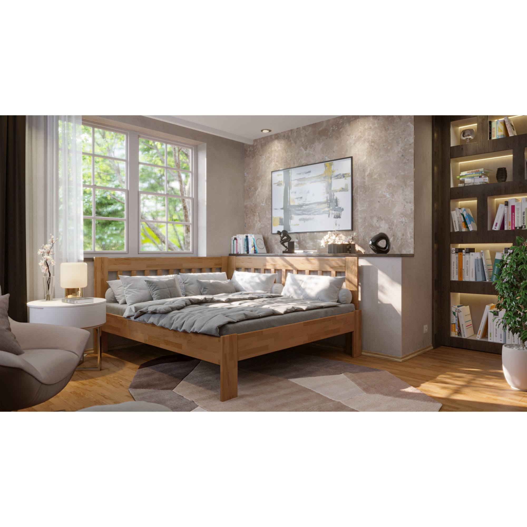 Rohové vyhotovenie umožňuje posteľ umiestniť kamkoľvek, podľa dispozícií vášho interiéru. Čelá postele majú praktické využitie, ak umiestnite posteľ do detskej izby, deti si latky môžu obložiť hračkami, alebo na ne zavesiť menšiu lampičku. Dospelí naopak ocenia vystlanie bočníc vankúšmi pre pohodlné opieranie počas čítania ich obľúbenej knihy. Matrac a rošt si môžete vybrať z našej širokej ponuky, aby bola vaša posteľ kompletná.