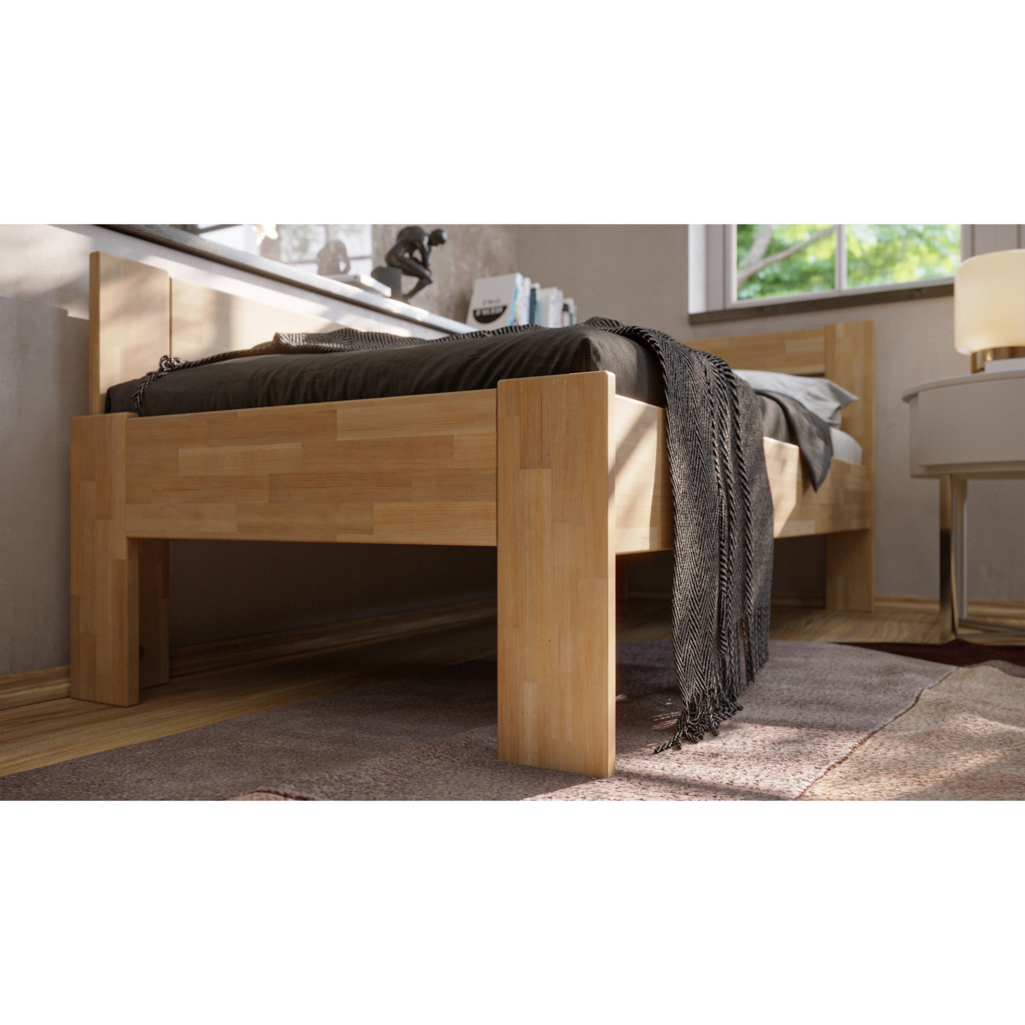 Konštrukcia je vyrobená z masívneho dreva, ktoré je pevné, odolné a má dlhú životnosť. Povrchová olejovaná úprava drevo napúšťa a zvyšuje odolnosť proti oteru. Praktické rohové vyhotovenie vám umožňuje posteľ umiestniť kamkoľvek, podľa dispozícií danej miestnosti. Čelo aj vysoká bočnica postele v kombinácii s vankúšmi sú ideálne na pohodlné opretie počas odpočinku. Celú konštrukciu podopierajú pevné nohy zaisťujúce celkovú stabilitu a umožňujúce ľahké upratovanie pod posteľou. Dodávaná je bez matraca a roštu, ale veríme, že si tie ideálne vyberiete z nášho širokého sortimentu.
