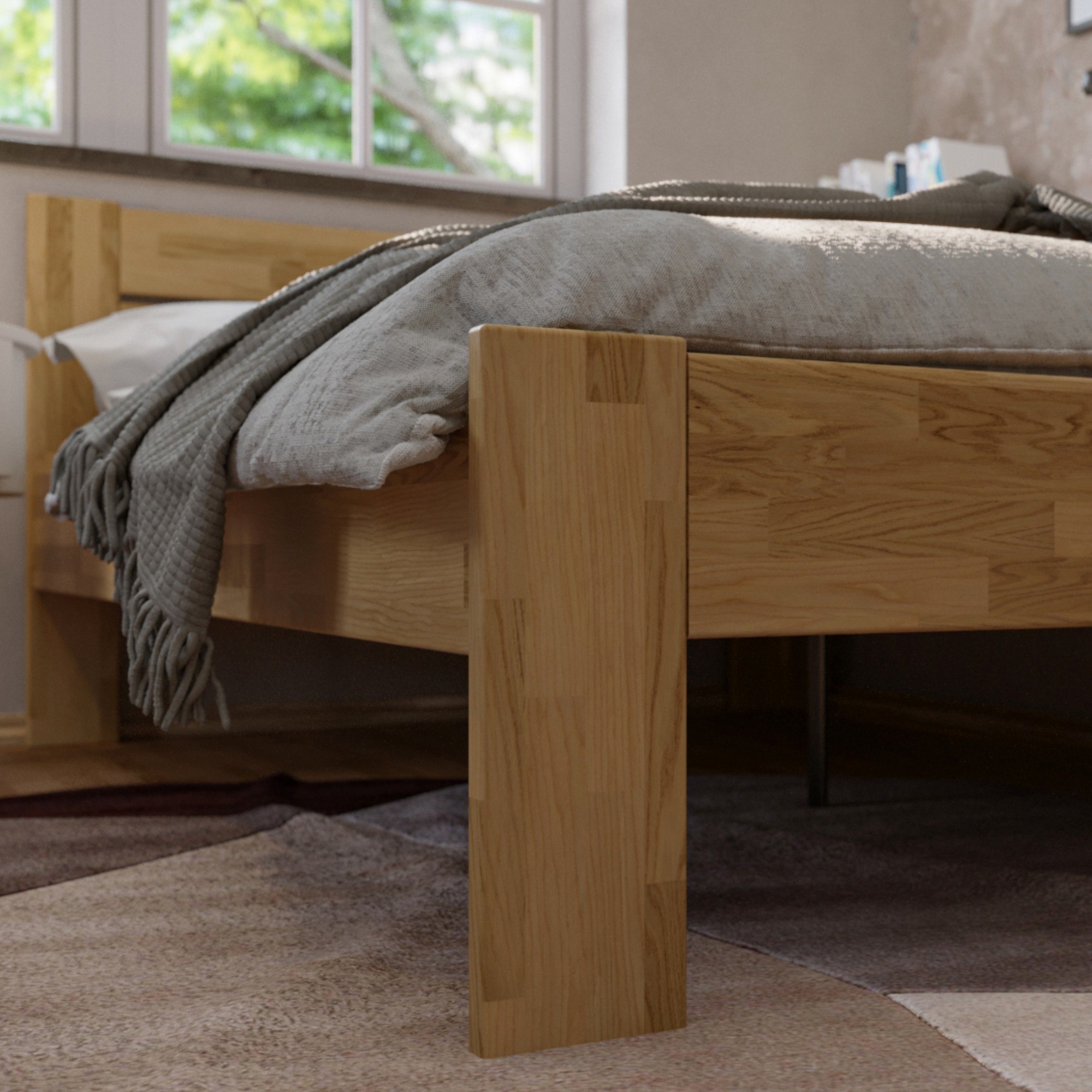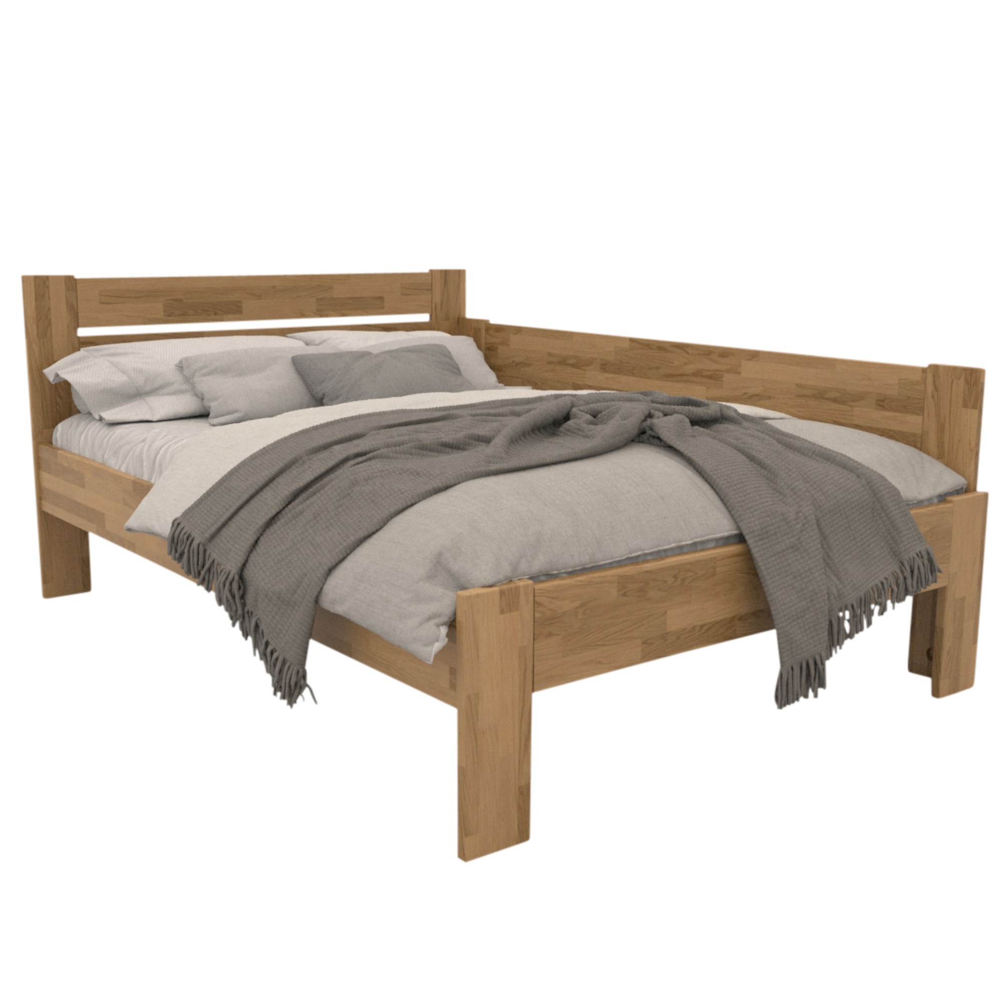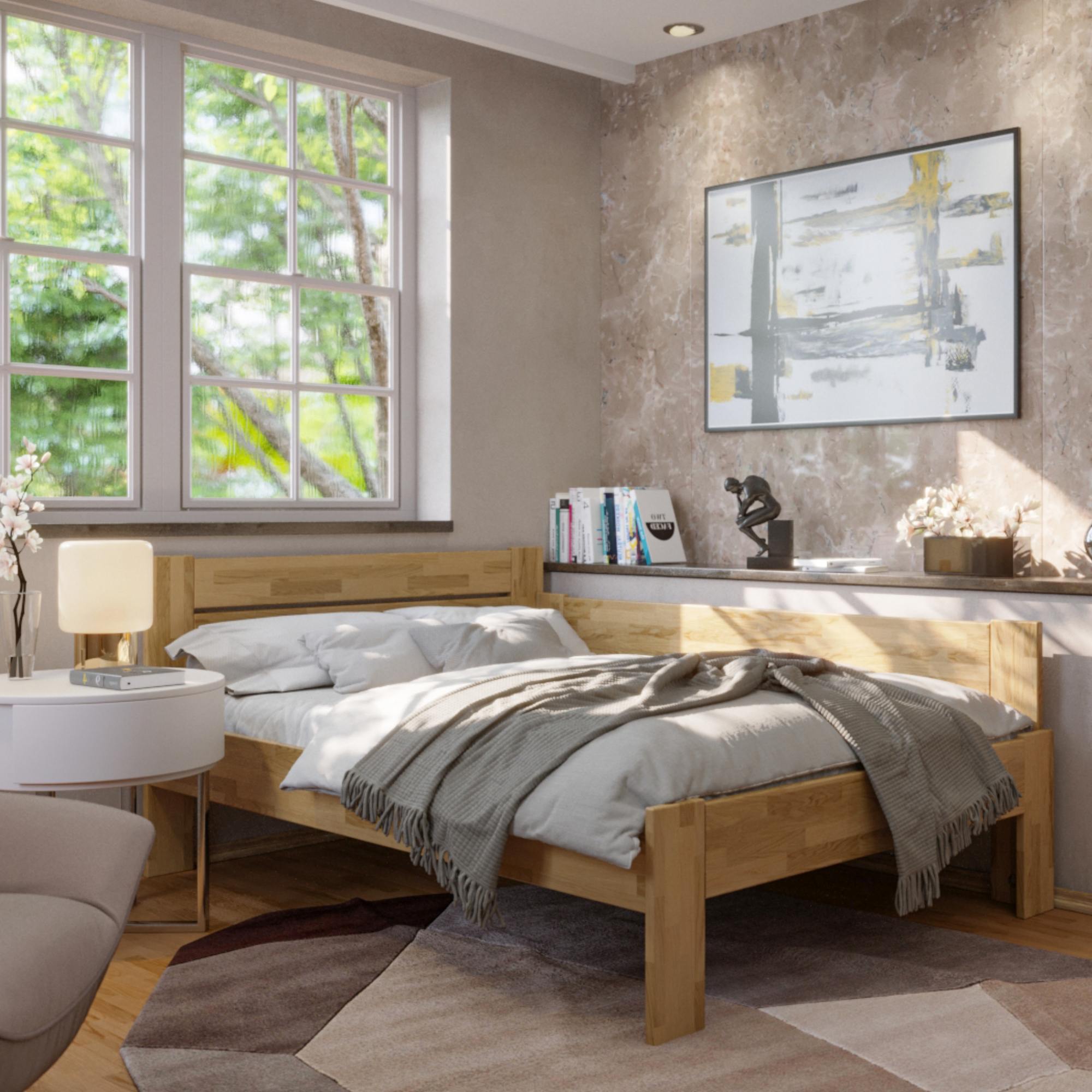 Konštrukcia je vyrobená z masívneho dreva, ktoré je pevné, odolné a má dlhú životnosť. Povrchová olejovaná úprava drevo napúšťa a zvyšuje odolnosť proti oteru. Praktické rohové vyhotovenie vám umožňuje posteľ umiestniť kamkoľvek, podľa dispozícií danej miestnosti. Čelo aj vysoká bočnica postele v kombinácii s vankúšmi sú ideálne na pohodlné opretie počas odpočinku. Celú konštrukciu podopierajú pevné nohy zaisťujúce celkovú stabilitu a umožňujúce ľahké upratovanie pod posteľou. Dodávaná je bez matraca a roštu, ale veríme, že si tie ideálne vyberiete z nášho širokého sortimentu.