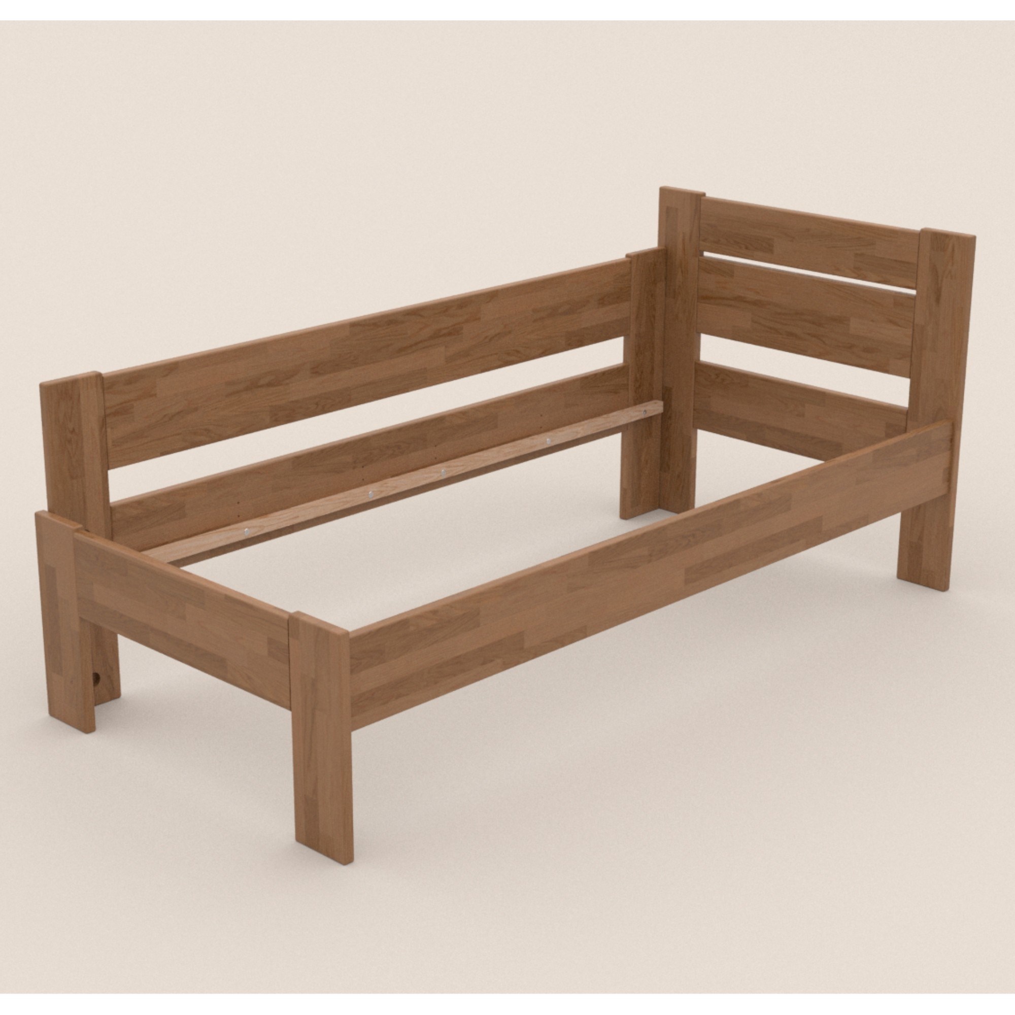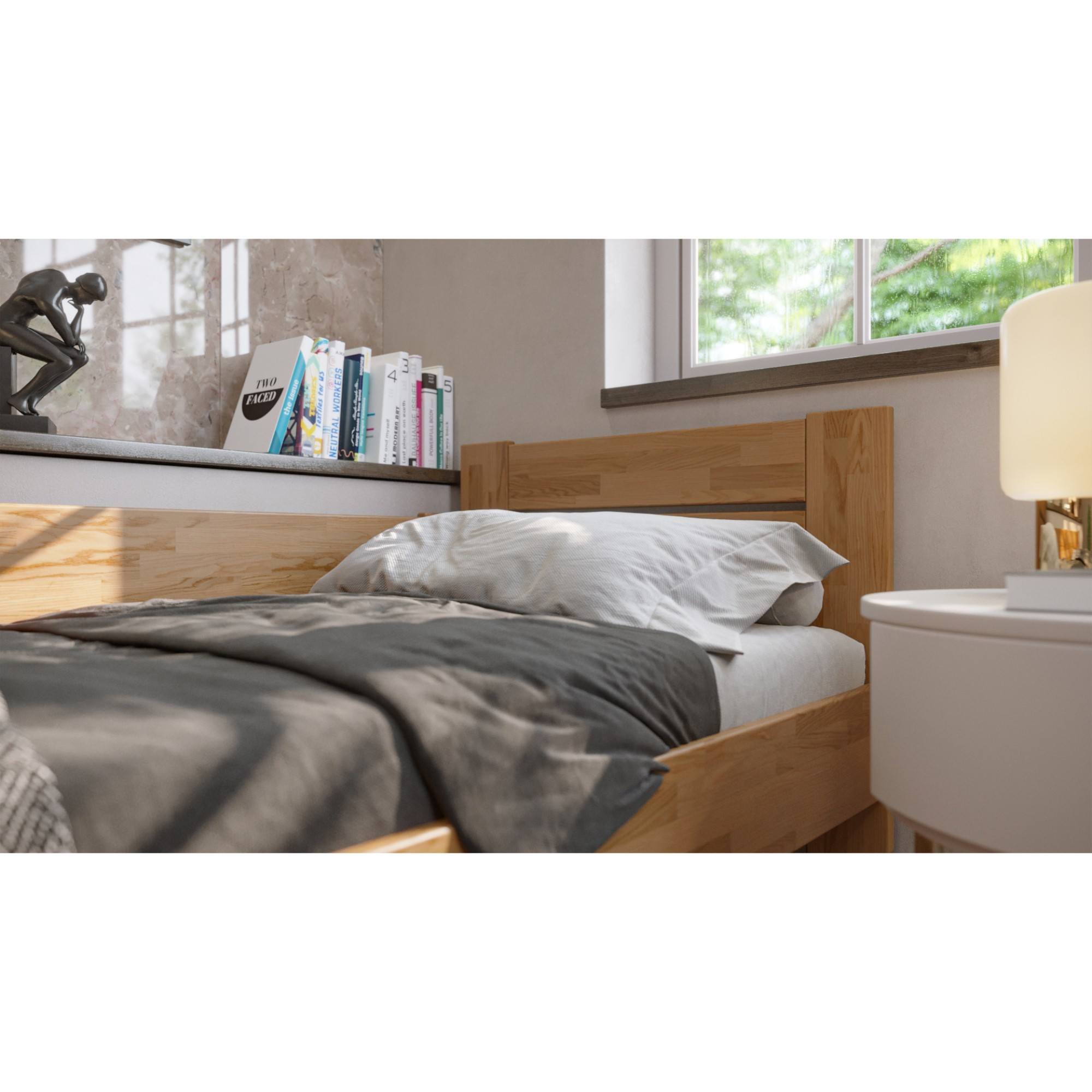 - Doplňujúca poznámka: Posteľ z dubového masívneho dreva je morená do odtieňa svetlý orech. Maximálna nosnosť celej postele je 130 kg.