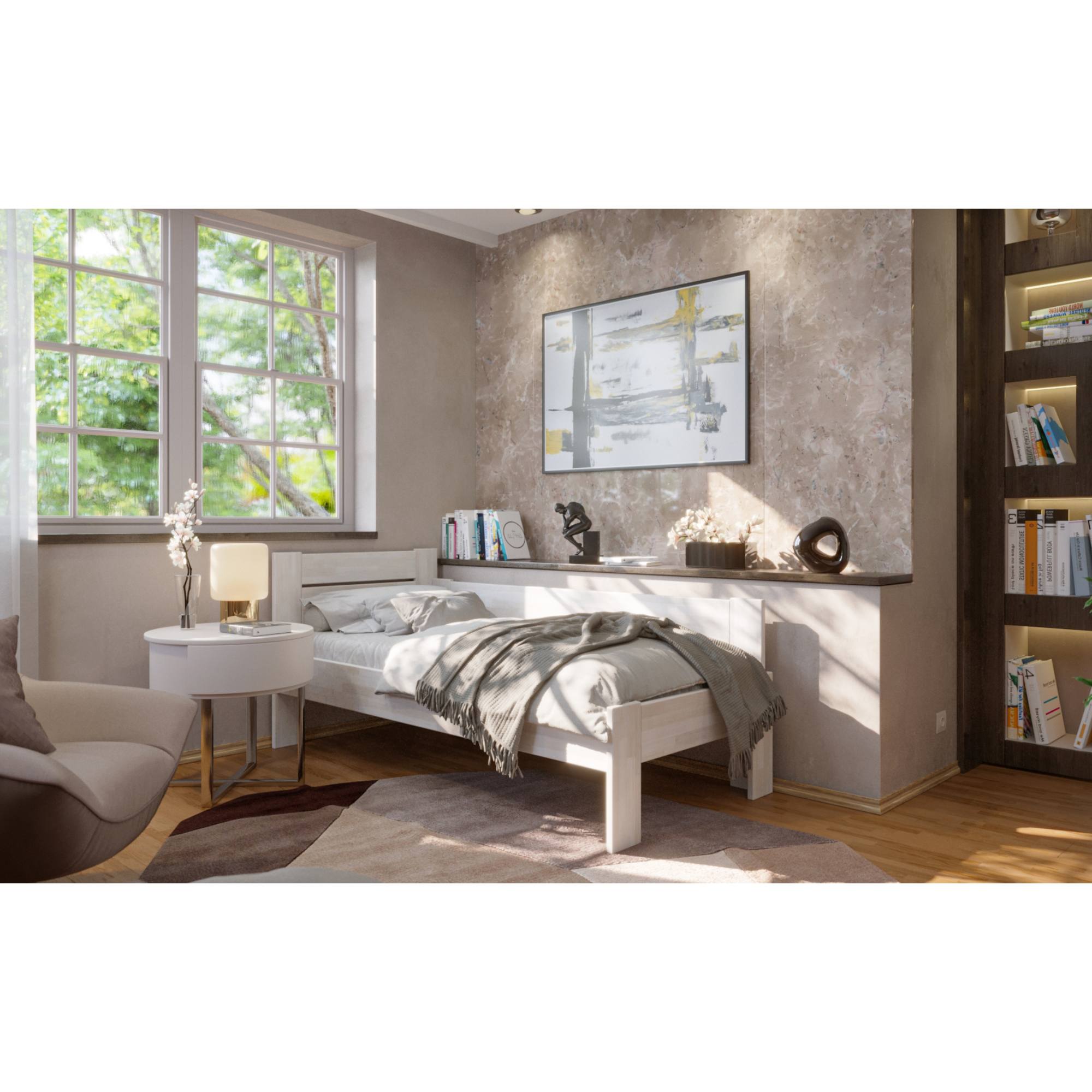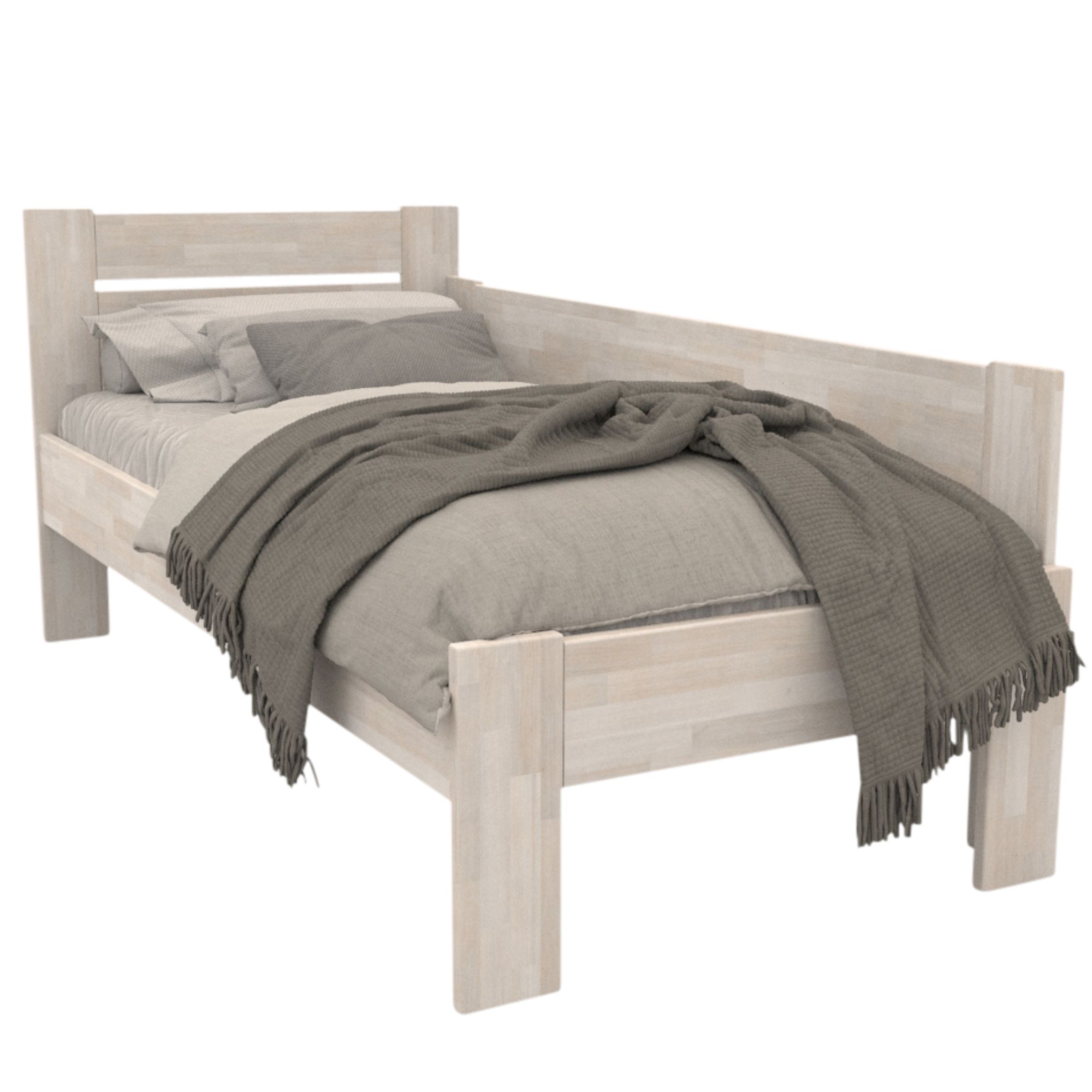 - Doplňujúca poznámka: Posteľ z bukového masívneho dreva je morená do bieleho odtieňa. Maximálna nosnosť celej postele je 130 kg.