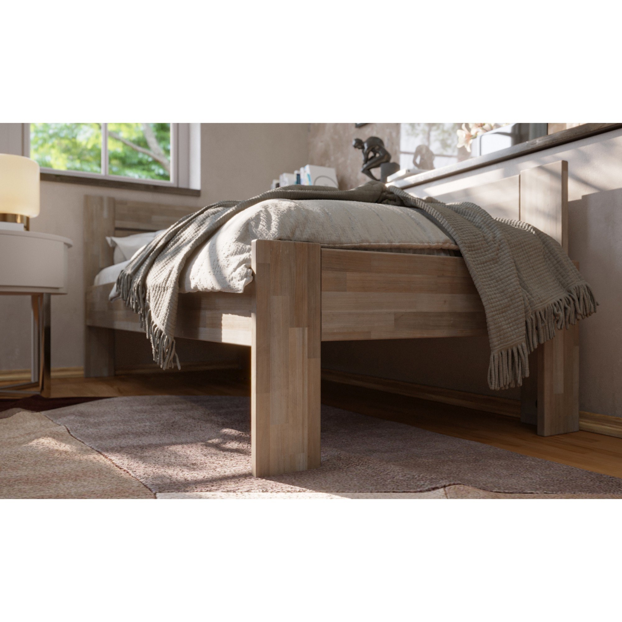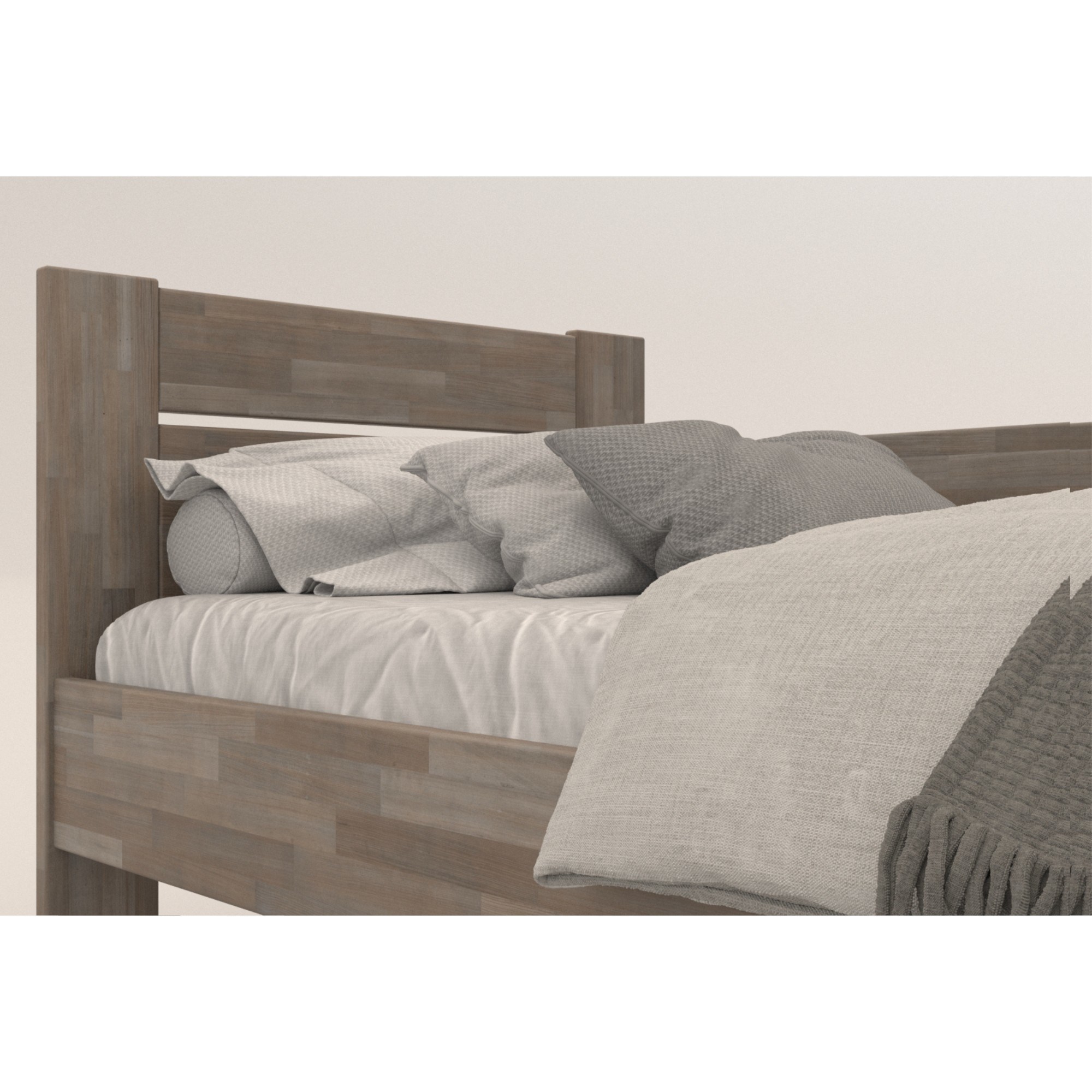 - Doplňujúca poznámka: Posteľ z bukového masívneho dreva je morená do sivého odtieňa. Maximálna nosnosť celej postele je 130 kg.