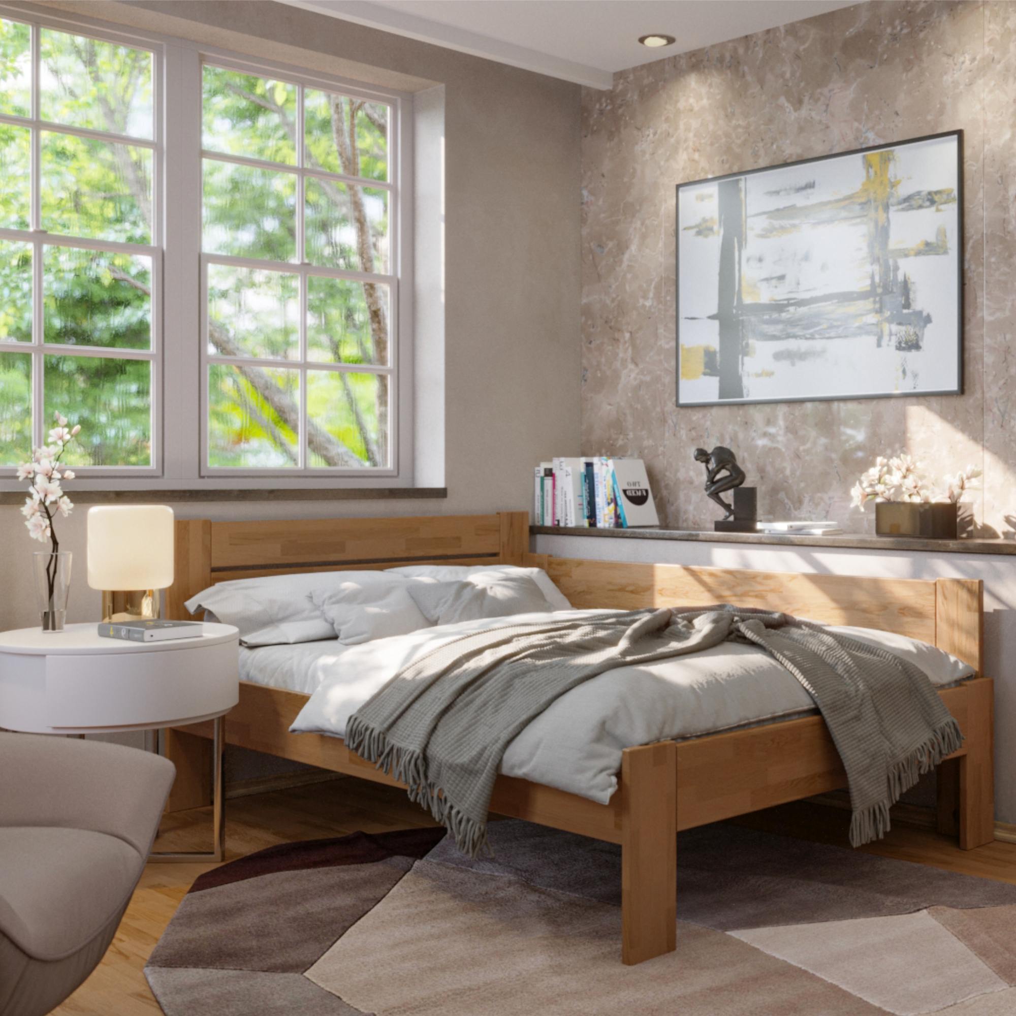 - Doplňujúca poznámka: Posteľ z dubového masívneho dreva je morená do odtieňa svetlý orech. Nosnosť na jednu ložnú plochu je 98 kg.