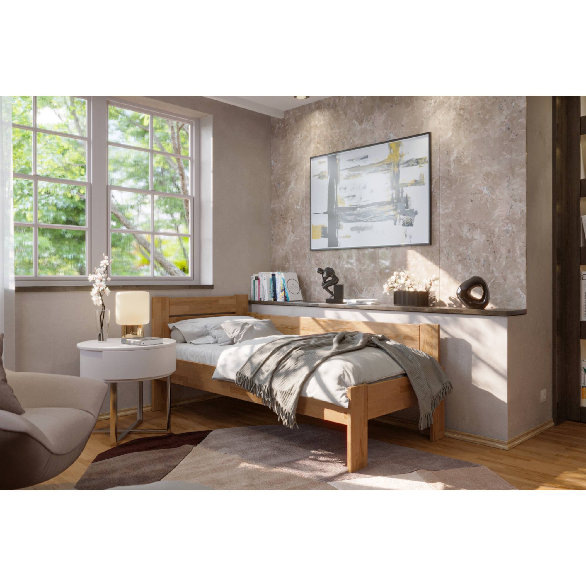 - Doplňujúca poznámka: Posteľ z dubového masívneho dreva je morená do odtieňa svetlý orech. Maximálna nosnosť celej postele je 130 kg.