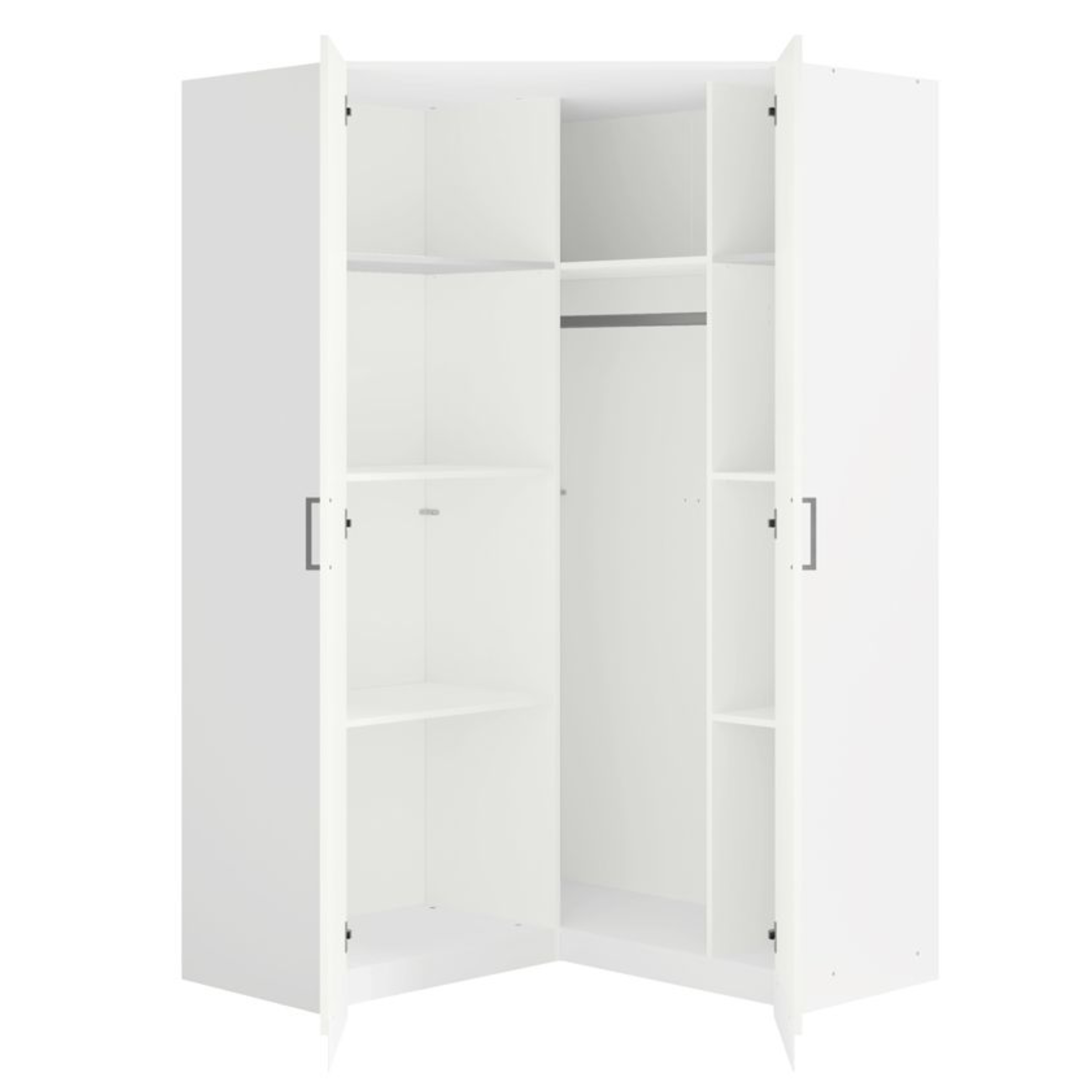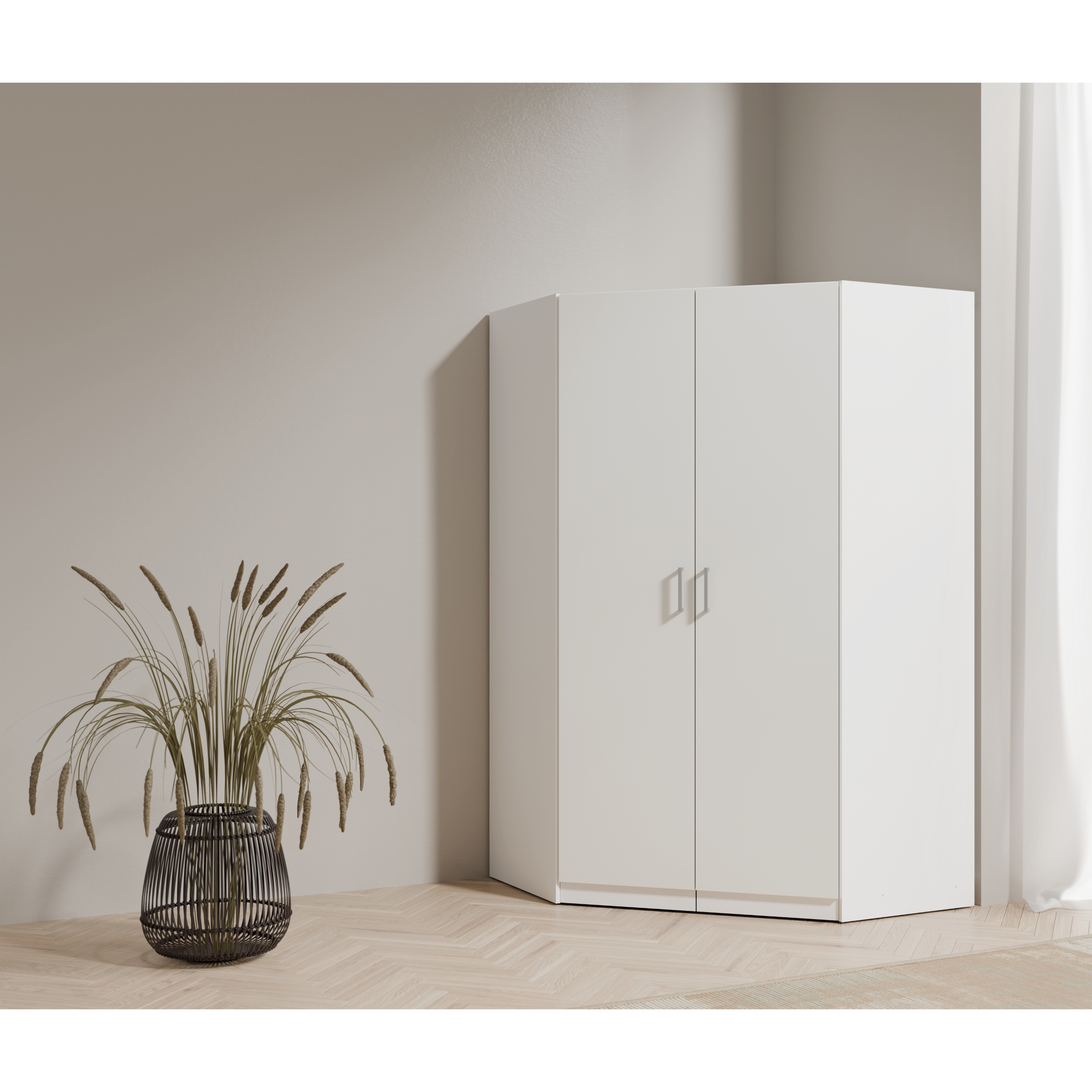 Jednoduchá a praktická rohová šatníková skriňa TALLIN 8 vyhotovená v nadčasovom bielom spracovaní je ideálnym riešením pre atypické priestory, kde by inak zostalo nevyužité miesto. Skvele sa hodí do rohu miestnosti a efektívne tak vyplní priestor.
