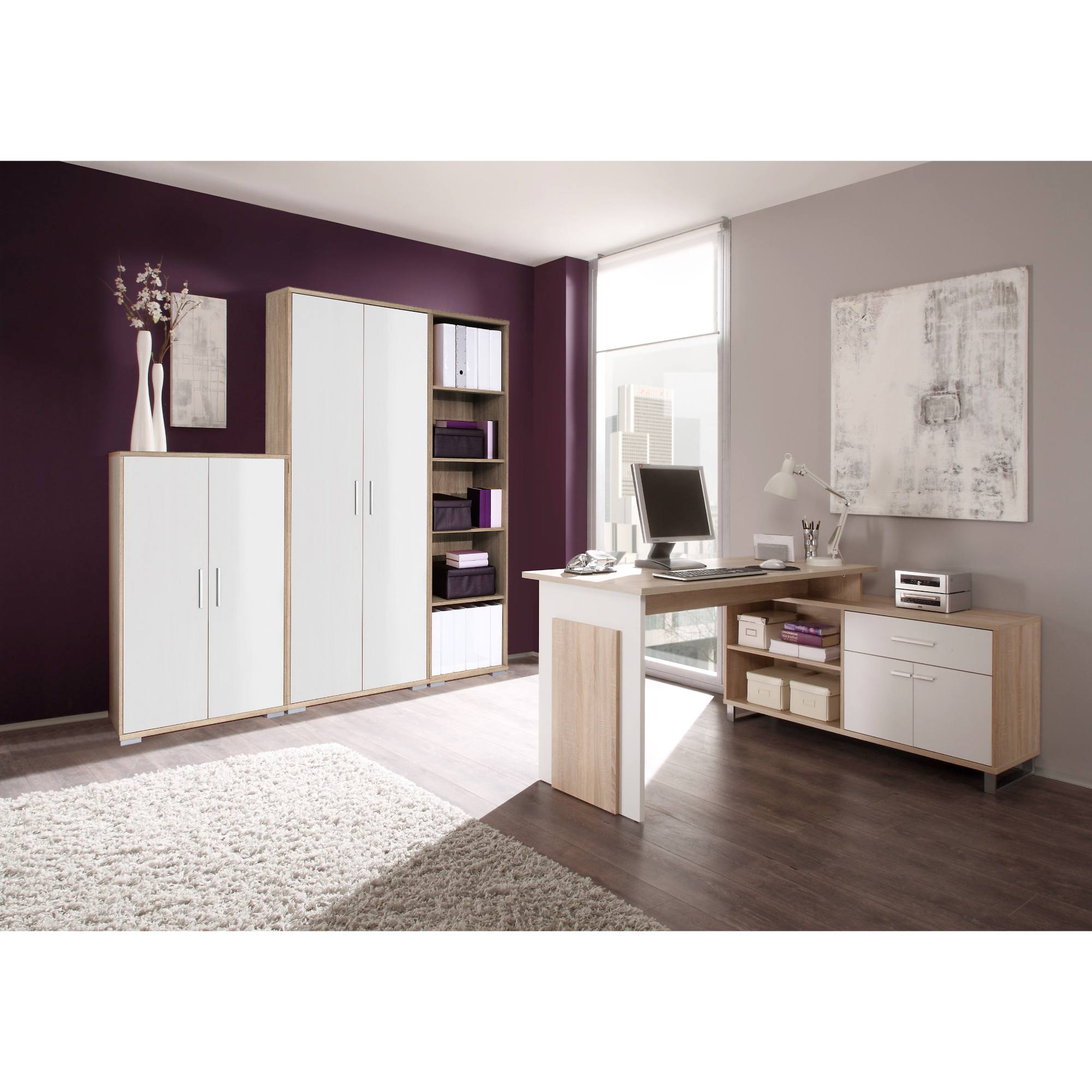 Moderný rohový písací stôl MANAGER optimálne vyrieši vašu domácu kanceláriu. Prírodný dekor duba v kombinácii s bielou farbou zapadne takmer do každého interiéru. Skladá sa zo samotného písacieho stola a regálovej komody, takže úložný priestor budete mať vždy po ruke. Komoda disponuje dvoma otvorenými policami, zásuvkou a priestorom za dvierkami. Stôl je vyrobený z kvalitného lamina. Celkové rozmery rohového písacieho stola sú ŠxVxH: 158x76x130 cm. Rozmer stola je ŠxVxH: 140x76x65 cm a komody 130x62x40 cm.