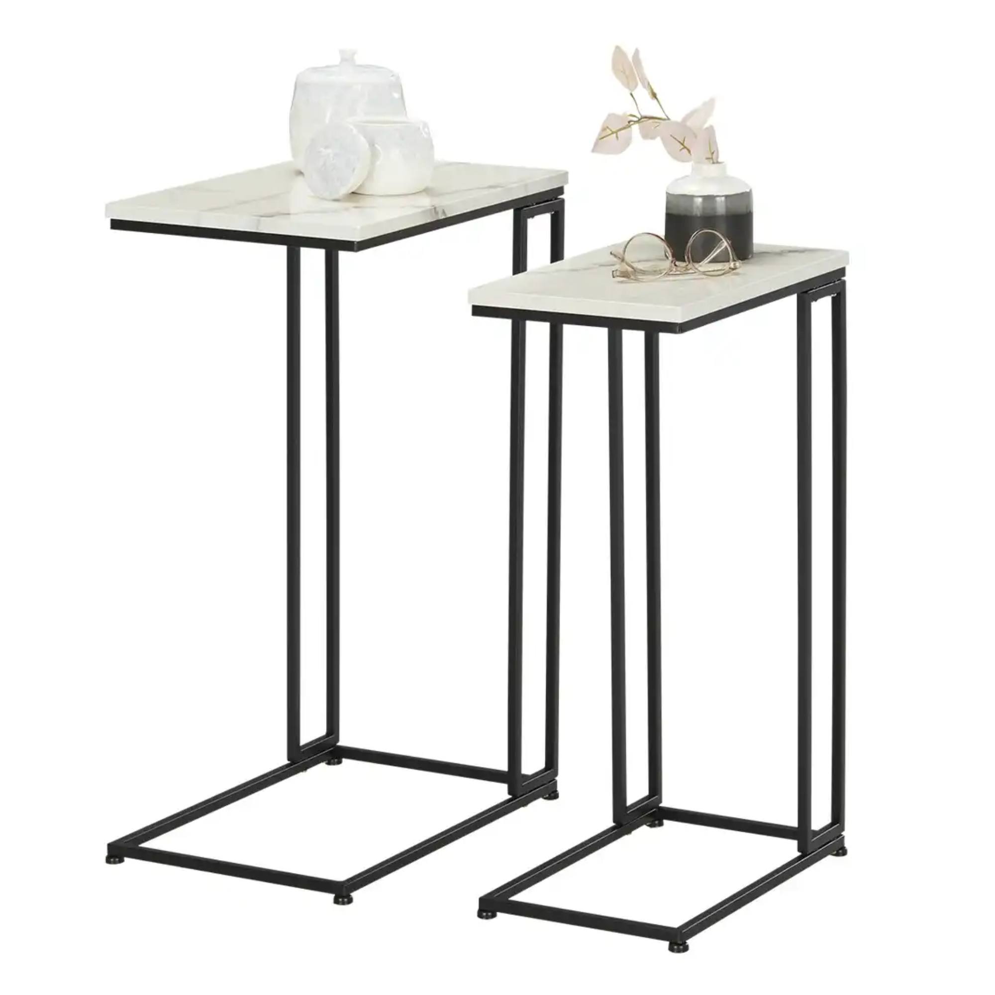 Sada obsahuje 2 ks stolíkov v rôznych veľkostiach. Stolíky na prvý pohľad zaujmú doskou s dekorom bieleho mramoru, ktorá je luxusným prvkom ich moderného dizajnu. Doska je vyrobená z laminovaného drevotrieskového materiálu. Ich stabilitu zaisťuje kovová konštrukcia nôh s povrchovou úpravou práškovým lakom v čiernej farbe. Na úsporu miesta je možné menší stolík uskladniť pod väčší.