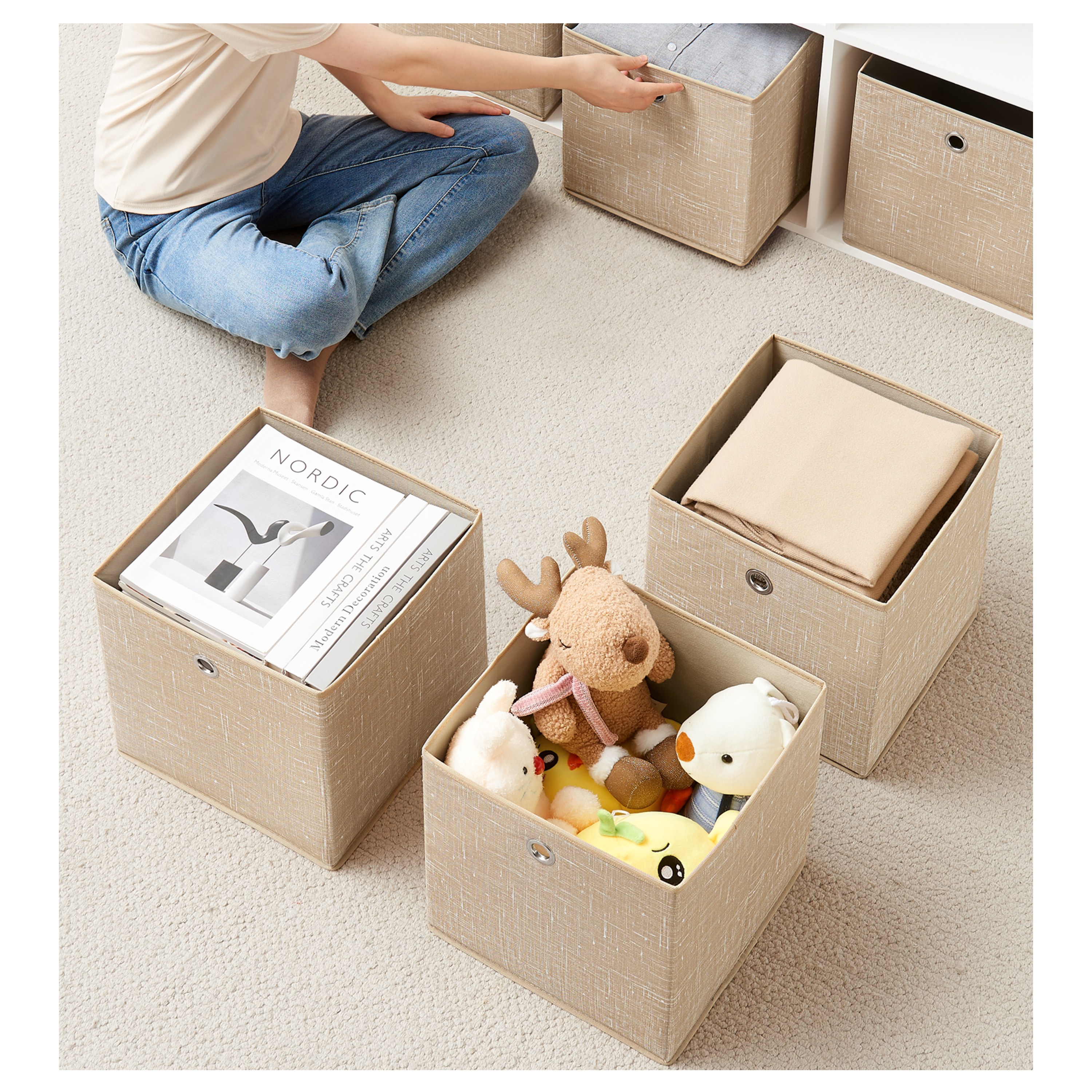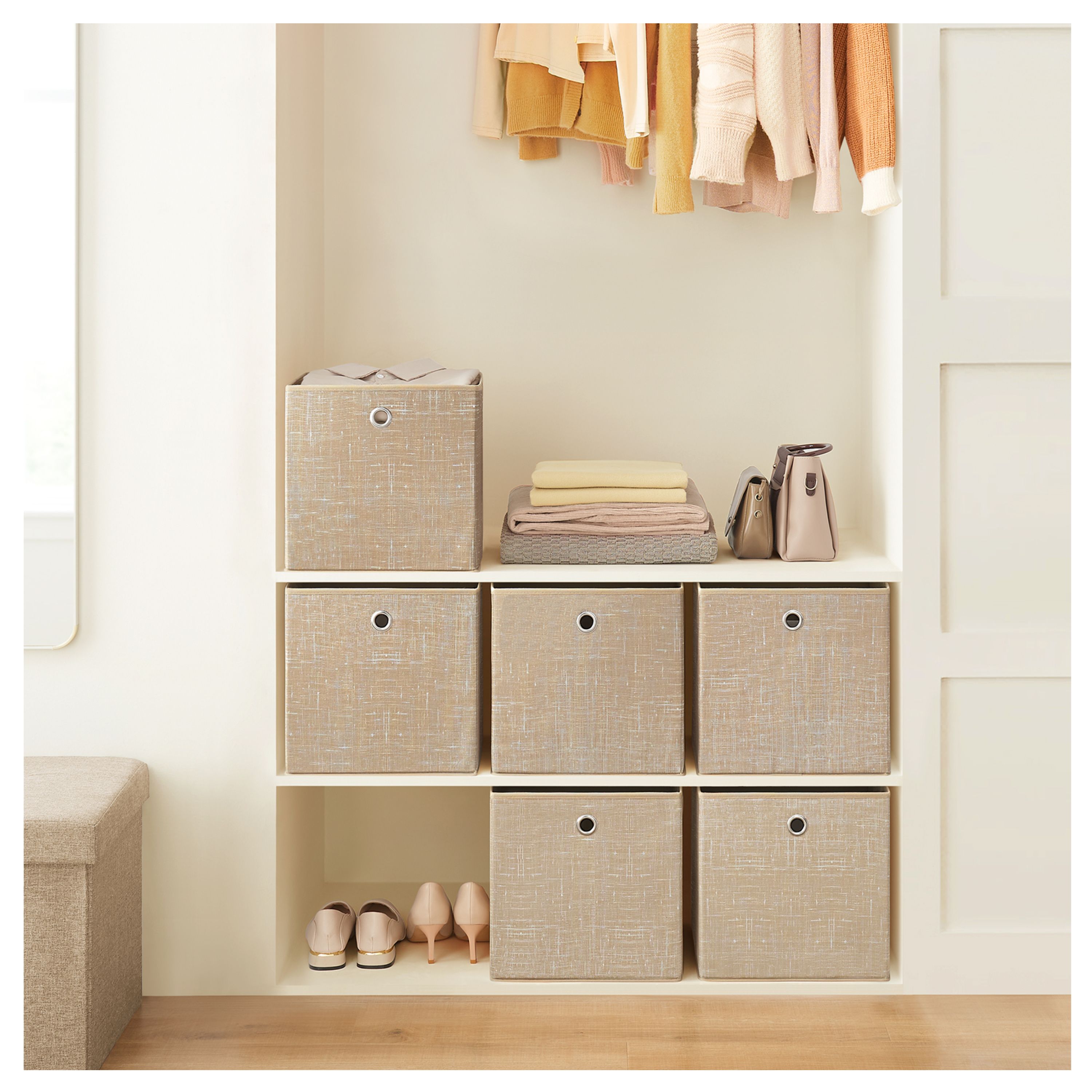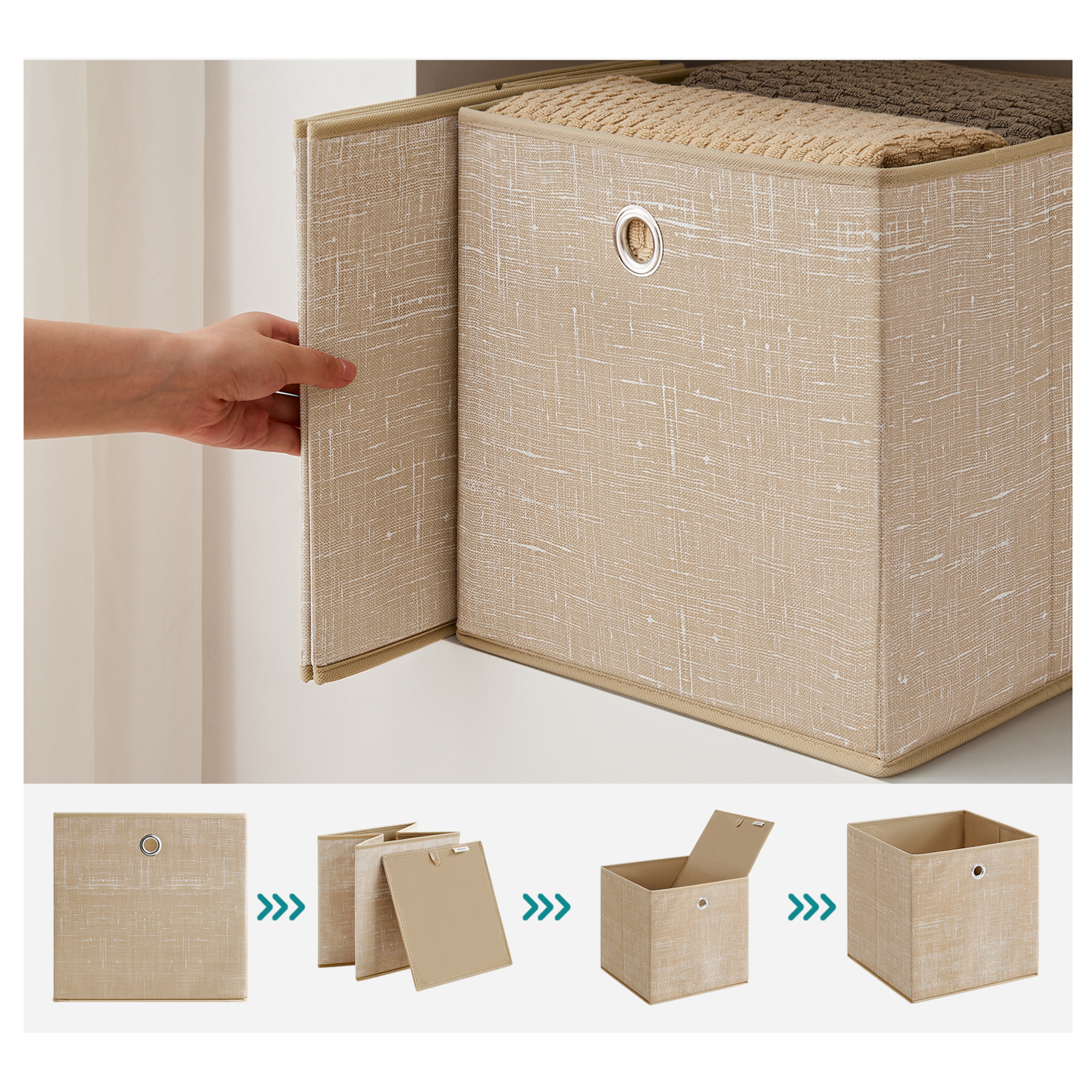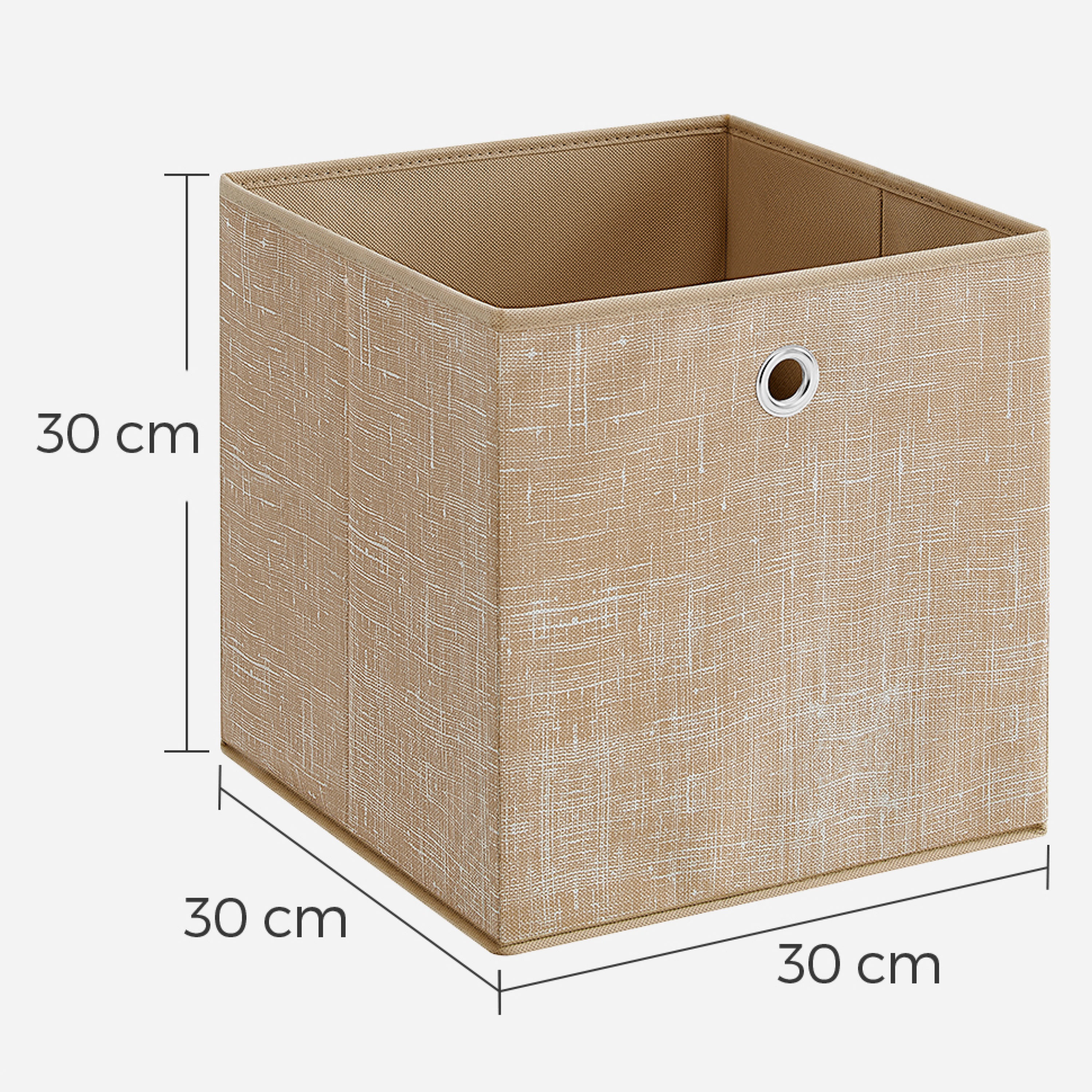 Sada obsahuje 6 kusov s maximálnou nosnosťou 5 kg a je vyrobená z ľanovej netkanej textílie. Boxy možno jednoducho zložiť aj rozložiť, čím šetria miesto pri ich nevyužití. Ich ľahká konštrukcia spolu s kovovými úchytmi zabezpečujú jednoduchú manipuláciu. Majú ideálny tvar do regálu, kde pomôžu prehľadne usporiadať vaše dokumenty, drobné doplnky či hračky a zároveň ich ochránia pred všadeprítomným prachom. Sú vhodné do pracovne, obývacej izby aj predsiene a ponúkajú všestranné využitie v každej domácnosti.