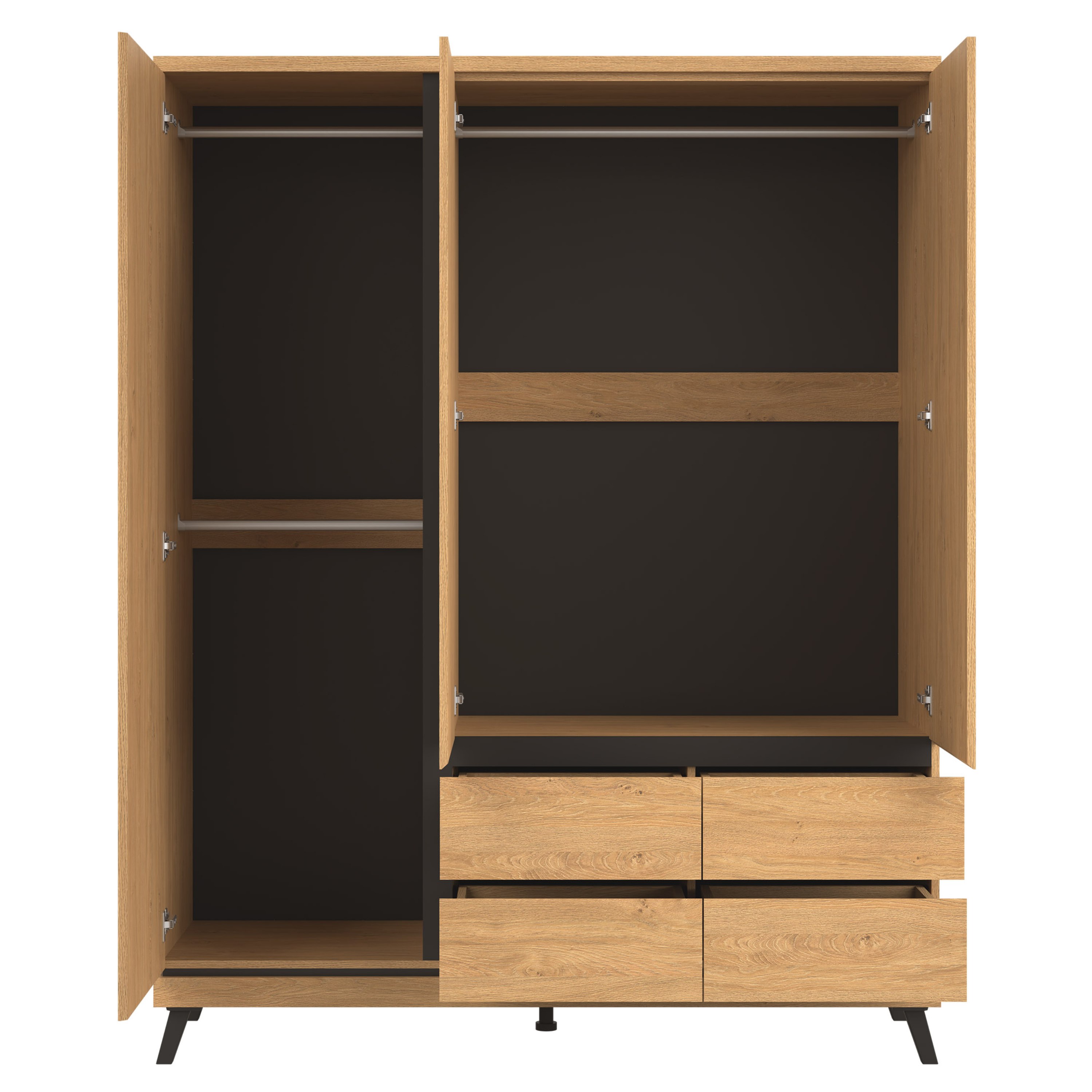 Skriňa je vybavená otočnými dvierkami, za ktorými sa nachádza jednoduché vnútorné vybavenie v podobe 3 šatníkových tyčí pre prehľadné zavesenie vašich obľúbených kúskov oblečenia. Na oddelenie drobnejšieho oblečenia a doplnkov môžete využiť ešte 4 priestranné zásuvky. Jednotlivé prvky sa otvárajú pomocou špeciálne profilovaných drážok na okraji predných plôch, čo umožňuje jednoduchú manipuláciu bez rušivých prvkov. Celkový vzhľad dotvárajú kónické nožičky. Skriňa je vyrobená z laminovanej drevotriesky s povrchom nenáročným na údržbu.