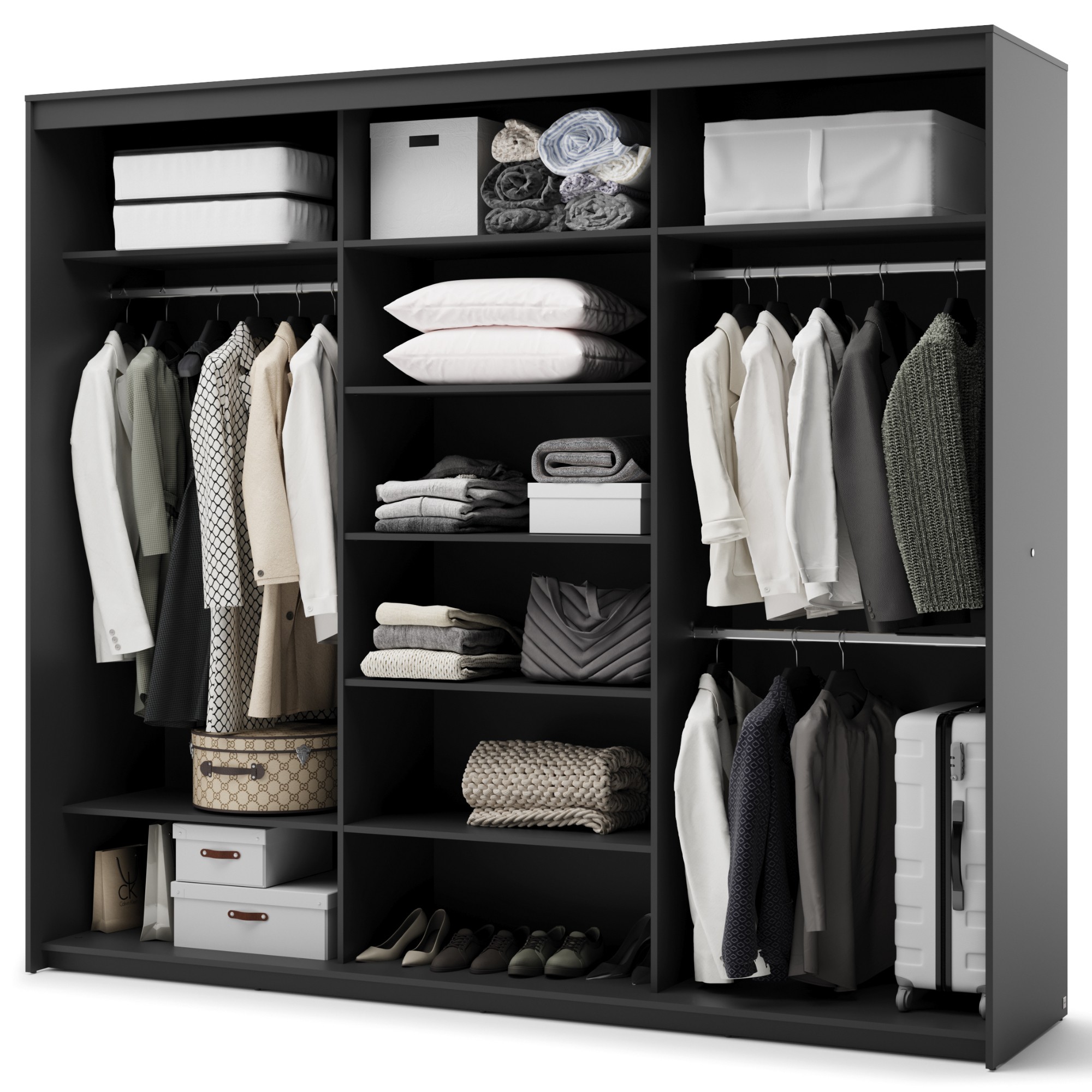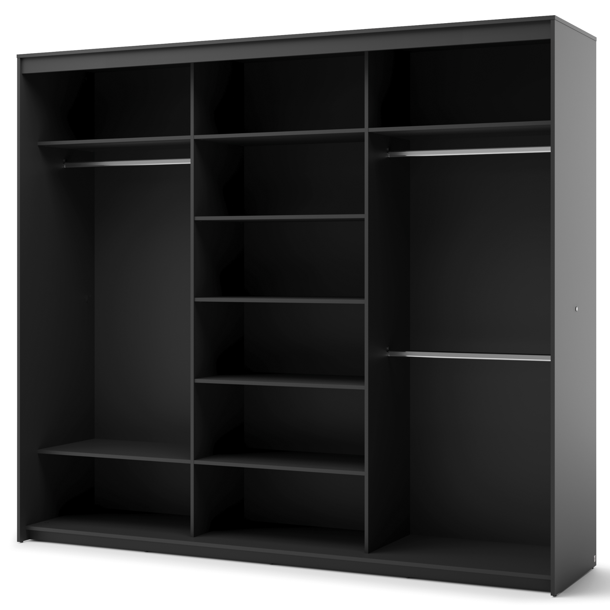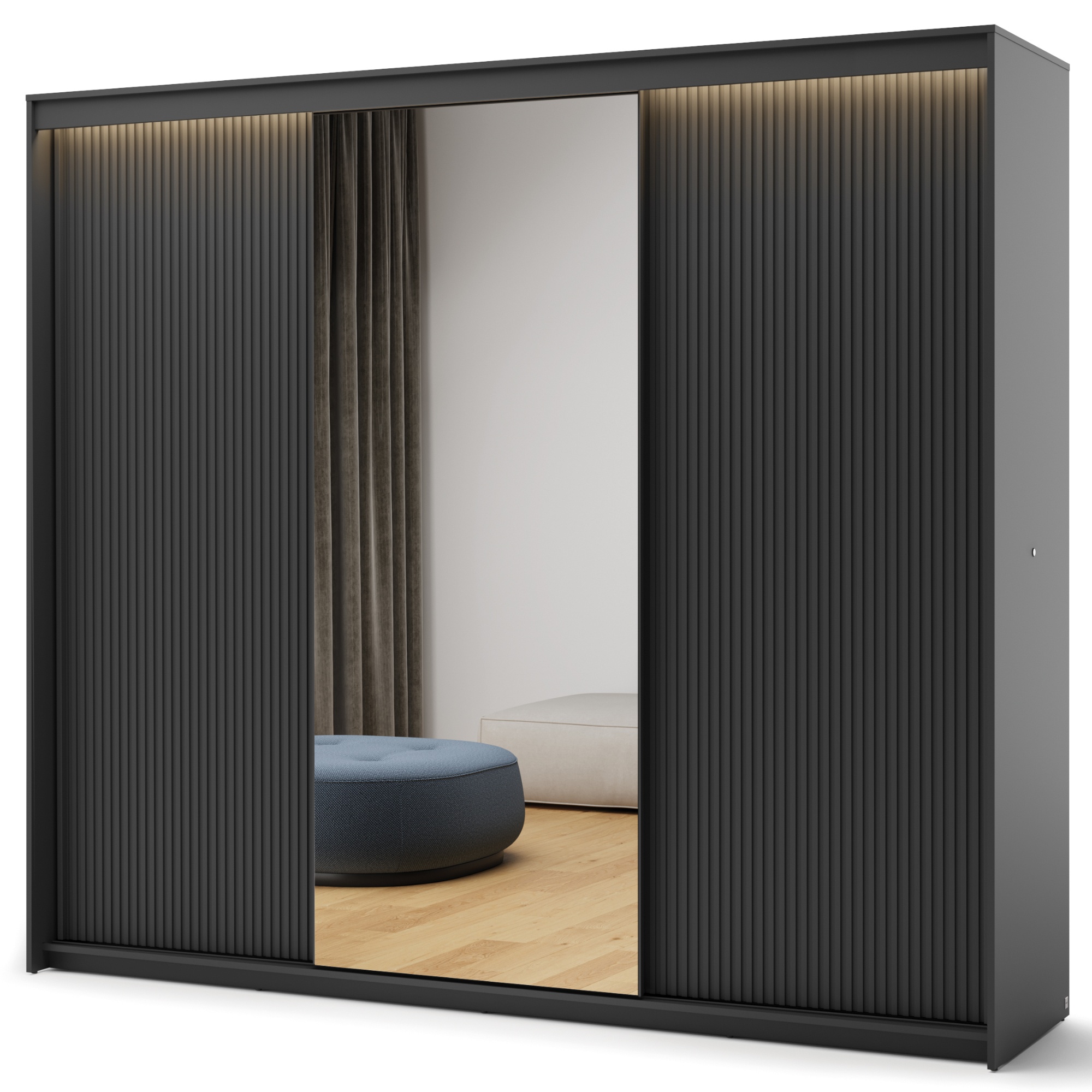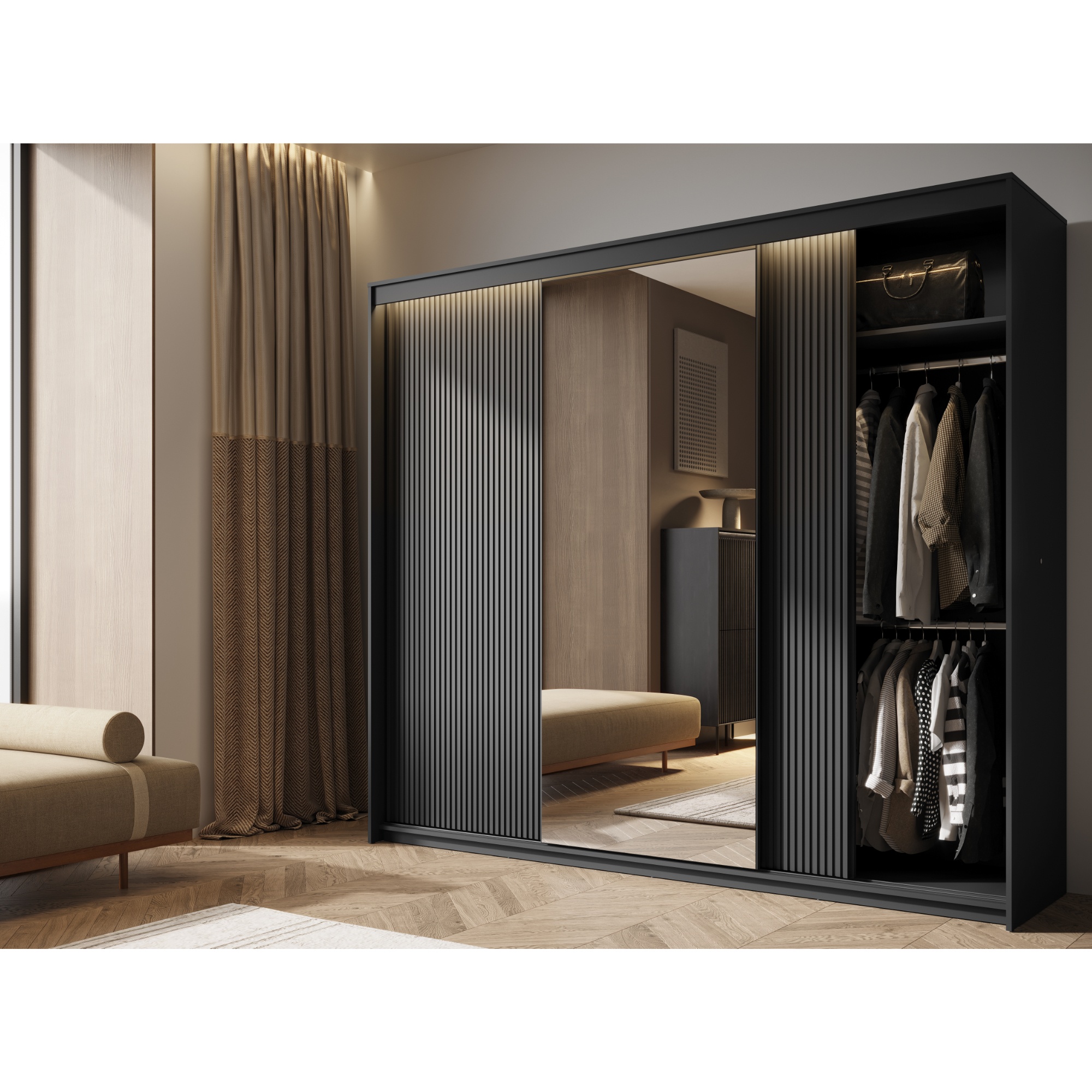Skriňa je uzatvárateľná pomocou 3 posuvných dverí, ktoré šetria cenné miesto zvonku aj vo vnútri skrine. Jedny z dverí sú vyplnené zrkadlom, zatiaľ čo predné plochy zvyšných dverí sú doplnené o dekoratívne frézovanie. Vnútorné vybavenie skrine pozostáva celkom z 8 vložených políc a 3 šatníkových tyčí na prehľadné uskladnenie vášho oblečenia a doplnkov. Skriňa je vyrobená z laminovanej drevotriesky, ktorá nevyžaduje náročnú údržbu. Dodávaná je vrátane LED osvetlenia.