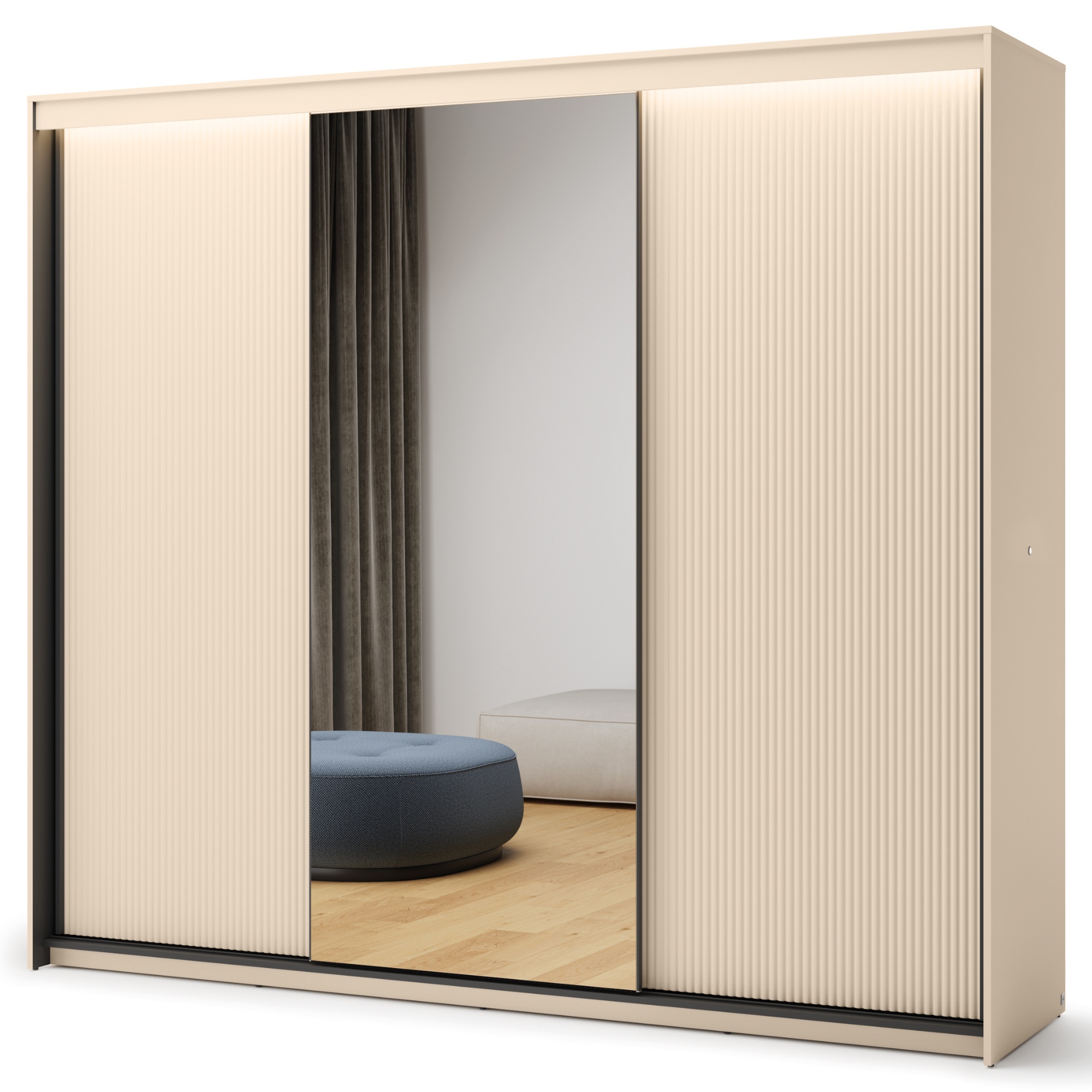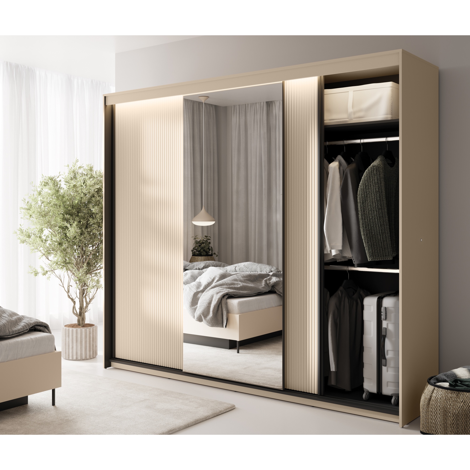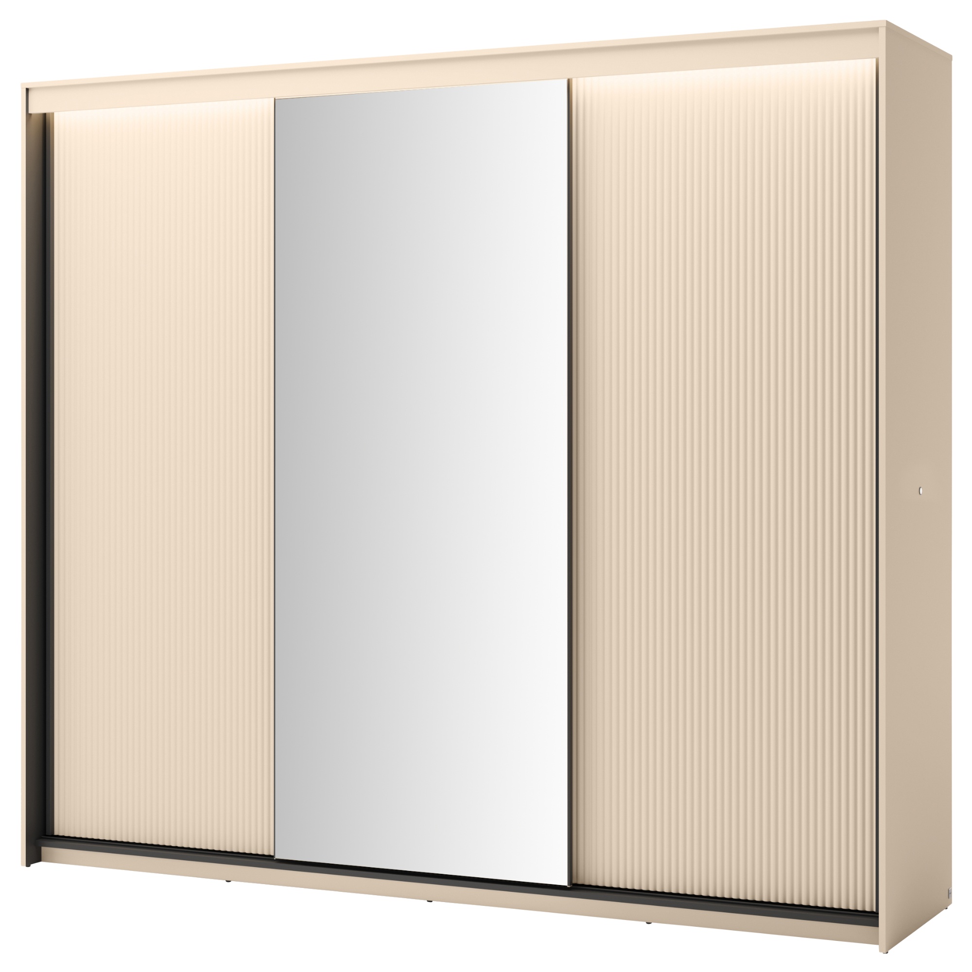 Skriňa je uzatvárateľná pomocou 3 posuvných dverí, ktoré šetria cenné miesto zvonku aj vo vnútri skrine. Jedny z dverí sú vyplnené zrkadlom, zatiaľ čo predné plochy zvyšných dverí sú doplnené o dekoratívne frézovanie. Vnútorné vybavenie skrine pozostáva celkom z 8 vložených políc a 3 šatníkových tyčí na prehľadné uskladnenie vášho oblečenia a doplnkov. Skriňa je vyrobená z laminovanej drevotriesky, ktorá nevyžaduje náročnú údržbu. Dodávaná je vrátane LED osvetlenia.