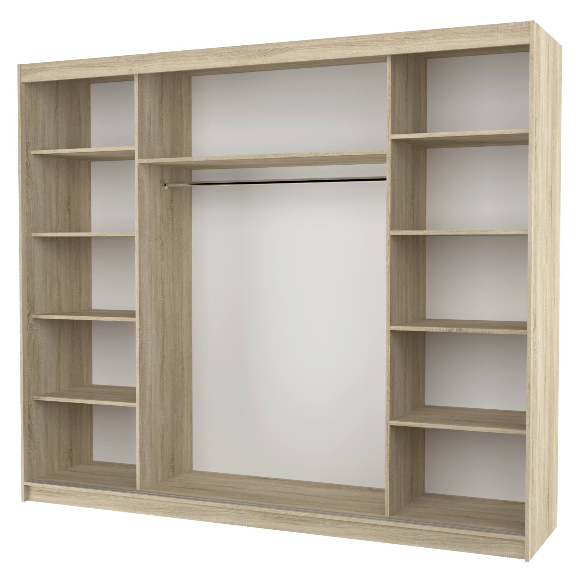 Disponuje posuvnými dverami s hliníkovými vodiacimi lištami pre plynulé a pohodlné otváranie. Dvere skrine sú doplnené veľkou zrkadlovou plochou, ktorá uľahčí vaše prípravy počas ranného zhonu a zároveň opticky zväčší priestor. Zároveň odráža viac svetla do miestnosti, čím pôsobí interiér svetlejšie.