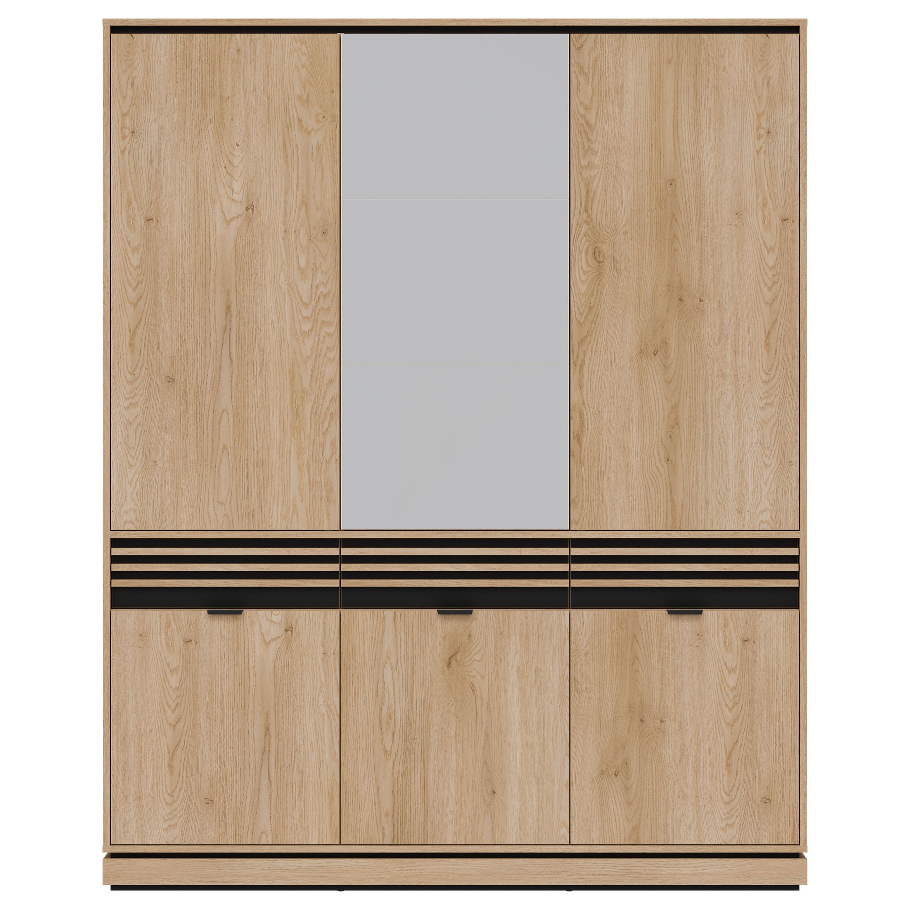 Skriňa je vybavená celkom 6 otočnými dverami, pričom horná trojica je vyhotovená v čistom bezúchytkovom prevedení, zatiaľ čo spodné dvere sú osadené praktickými kovovými úchytkami. Súčasťou jedných dverí je zrkadlo, ktoré nielenže opticky zväčšuje priestor, ale zároveň vnáša do miestnosti ďalší praktický prvok. Jednoducho riešené vnútorné vybavenie pozostáva z 2 šatníkových tyčí a 6 úložných priehradiek. Skriňa tak ponúka dostatok miesta na zavesenie väčších, krčivých kúskov aj na usporiadanie menších predmetov a doplnkov. Tieto jednoduché prvky dopĺňajú ešte 3 zásuvky uprostred konštrukcie. Skriňa je vyrobená z laminovanej drevotriesky a doplnená o plastové klzáky, ktoré chránia vašu podlahu.