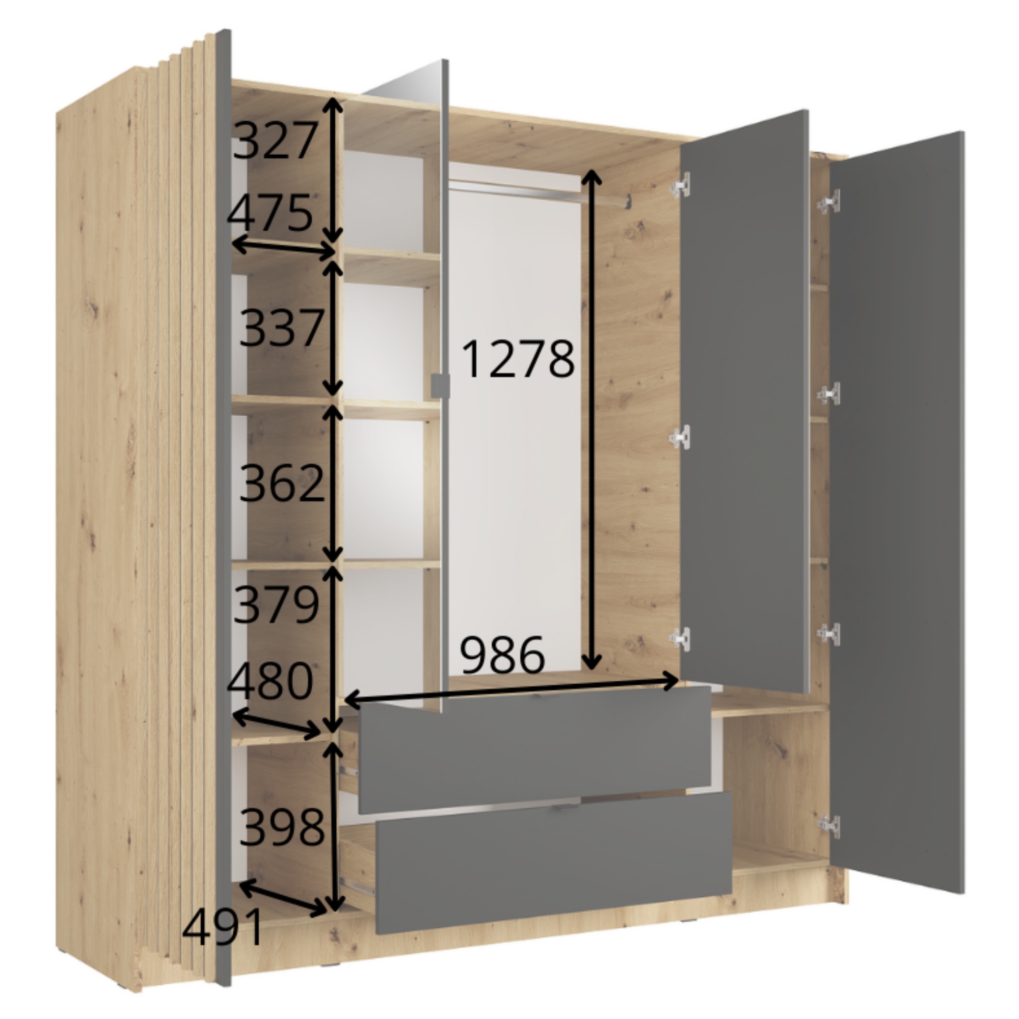 Vo vnútri nájdete bohatý úložný priestor na prehľadnú organizáciu vášho oblečenia. Skriňa je rozdelená na 3 časti. Hlavná časť skrine je vybavená 1 šatníkovou tyčou, ukrytou za otočnými zrkadlovými dverami, ktoré uľahčia vaše prípravy počas ranného zhonu a zároveň opticky zväčšia priestor. Pod nimi sa nachádzajú 2 priestranné zásuvky. Pravá aj ľavá časť je vybavená 4 policami, celkovo teda máte k dispozícii 8 políc.