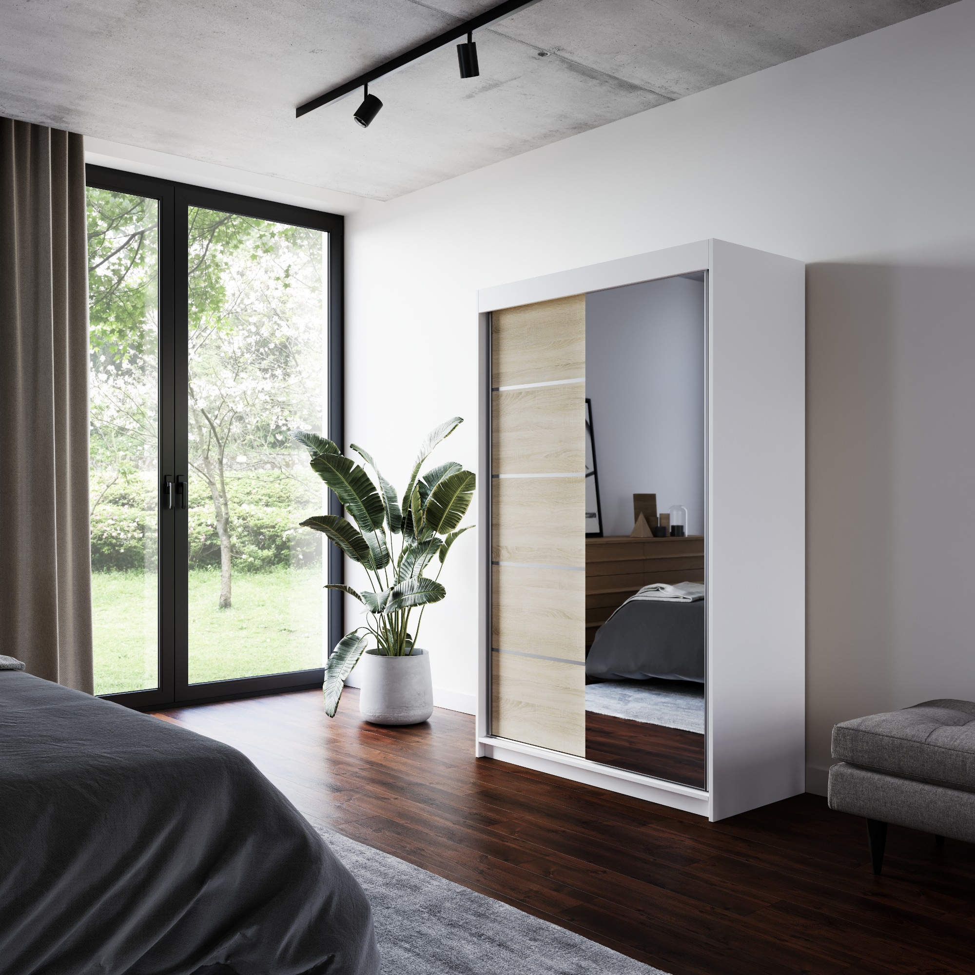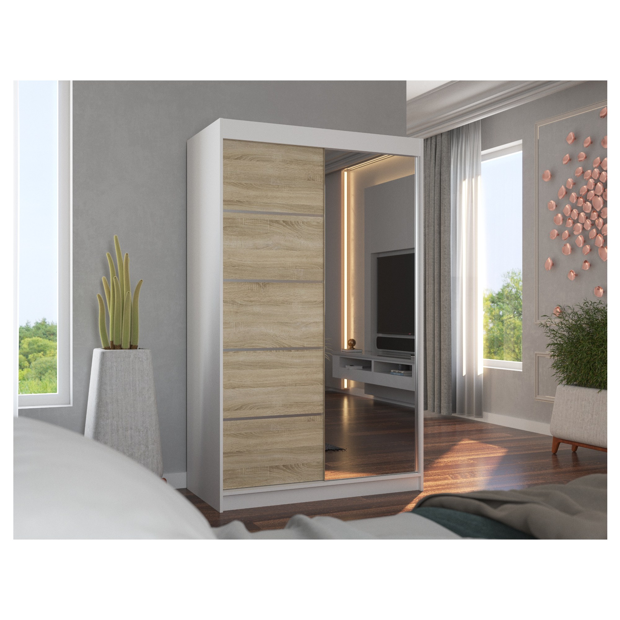 Disponuje posuvnými dverami s hliníkovými vodiacimi lištami pre pohodlné otváranie, ktoré zároveň šetria miesto a sú tak ideálnou voľbou do menších miestností. Pravé dvere skrine sú doplnené zrkadlom, ktoré uľahčí vaše prípravy počas ranného zhonu a zároveň opticky zväčší priestor.