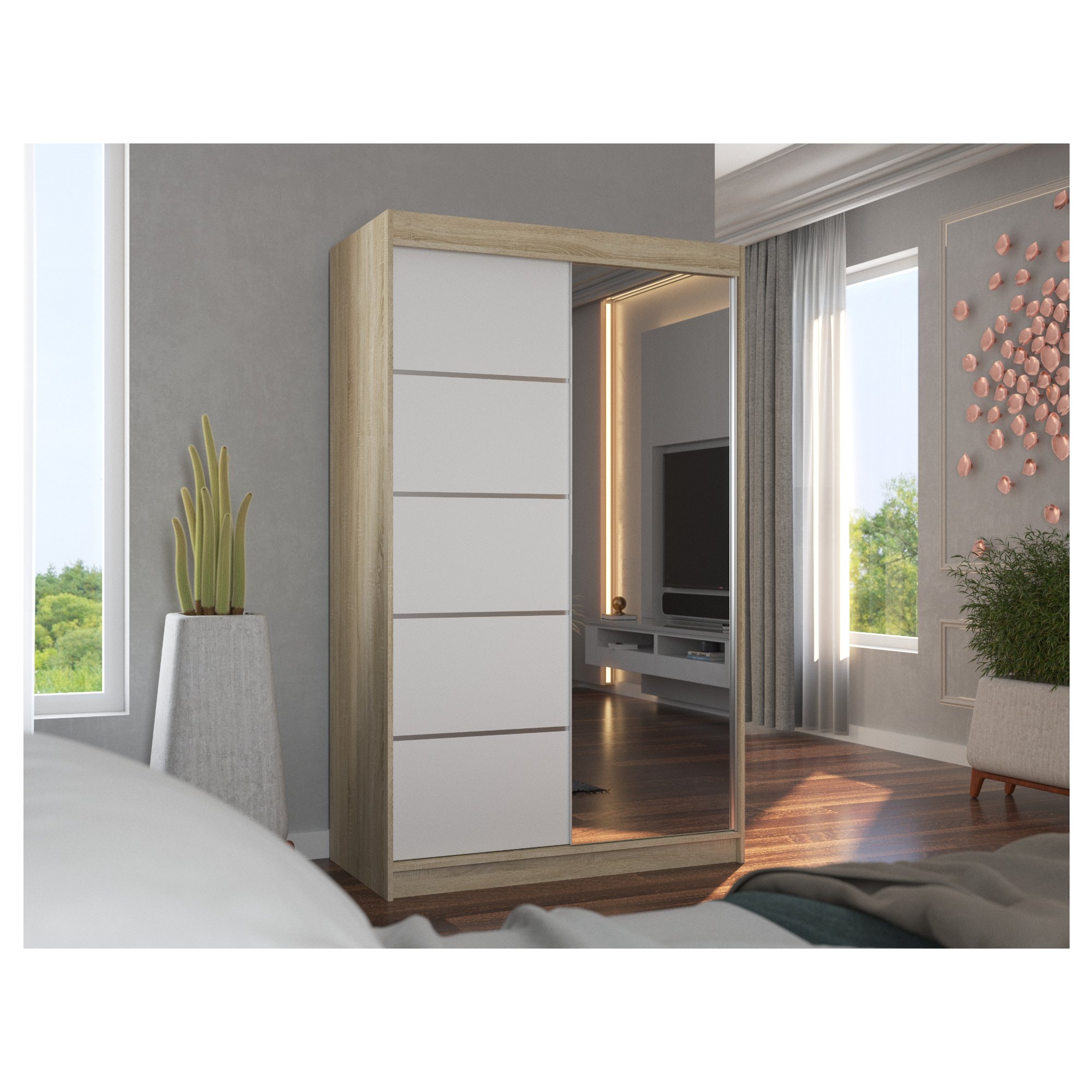 Disponuje posuvnými dverami s hliníkovými vodiacimi lištami pre pohodlné otváranie, ktoré zároveň šetria miesto a sú tak ideálnou voľbou do menších miestností. Pravé dvere skrine sú doplnené zrkadlom, ktoré uľahčí vaše prípravy počas ranného zhonu a zároveň opticky zväčší priestor.