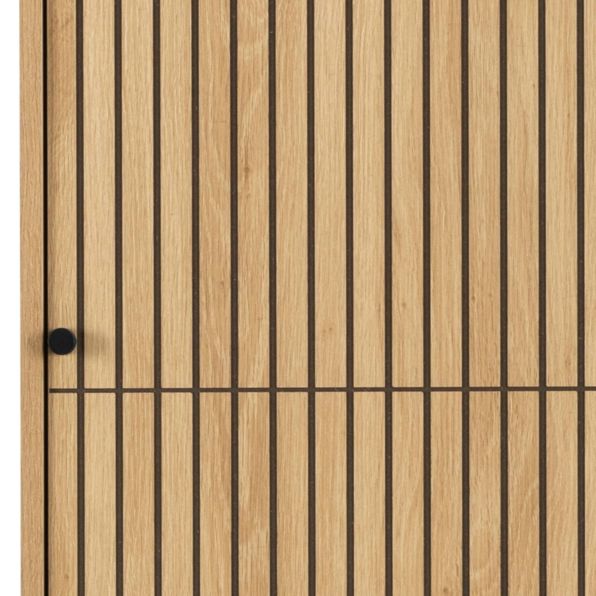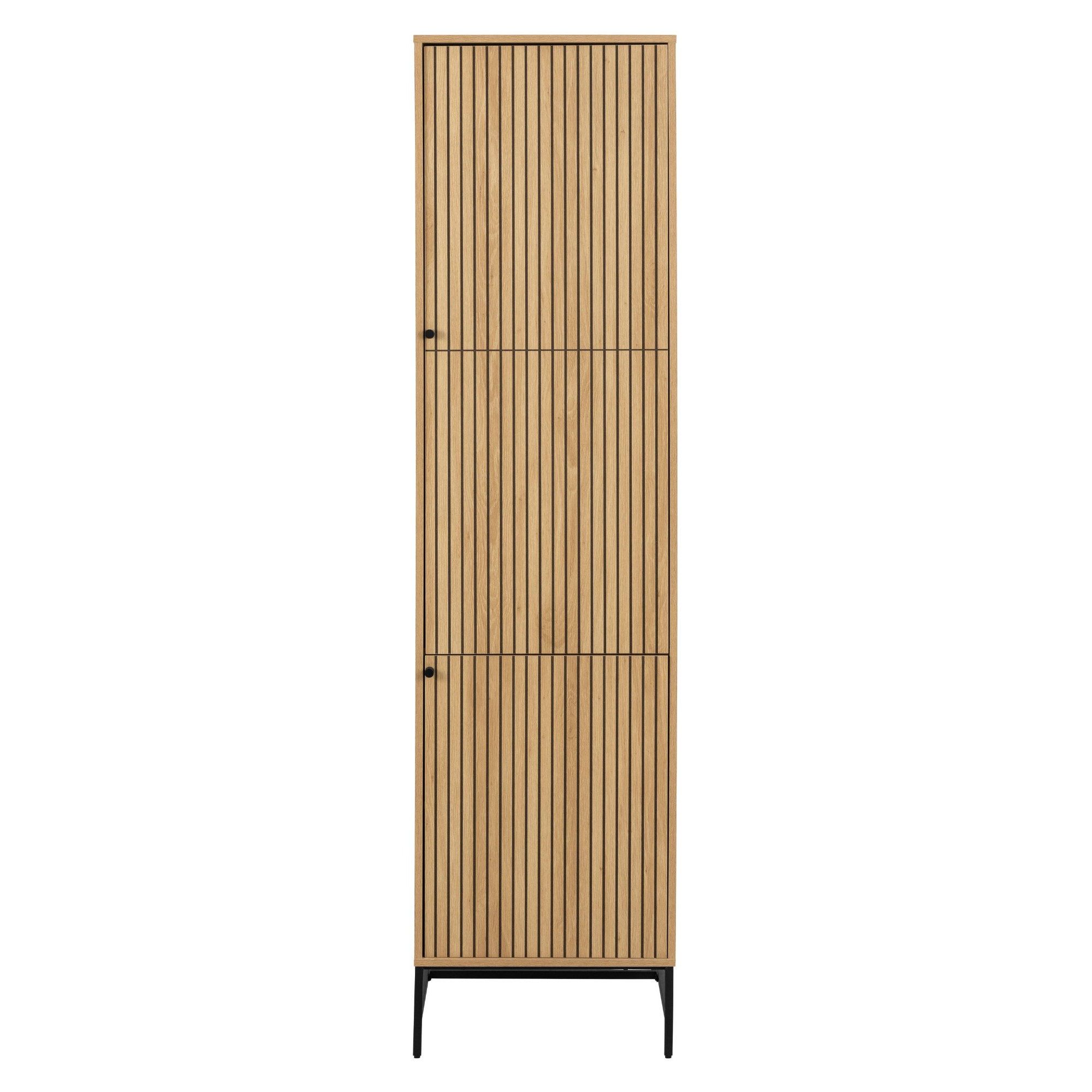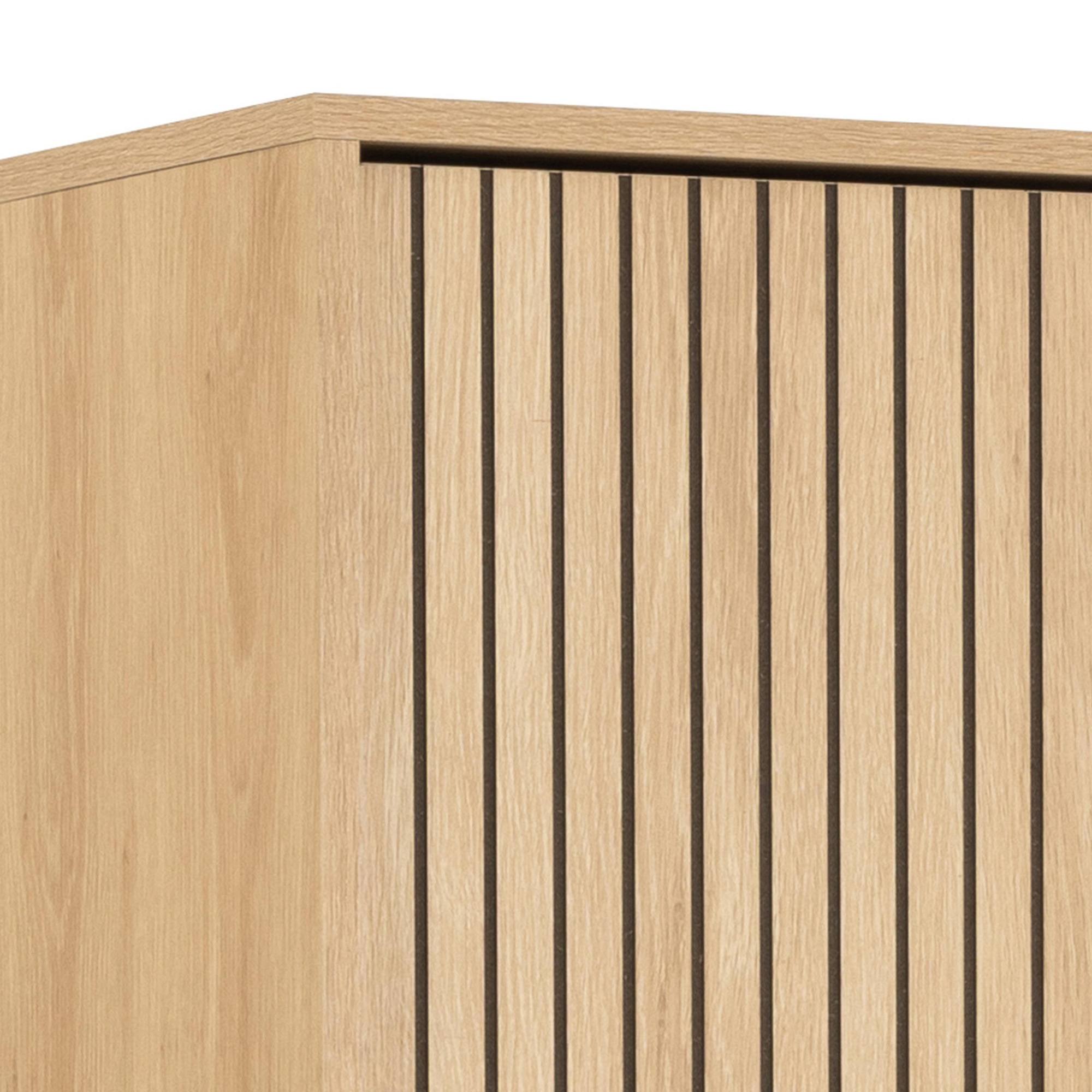 Korpus tejto skrine je vyrobený z drevovláknitej dosky MDF. Jej dvierka zdobia štýlové lamely. Pevné nohy a rúčky uľahčujúce manipuláciu s dvierkami sú z kovu.