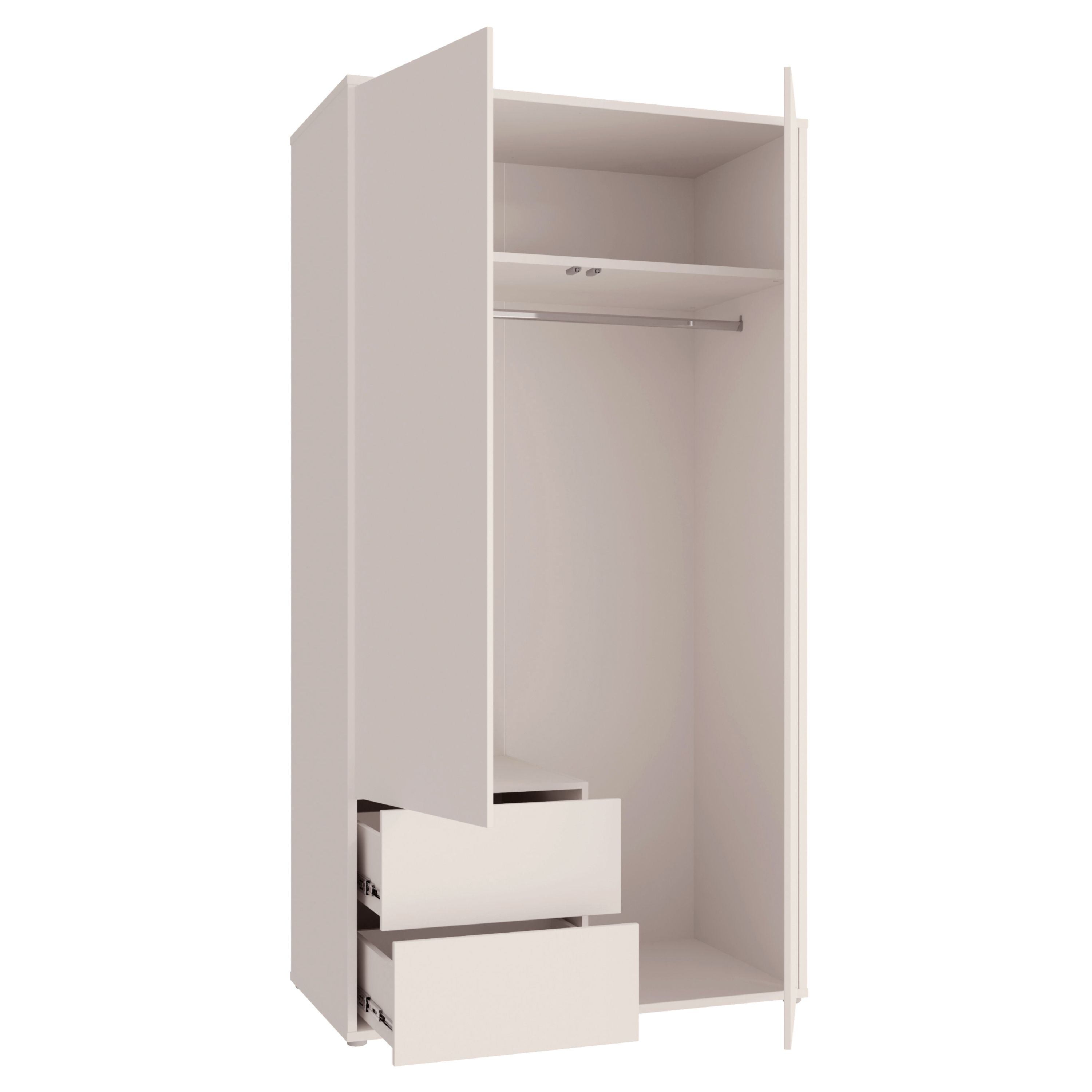 Skriňu uzatvárajú klasické otočné dvere, za ktorými sa nachádza široká šatníková tyč doplnená o priestrannú vloženú policu nad ňou. Toto usporiadanie umožňuje prehľadné uloženie zaveseného oblečenia aj zložených vecí a doplnkov. Na ľavej strane sa navyše nachádzajú 2 zásuvky, ktoré poskytujú ideálne miesto na uloženie menších kúskov oblečenia alebo doplnkov. Dvere a zásuvky sú vybavené systémom push to open, ktorý umožňuje jednoduché otváranie bez použitia úchytiek a podčiarkuje čistý minimalistický vzhľad.