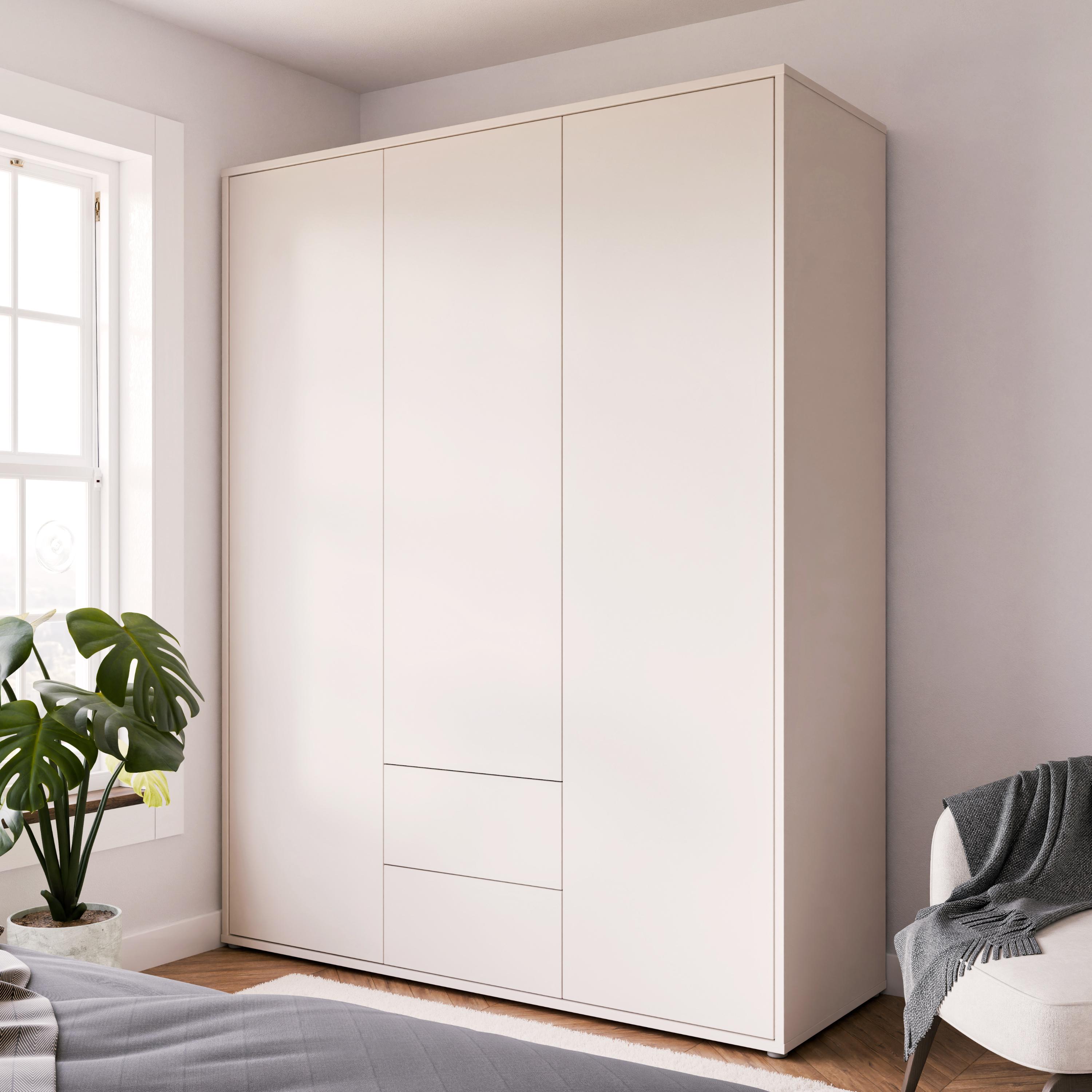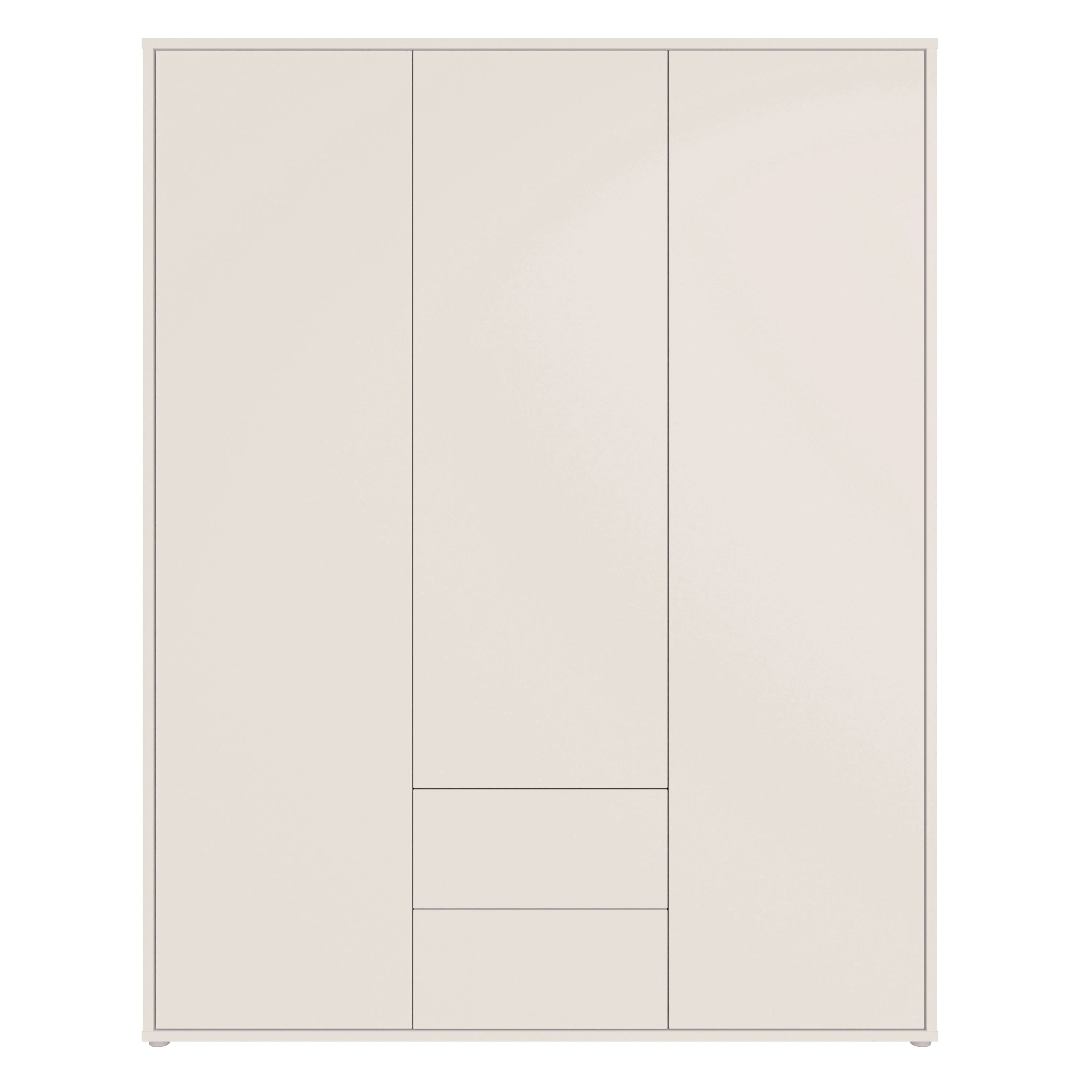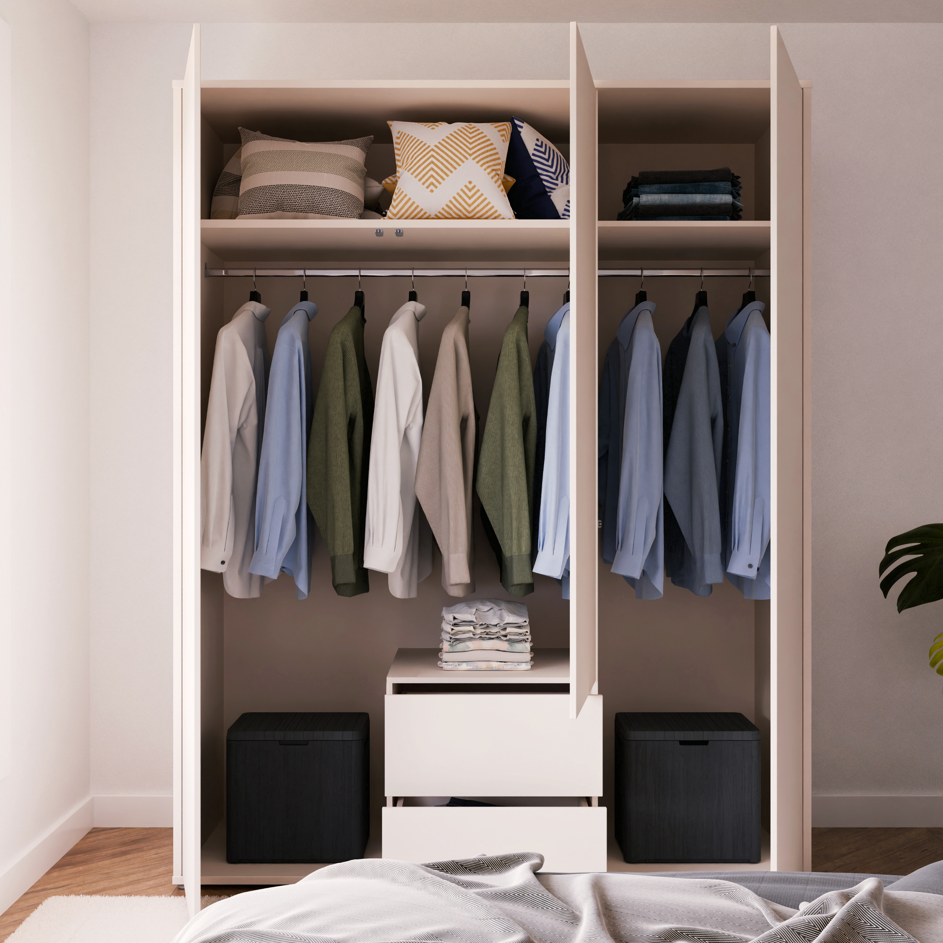 Vnútorný priestor je rozdelený na 2 časti. Za párom dverí sa nachádza široká šatníková tyč a priestranná polica, zatiaľ čo za samostatnými dverami je k dispozícii ďalšia šatníková tyč doplnená o vloženú policu. Toto usporiadanie umožňuje prehľadné uloženie zaveseného oblečenia aj zložených vecí a doplnkov. V spodnej časti sa navyše nachádzajú 2 zásuvky, ktoré poskytujú ideálne miesto na uloženie menších kúskov oblečenia alebo doplnkov. Dvere a zásuvky sú vybavené systémom push to open, ktorý umožňuje jednoduché otváranie bez použitia úchytiek a podčiarkuje čistý minimalistický vzhľad.