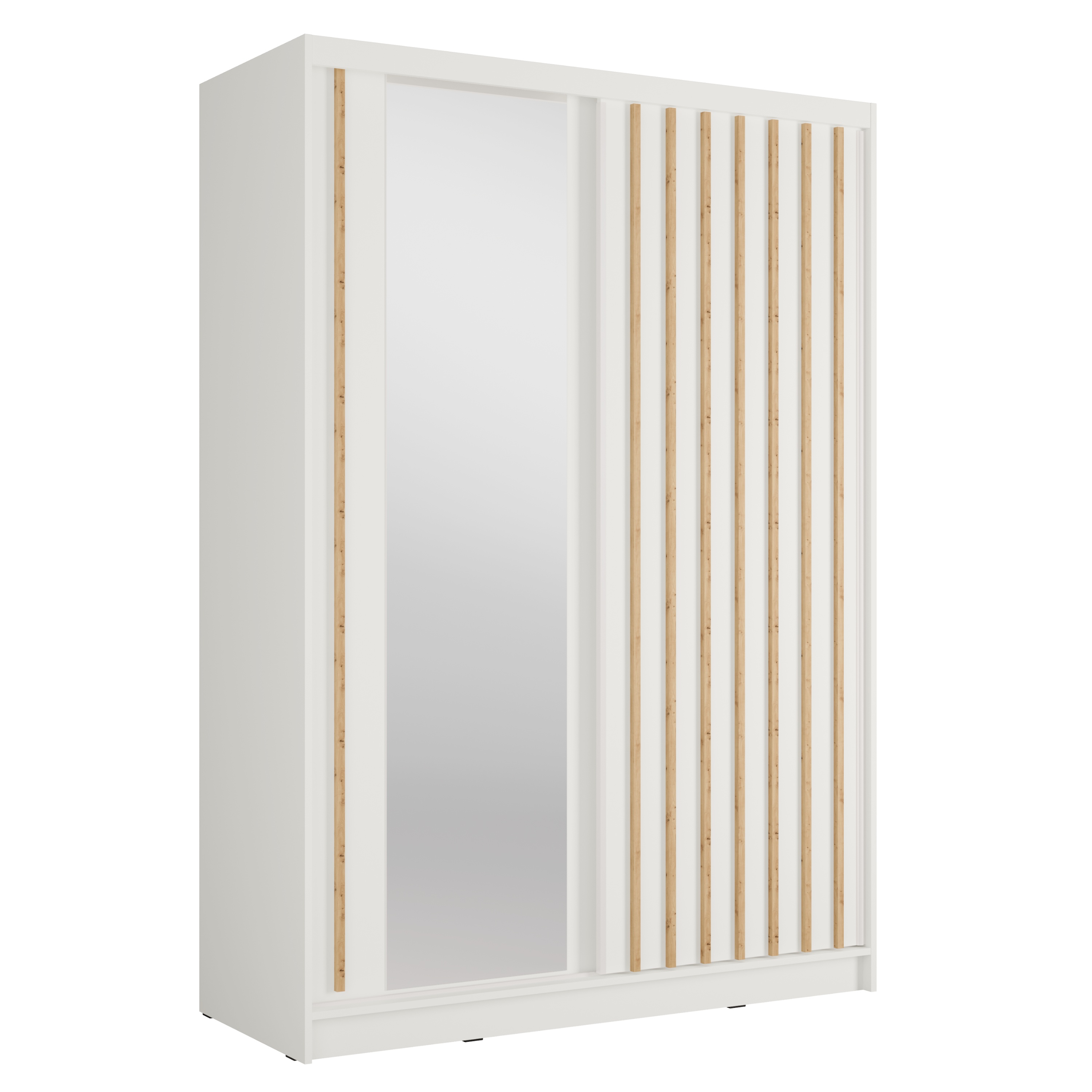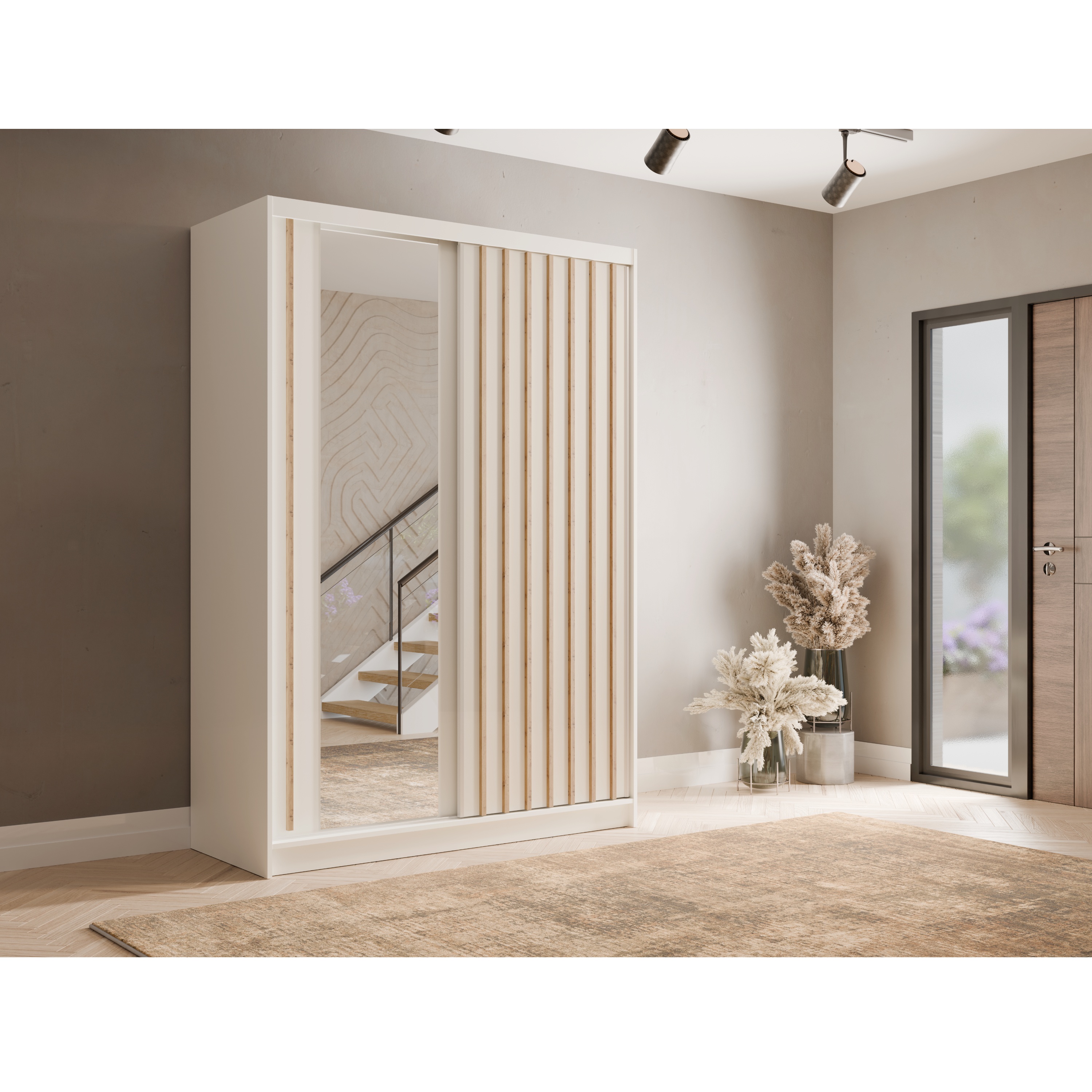 Moderná šatníková skriňa ALUNA I ideálne prepája moderný dizajn s praktickosťou. Jej neutrálne farebné prevedenie v kombinácii s dekoratívnymi lamelami v prírodnom odtieni vytvára zaujímavý kontrast, ktorý upúta na prvý pohľad.