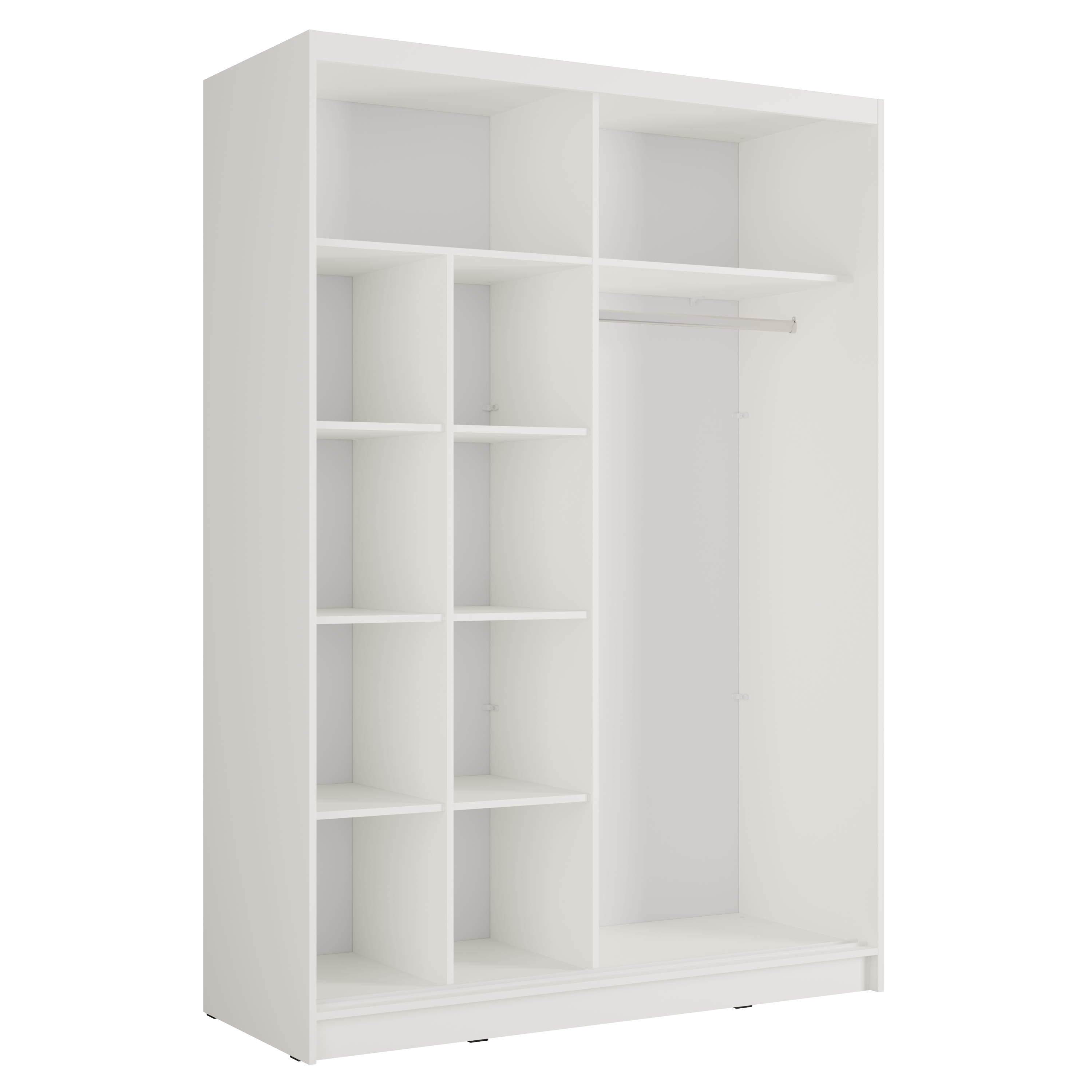 Vnútorný priestor je vybavený šatníkovou tyčou, ktorú využijete na zavesenie veľkých alebo krčivých kúskov oblečenia. Skriňa ďalej obsahuje celkovo 8 políc, ktoré spoločne vytvárajú veľký a prakticky rozdelený úložný priestor. Skriňu uzatvára pár posuvných dverí, z ktorých jedny sú doplnené o zrkadlo, vďaka ktorému si môžete kedykoľvek upraviť svoj vzhľad. Konštrukcia skrine je vyrobená z laminovaného dreveného materiálu s povrchom nenáročným na údržbu.