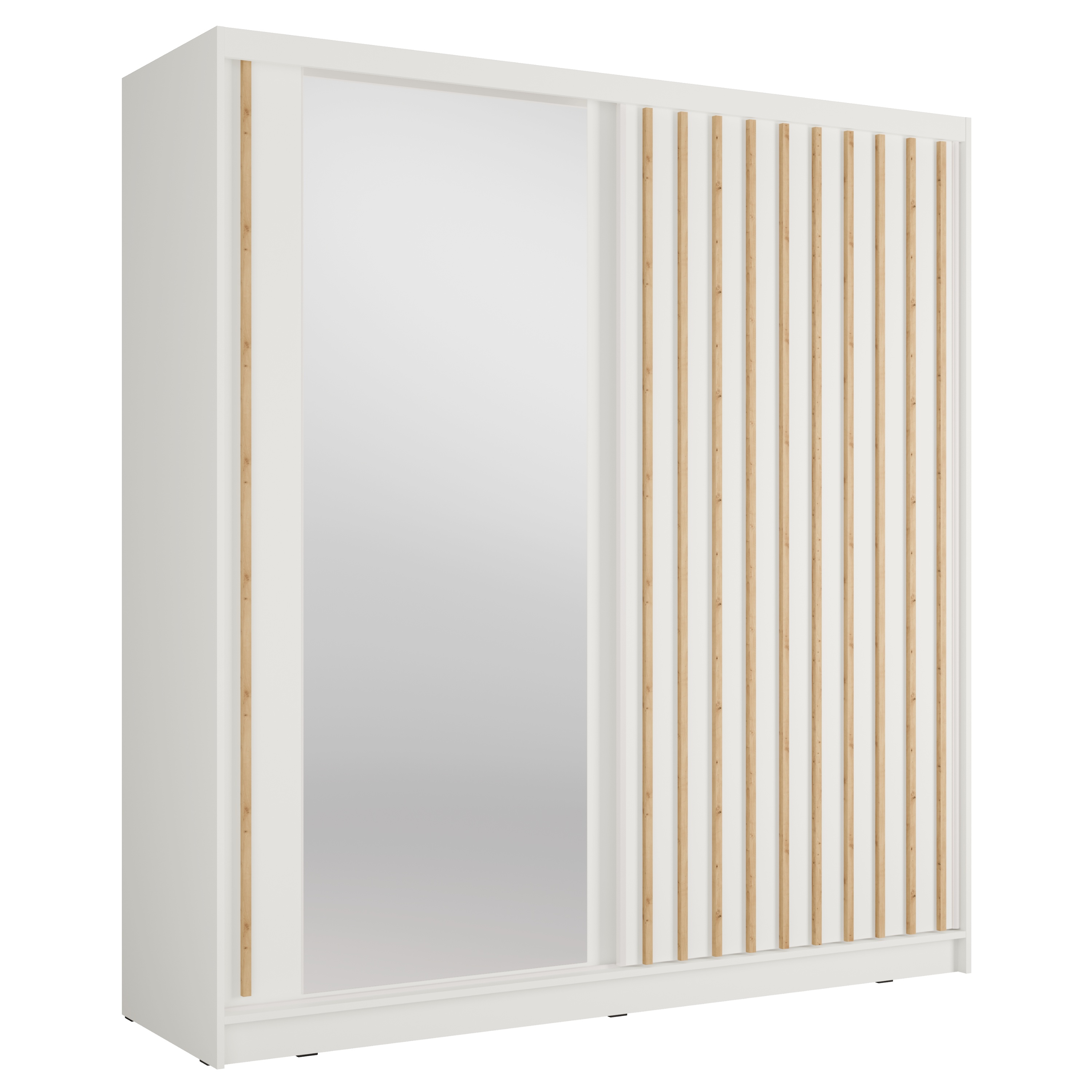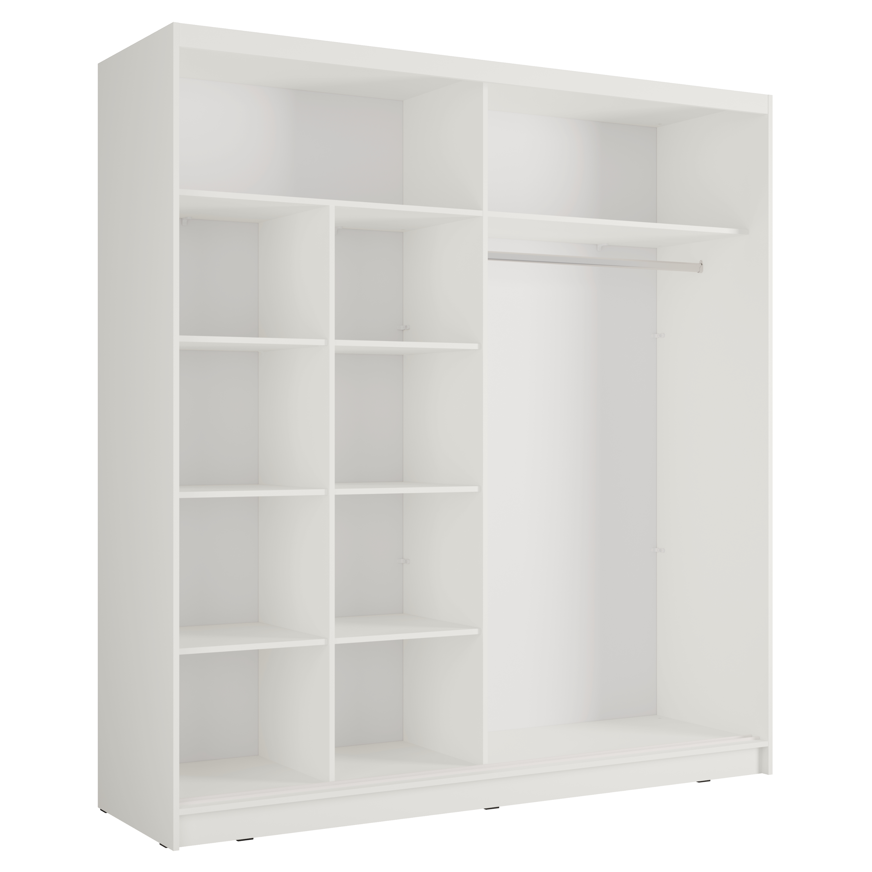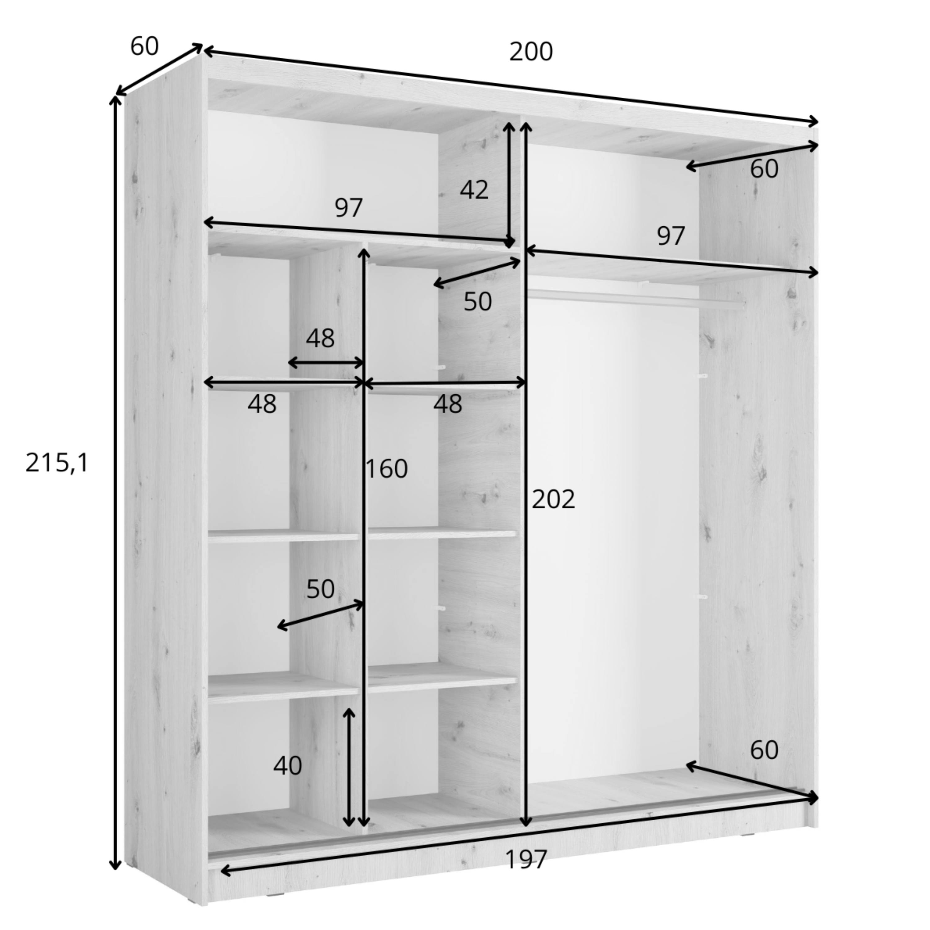 Vnútorný priestor je vybavený šatníkovou tyčou, ktorú využijete na zavesenie veľkých alebo krčivých kúskov oblečenia. Skriňa ďalej obsahuje celkovo 8 políc, ktoré spoločne vytvárajú veľký a prakticky rozdelený úložný priestor. Skriňu uzatvára pár posuvných dverí, z ktorých jedny sú doplnené o zrkadlo, vďaka ktorému si môžete kedykoľvek upraviť svoj vzhľad. Konštrukcia skrine je vyrobená z laminovaného dreveného materiálu s povrchom nenáročným na údržbu.