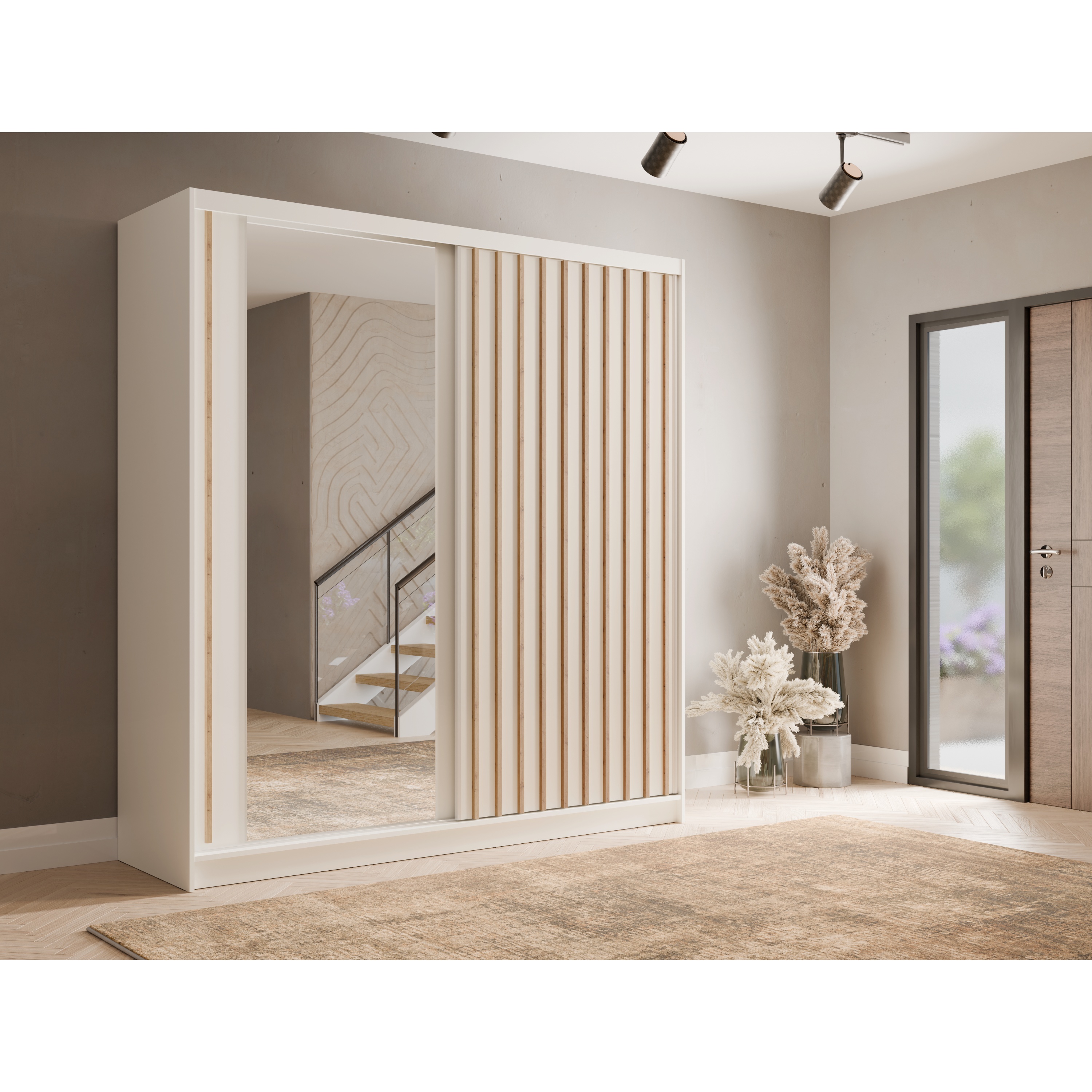 Moderná šatníková skriňa ALUNA I ideálne prepája moderný dizajn s praktickosťou. Jej neutrálne farebné prevedenie v kombinácii s dekoratívnymi lamelami v prírodnom odtieni vytvára zaujímavý kontrast, ktorý upúta na prvý pohľad.