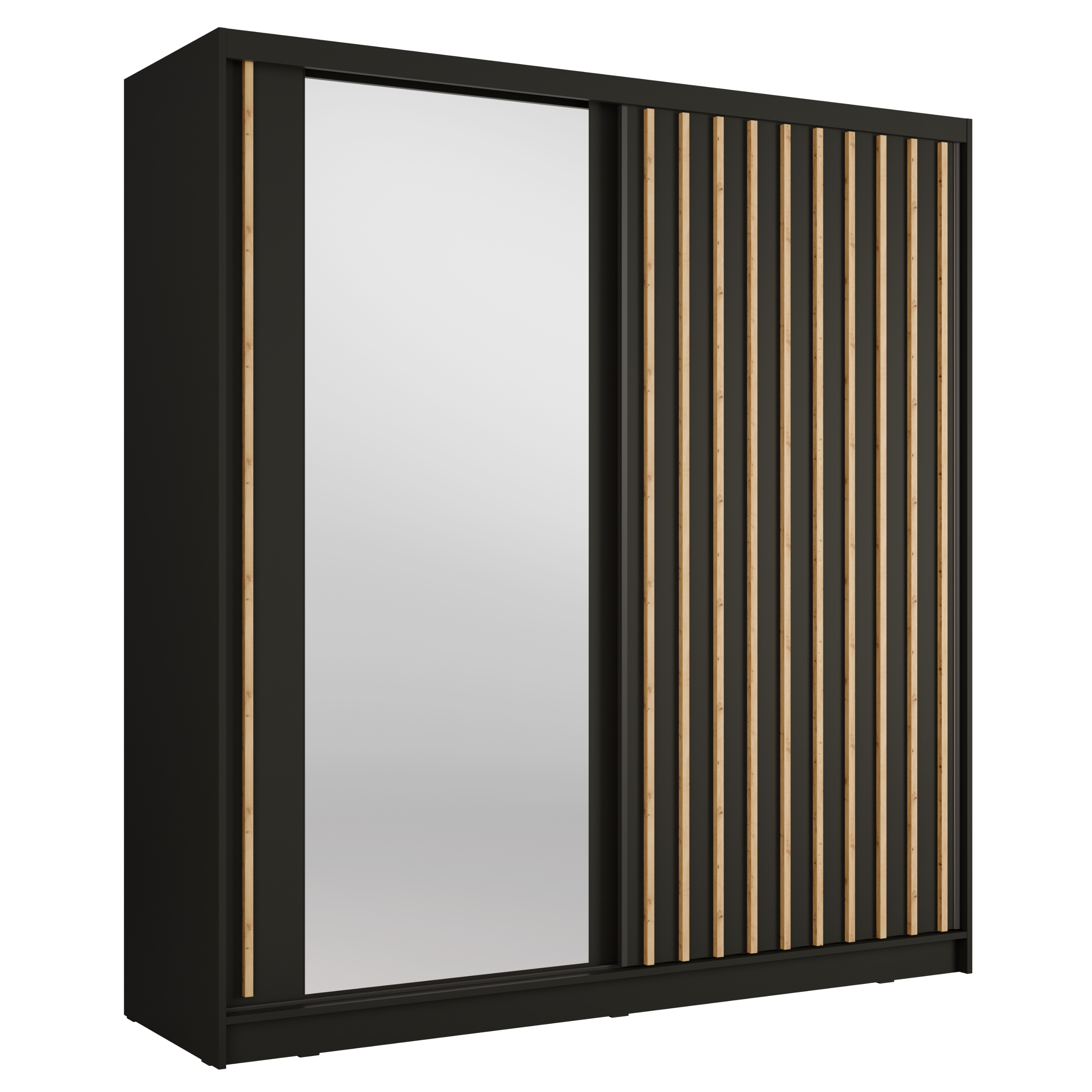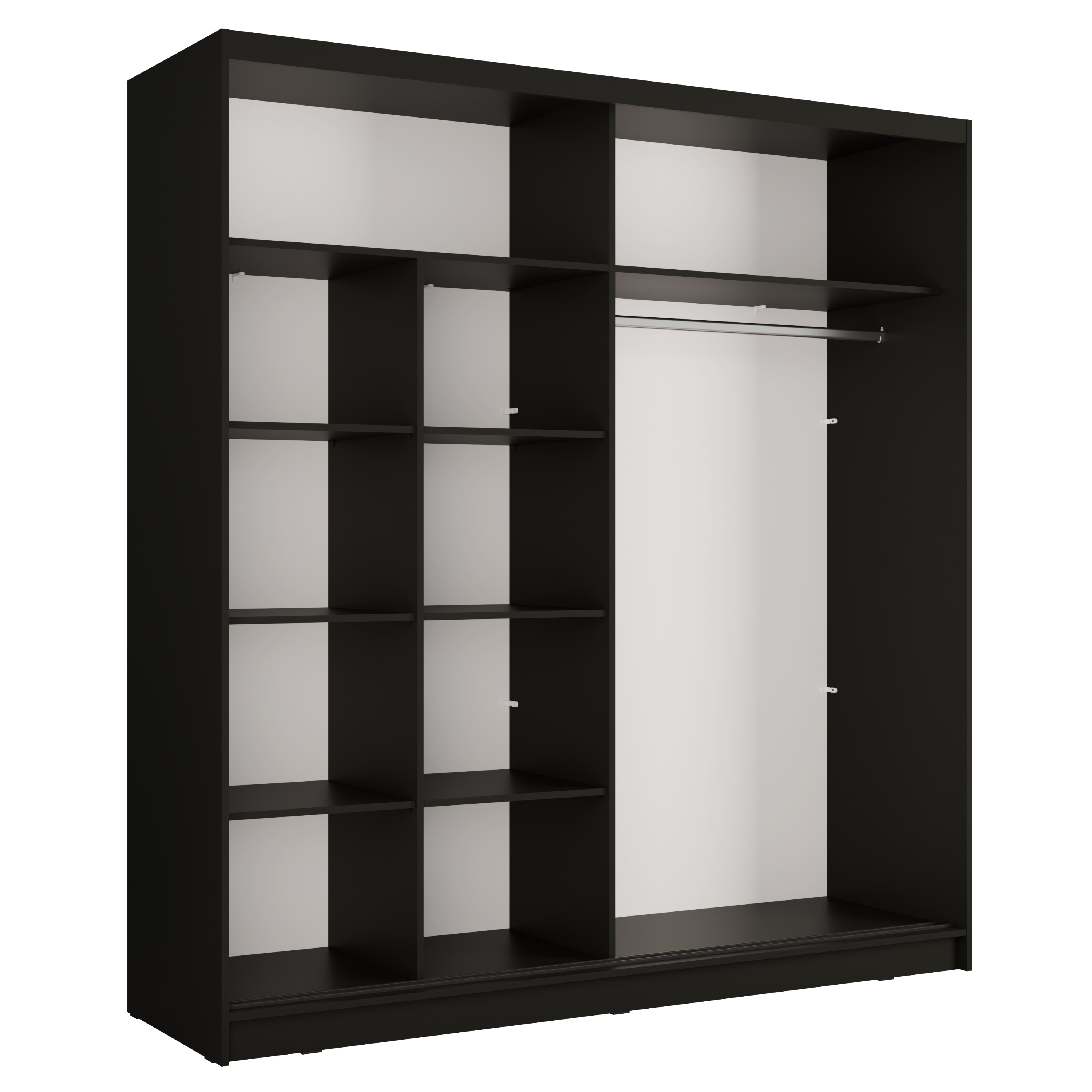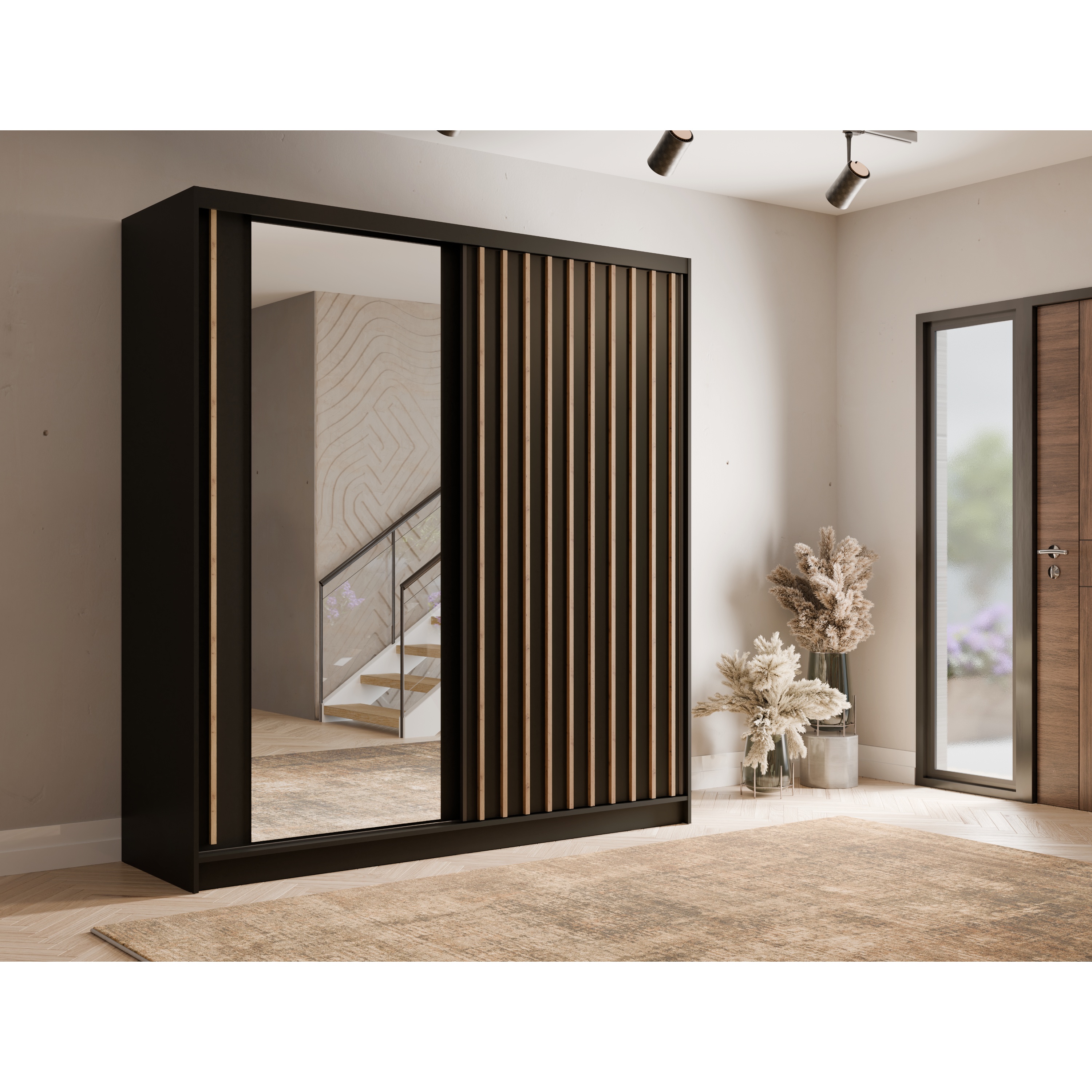 Vnútorný priestor je vybavený šatníkovou tyčou, ktorú využijete na zavesenie veľkých alebo krčivých kúskov oblečenia. Skriňa ďalej obsahuje celkovo 8 políc, ktoré spoločne vytvárajú veľký a prakticky rozdelený úložný priestor. Skriňu uzatvára pár posuvných dverí, z ktorých jedny sú doplnené o zrkadlo, vďaka ktorému si môžete kedykoľvek upraviť svoj vzhľad. Konštrukcia skrine je vyrobená z laminovaného dreveného materiálu s povrchom nenáročným na údržbu.