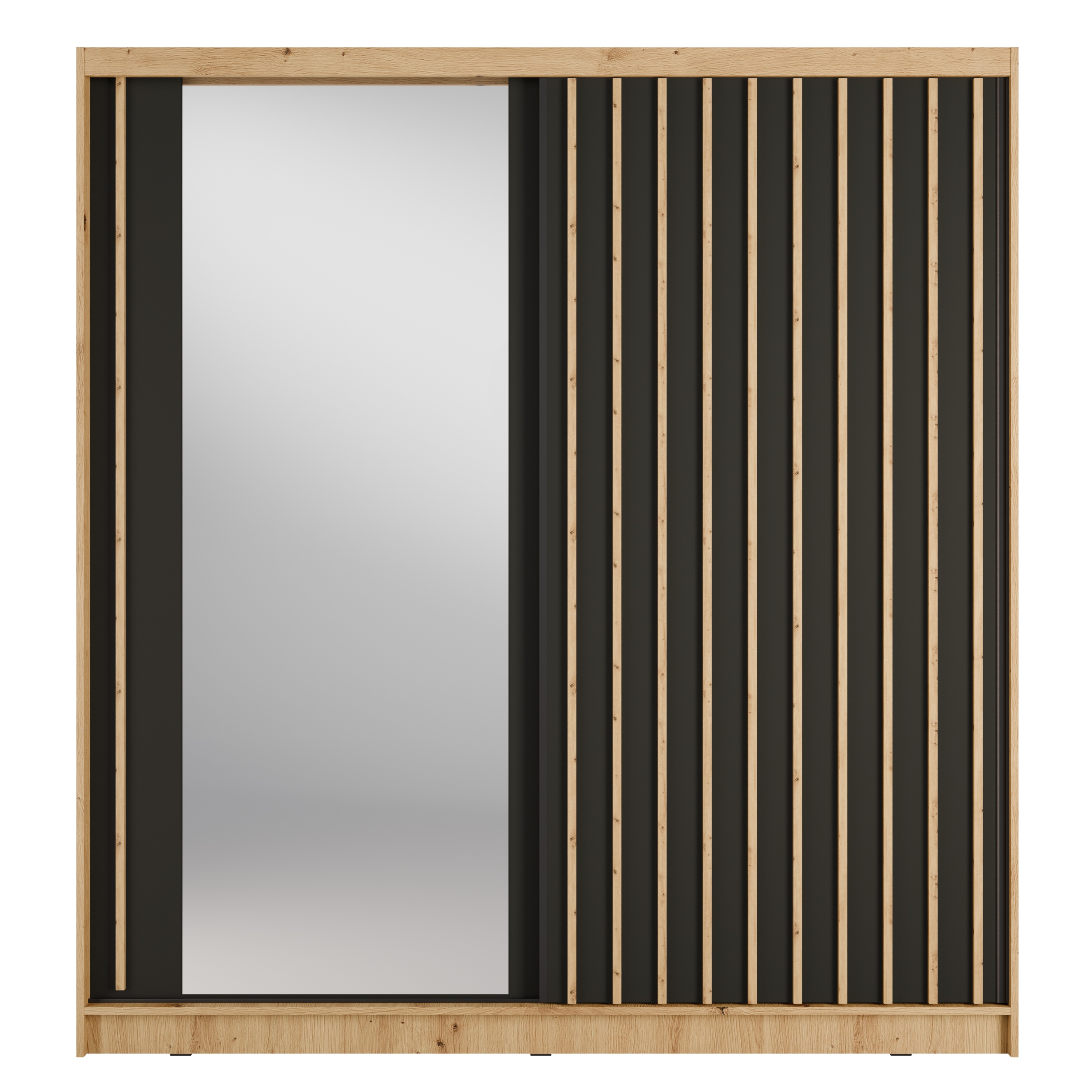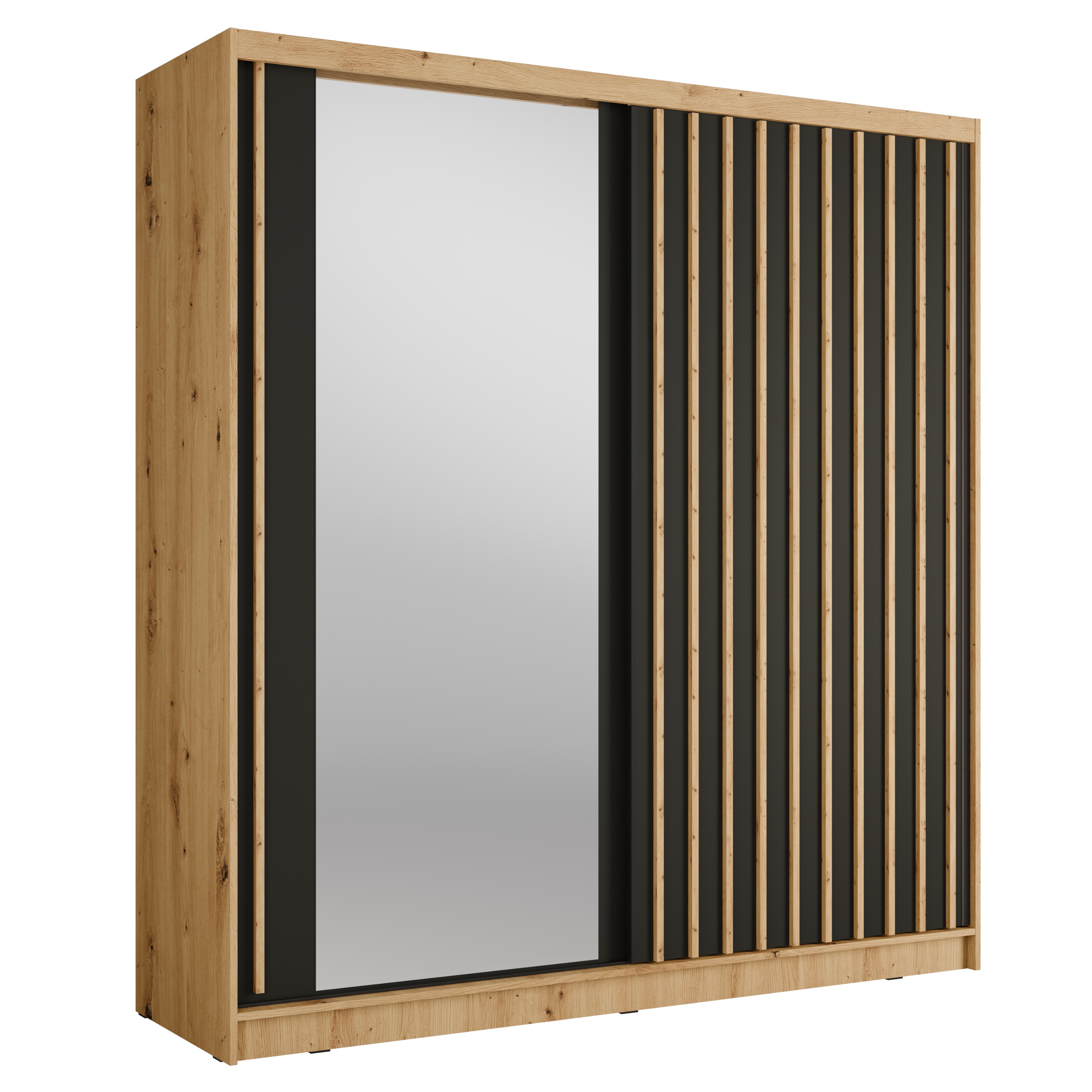 Vnútorný priestor je vybavený šatníkovou tyčou, ktorú využijete na zavesenie veľkých alebo krčivých kúskov oblečenia. Skriňa ďalej obsahuje celkovo 8 políc, ktoré spoločne vytvárajú veľký a prakticky rozdelený úložný priestor. Skriňu uzatvára pár posuvných dverí, z ktorých jedny sú doplnené o zrkadlo, vďaka ktorému si môžete kedykoľvek upraviť svoj vzhľad. Konštrukcia skrine je vyrobená z laminovaného dreveného materiálu s povrchom nenáročným na údržbu.