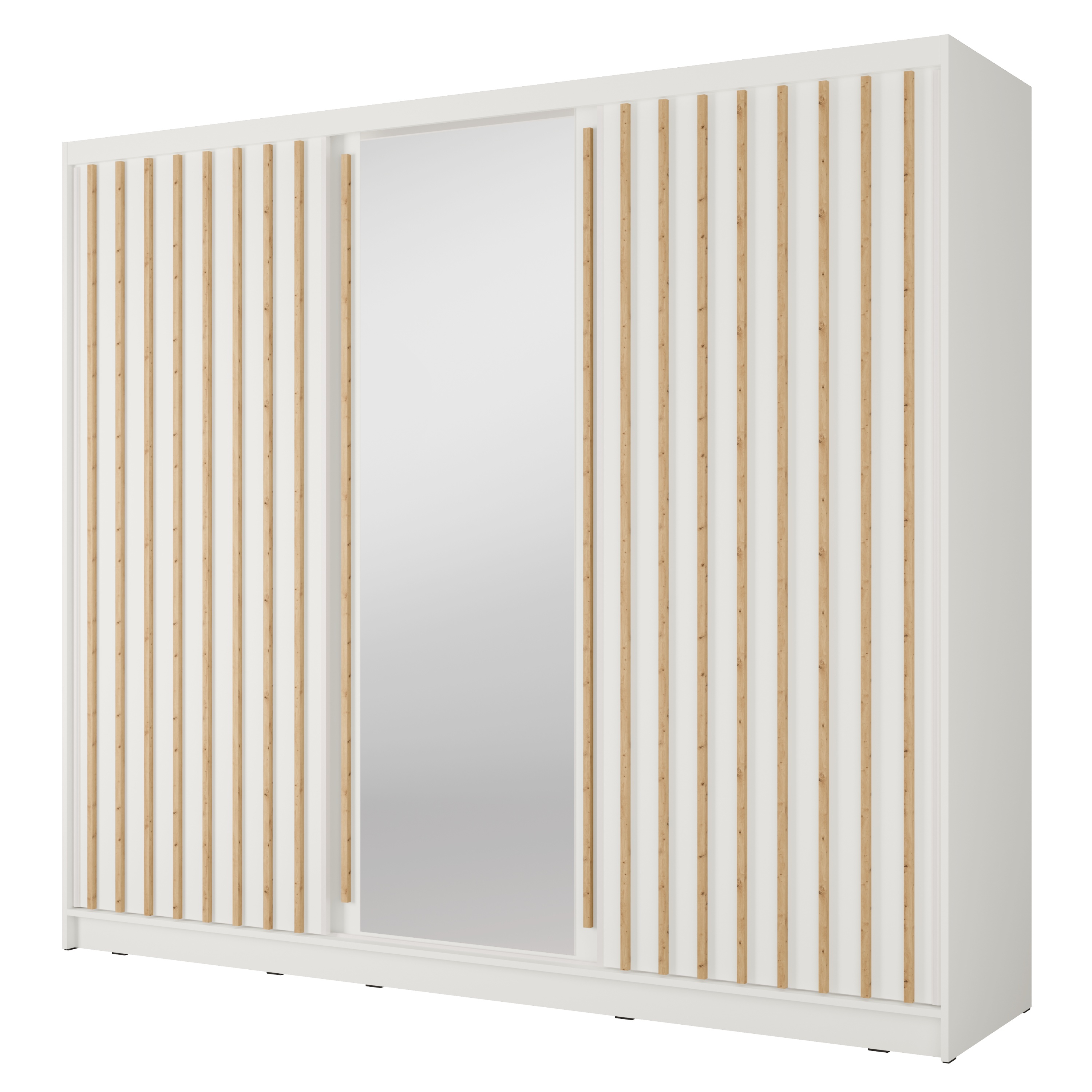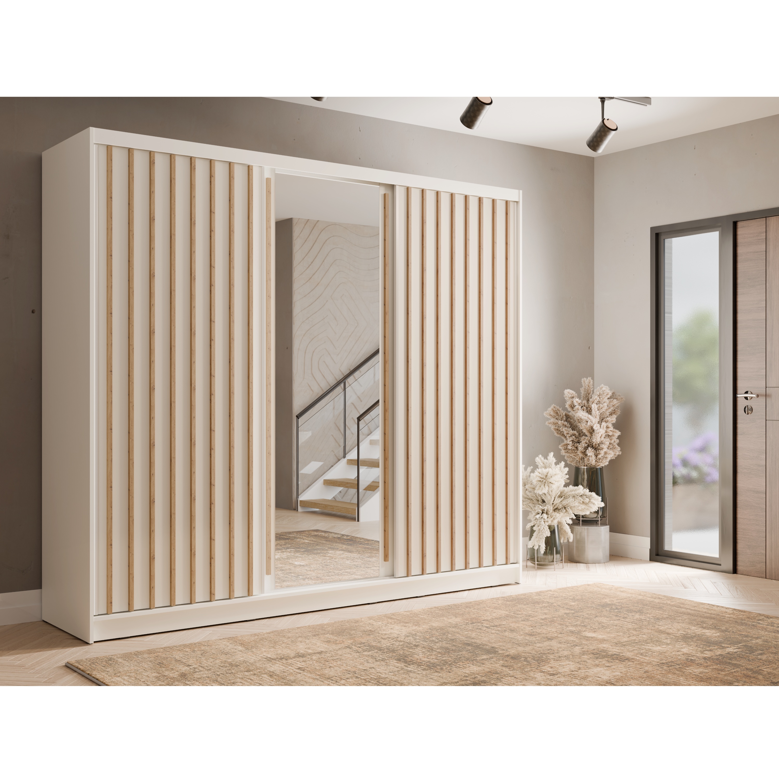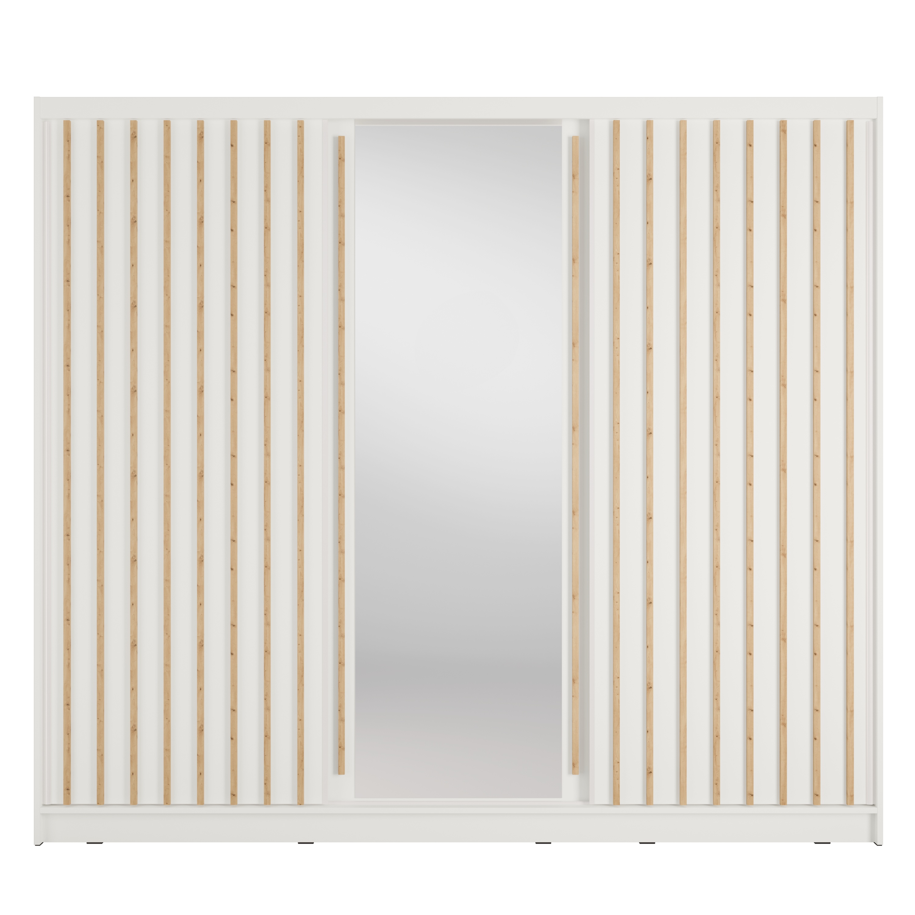 Moderná šatníková skriňa ALUNA II ideálne prepája moderný dizajn s praktickosťou. Jej neutrálne farebné prevedenie v kombinácii s dekoratívnymi lamelami v prírodnom odtieni vytvára zaujímavý kontrast, ktorý upúta na prvý pohľad.