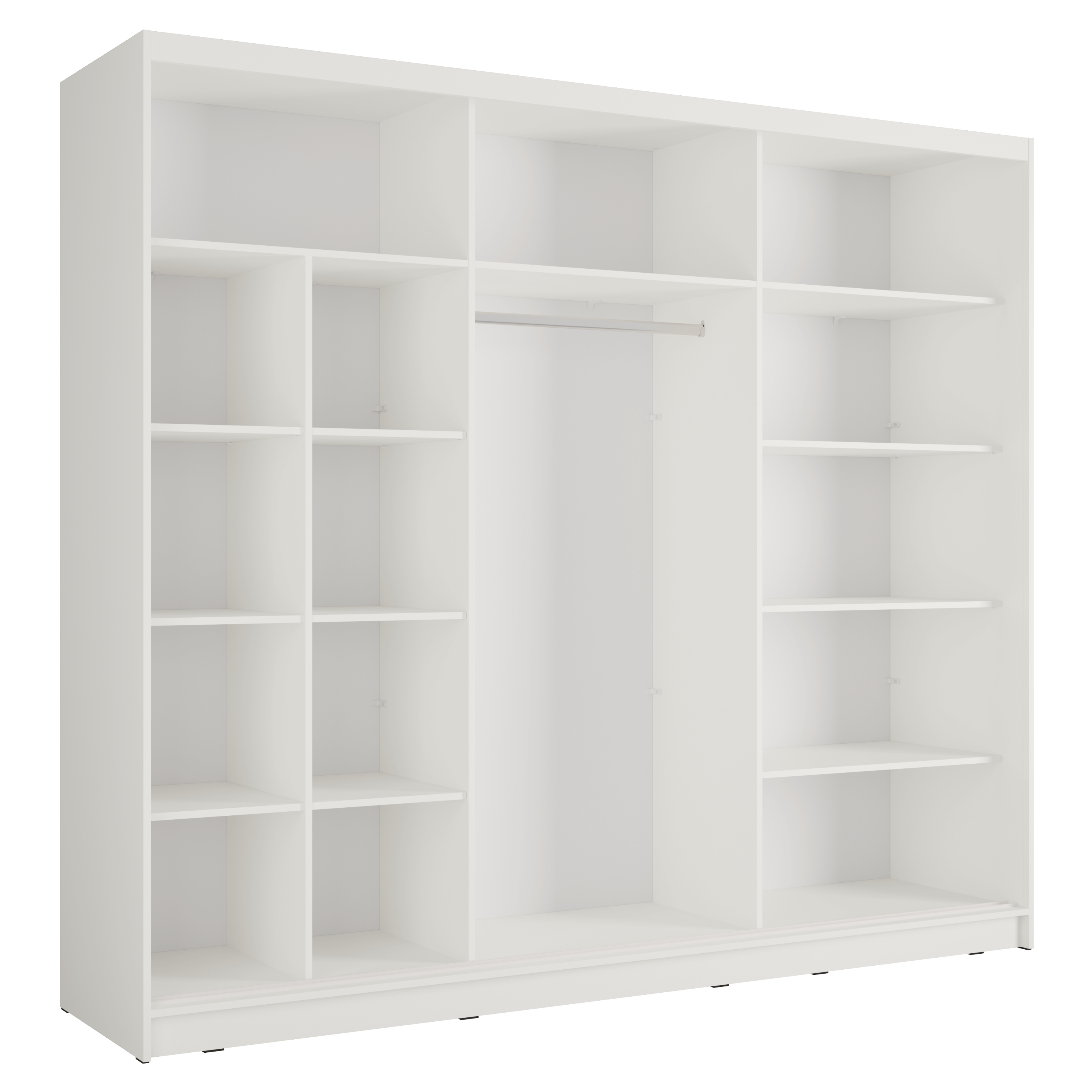 Vnútorný priestor je vybavený šatníkovou tyčou, ktorú využijete na zavesenie veľkých alebo krčivých kúskov oblečenia. Skriňa ďalej obsahuje celkovo 12 políc, ktoré spoločne vytvárajú veľký a prakticky rozdelený úložný priestor. Skriňu uzatvárajú posuvné dvere, z ktorých jedny prostredné sú doplnené o zrkadlo, vďaka ktorému si môžete kedykoľvek upraviť svoj vzhľad. Konštrukcia skrine je vyrobená z laminovaného dreveného materiálu s povrchom nenáročným na údržbu.