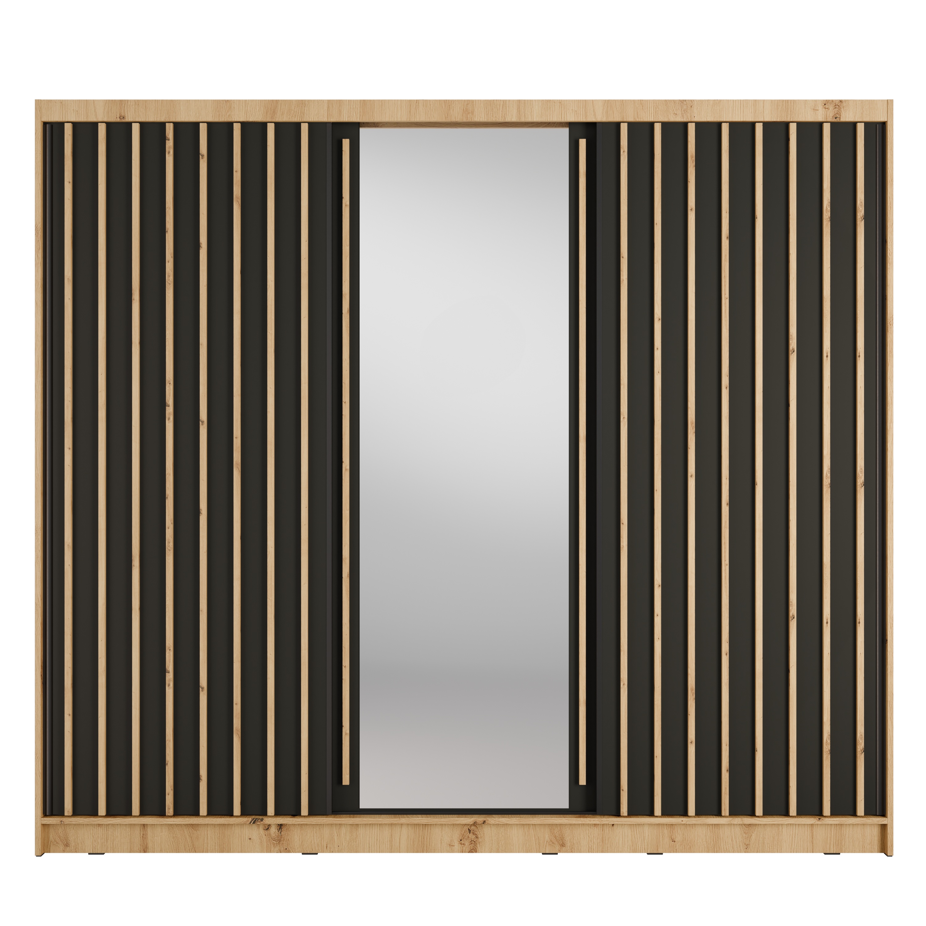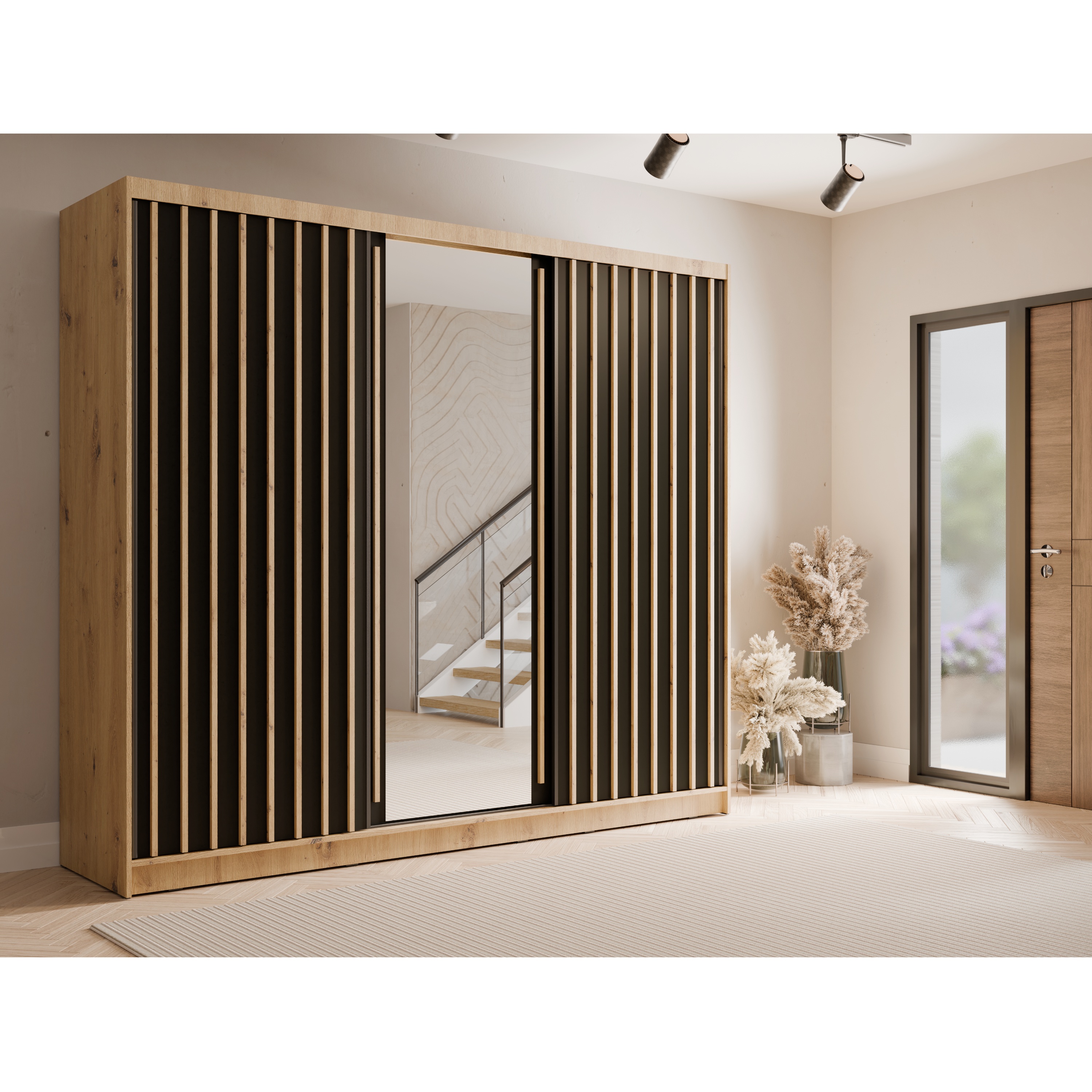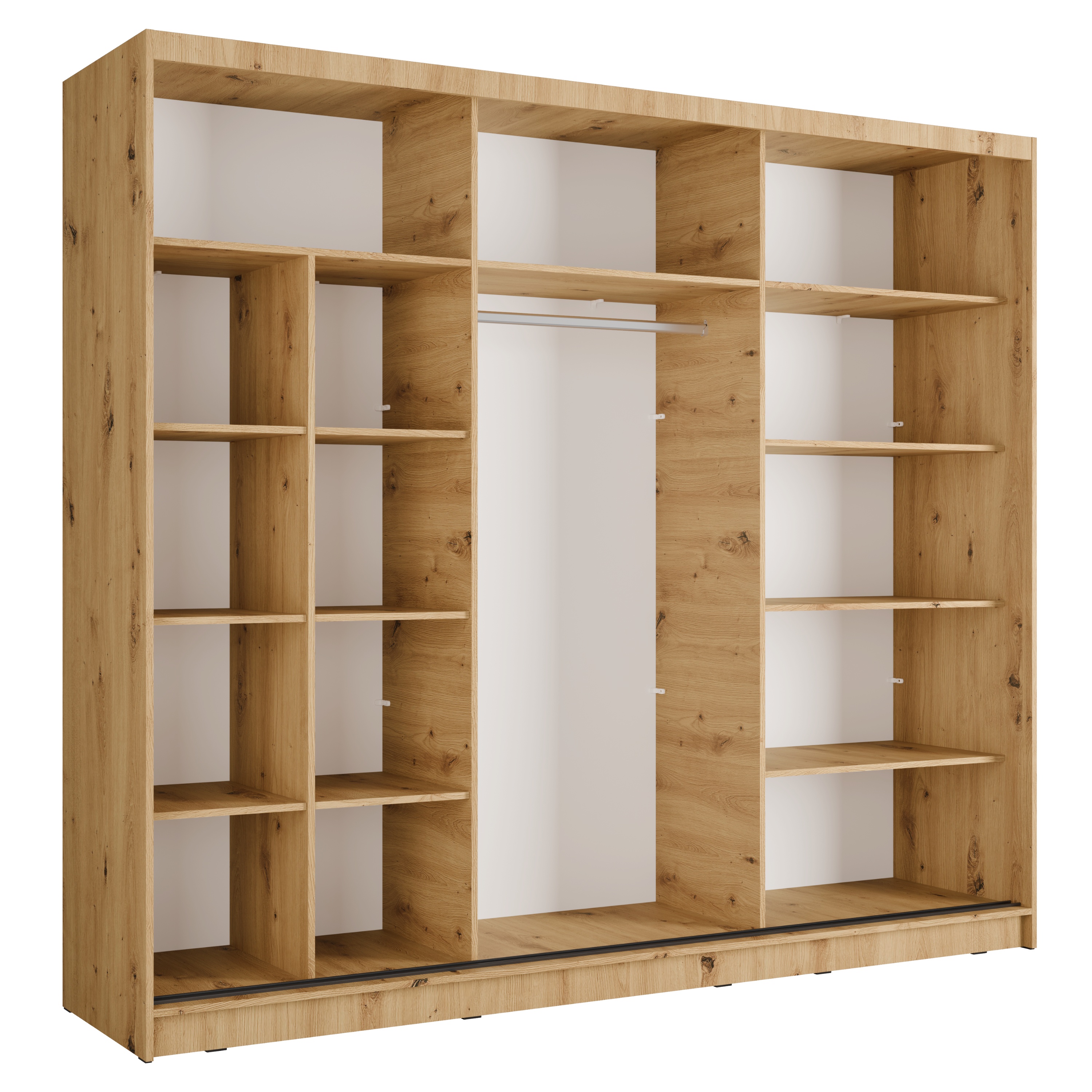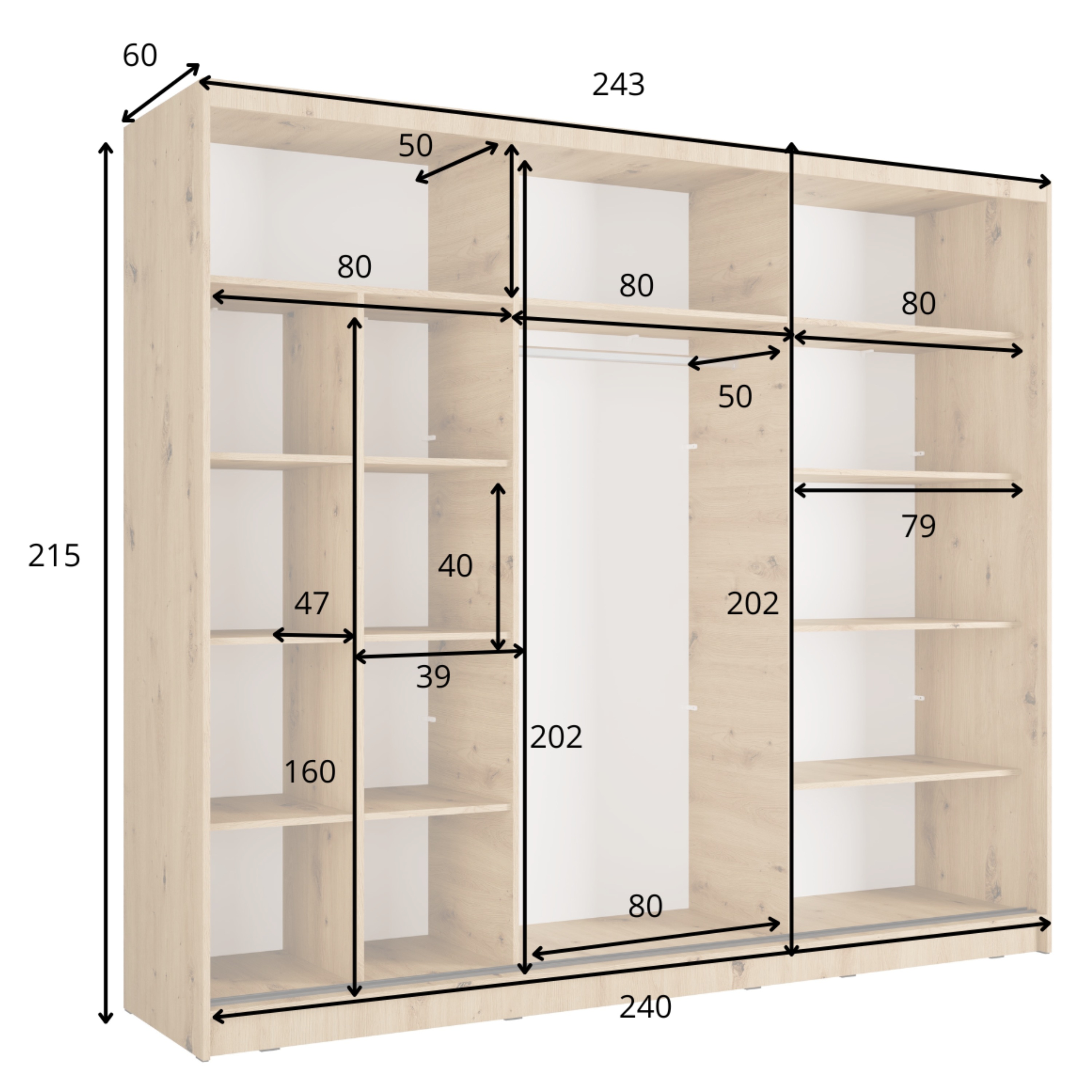 Vnútorný priestor je vybavený šatníkovou tyčou, ktorú využijete na zavesenie veľkých alebo krčivých kúskov oblečenia. Skriňa ďalej obsahuje celkovo 12 políc, ktoré spoločne vytvárajú veľký a prakticky rozdelený úložný priestor. Skriňu uzatvárajú posuvné dvere, z ktorých jedny prostredné sú doplnené o zrkadlo, vďaka ktorému si môžete kedykoľvek upraviť svoj vzhľad. Konštrukcia skrine je vyrobená z laminovaného dreveného materiálu s povrchom nenáročným na údržbu.