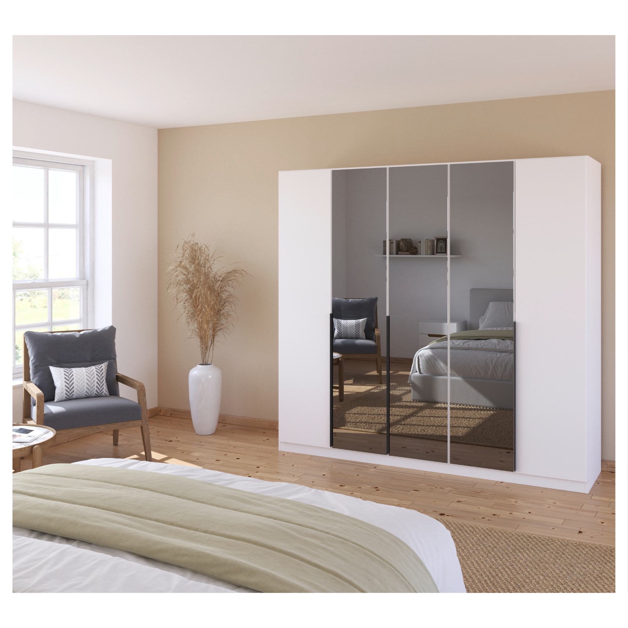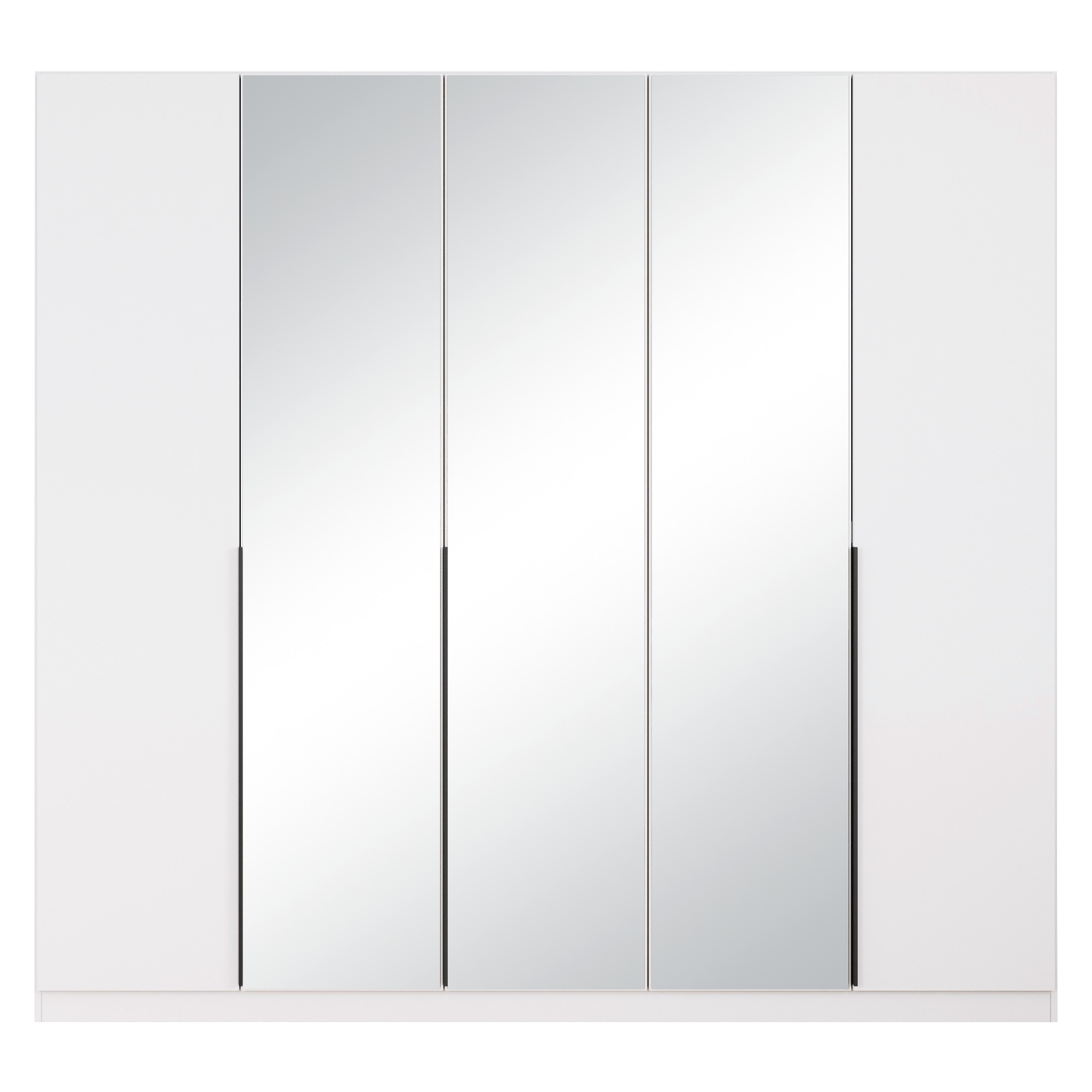 Skriňa uzatvára 5 otočných dverí, ktoré umožňujú ľahký prístup k uloženým predmetom. 3 z nich sú zrkadlové a vy si tak môžete kedykoľvek skontrolovať svoj vzhľad. Zrkadlá zároveň opticky zväčšia a rozjasnia miestnosť. Jednoduchú každodennú manipuláciu s dverami zaisťujú praktické lišty. Jednoducho riešený vnútorný priestor ponúka celkom 3 vložené police a 3 šatníkové tyče, ktoré poskytujú dostatok miesta na usporiadanie vášho oblečenia. Šatníková skriňa je vyrobená z potlačenej ekologickej drevotriesky, ktorá nie je náročná na údržbu.