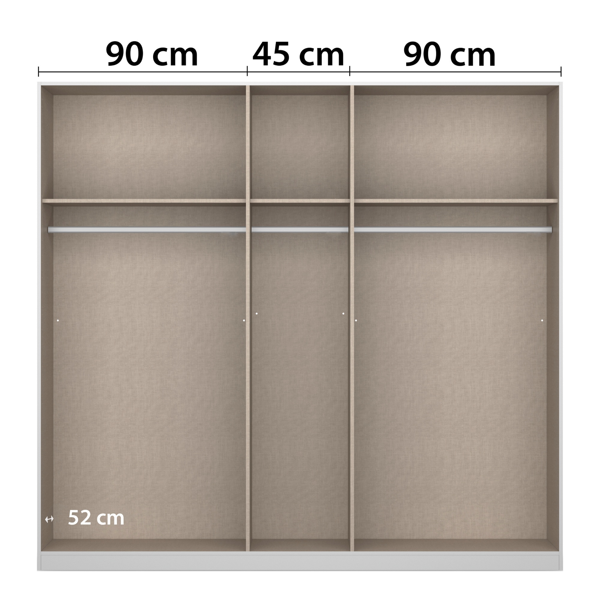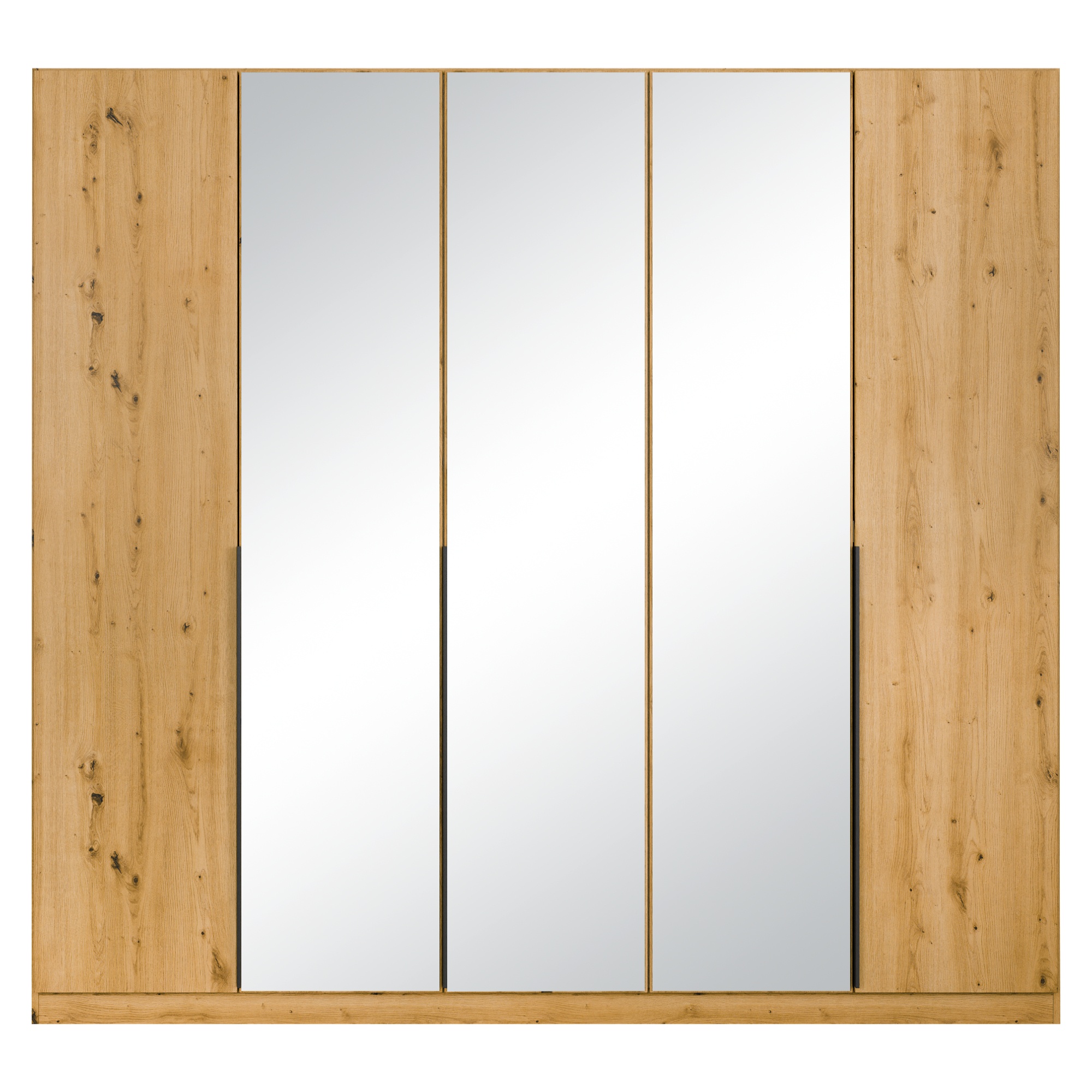 Skriňa uzatvára 5 otočných dverí, ktoré umožňujú ľahký prístup k uloženým predmetom. 3 z nich sú zrkadlové a vy si tak môžete kedykoľvek skontrolovať svoj vzhľad. Zrkadlá zároveň opticky zväčšia a rozjasnia miestnosť. Jednoduchú každodennú manipuláciu s dverami zaisťujú praktické lišty. Jednoducho riešený vnútorný priestor ponúka celkom 3 vložené police a 3 šatníkové tyče, ktoré poskytujú dostatok miesta na usporiadanie vášho oblečenia. Šatníková skriňa je vyrobená z potlačenej ekologickej drevotriesky, ktorá nie je náročná na údržbu.