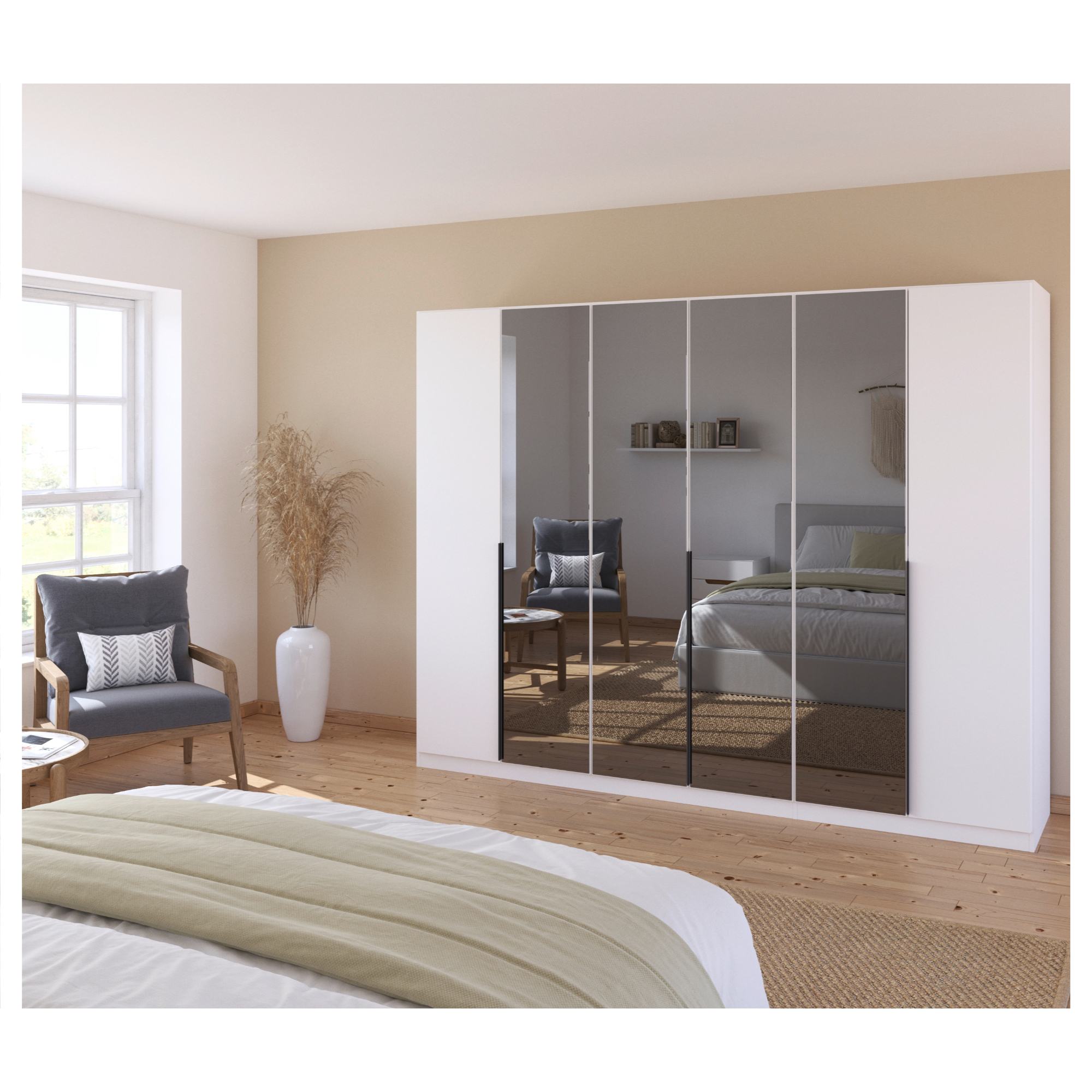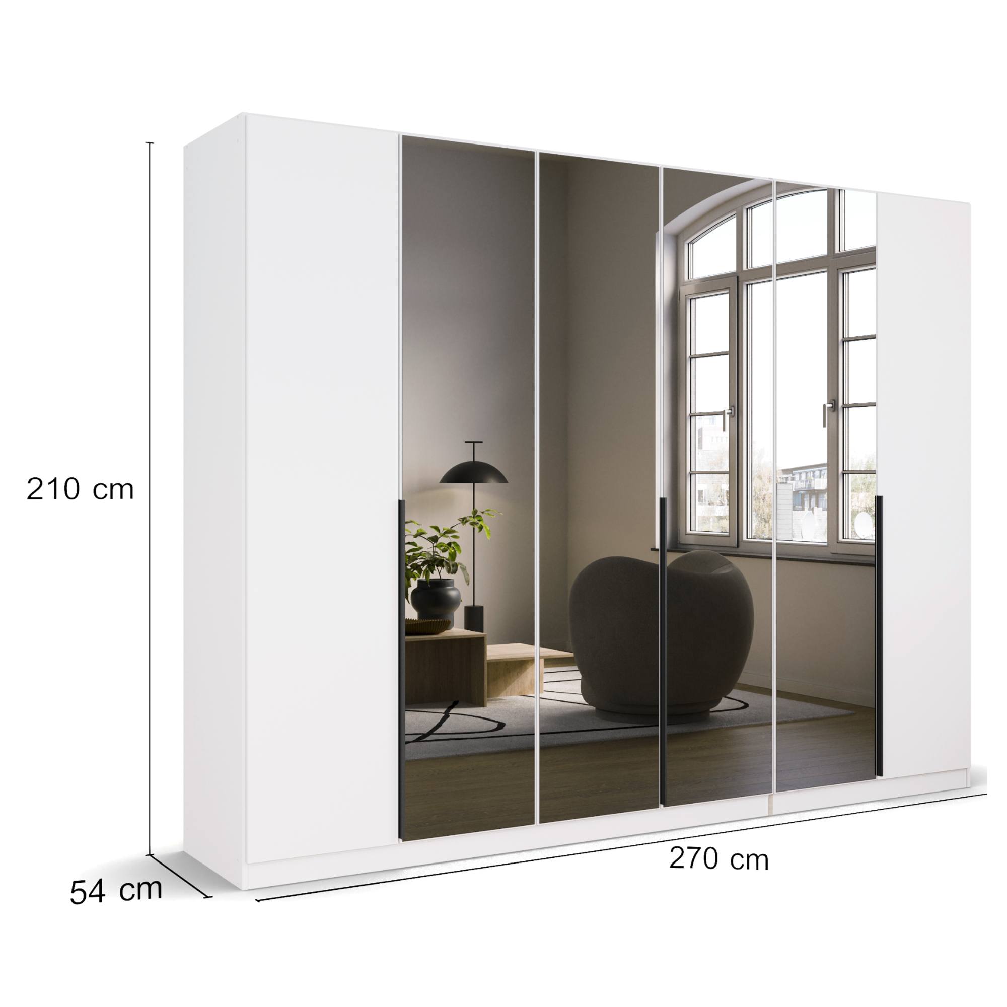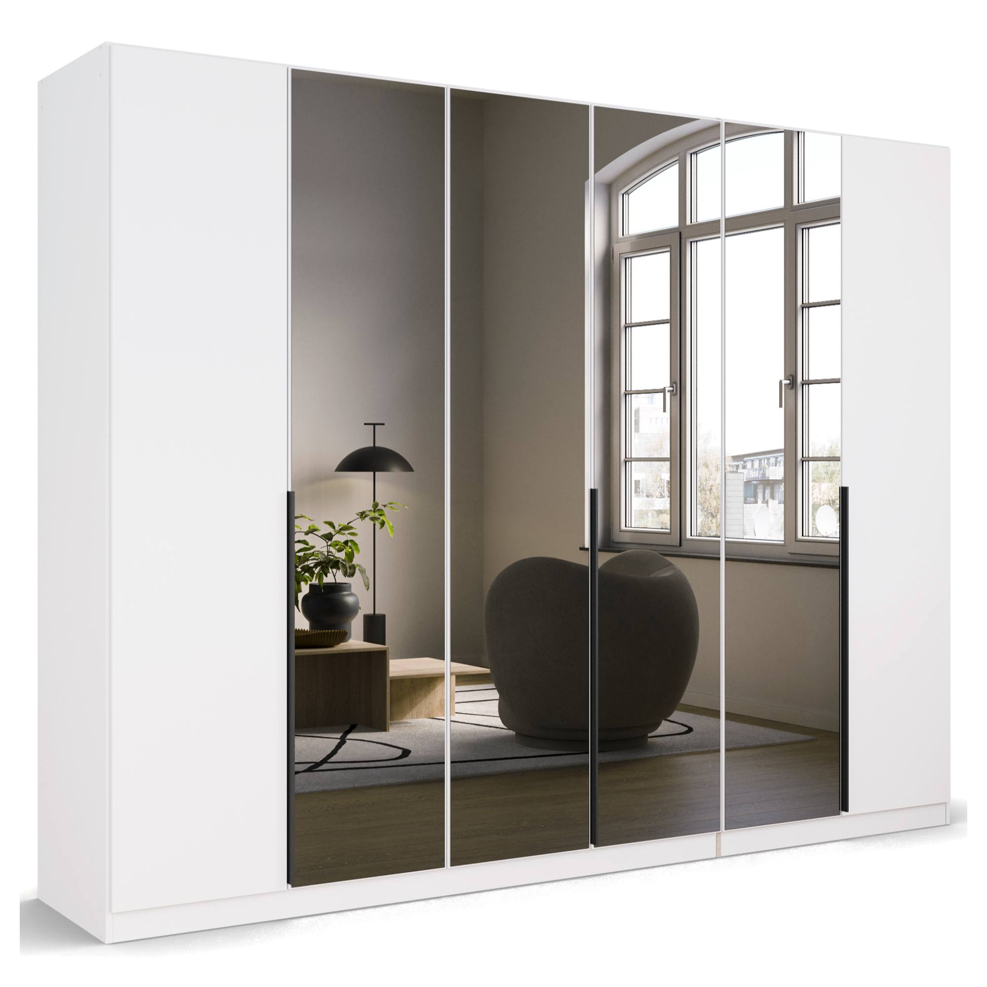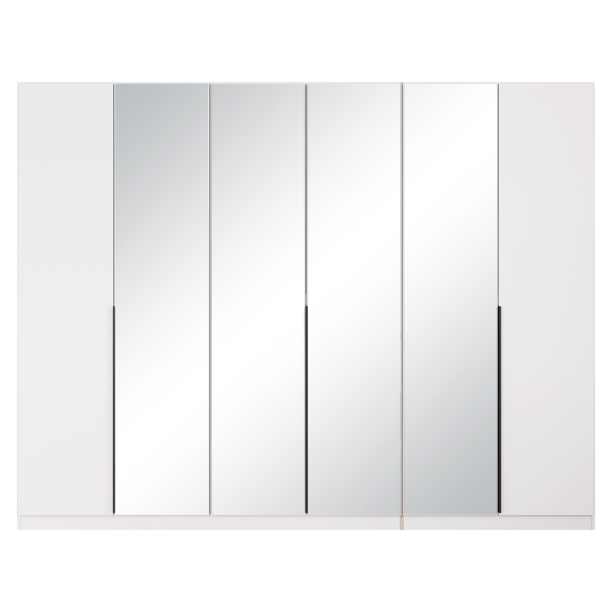 Skriňu pohodlne uzavrite pomocou 6 otočných dverí z ktorých 4 vypĺňajú zrkadlá, vďaka ktorým môžete kedykoľvek upraviť svoj vzhľad. Zrkadlá sa zároveň postarajú o optické zväčšenie a presvetlenie interiéru. Na ľahšiu manipuláciu s dverami slúžia praktické lišty.