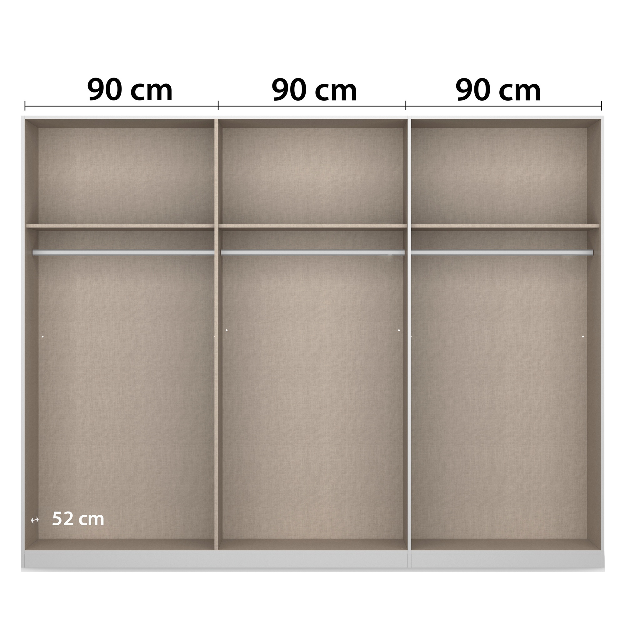 Priestor za každým párom dverí obsahuje 1 šatníkovú tyč, celkom teda skriňa ponúka 3 šatníkové tyče. Nad každou tyčou sa navyše nachádza priestranná vložená polica na uloženie poskladaných odevov alebo lôžkovín. Skriňa je vyrobená z potlačenej ekologickej drevotriesky nenáročnej na údržbu.