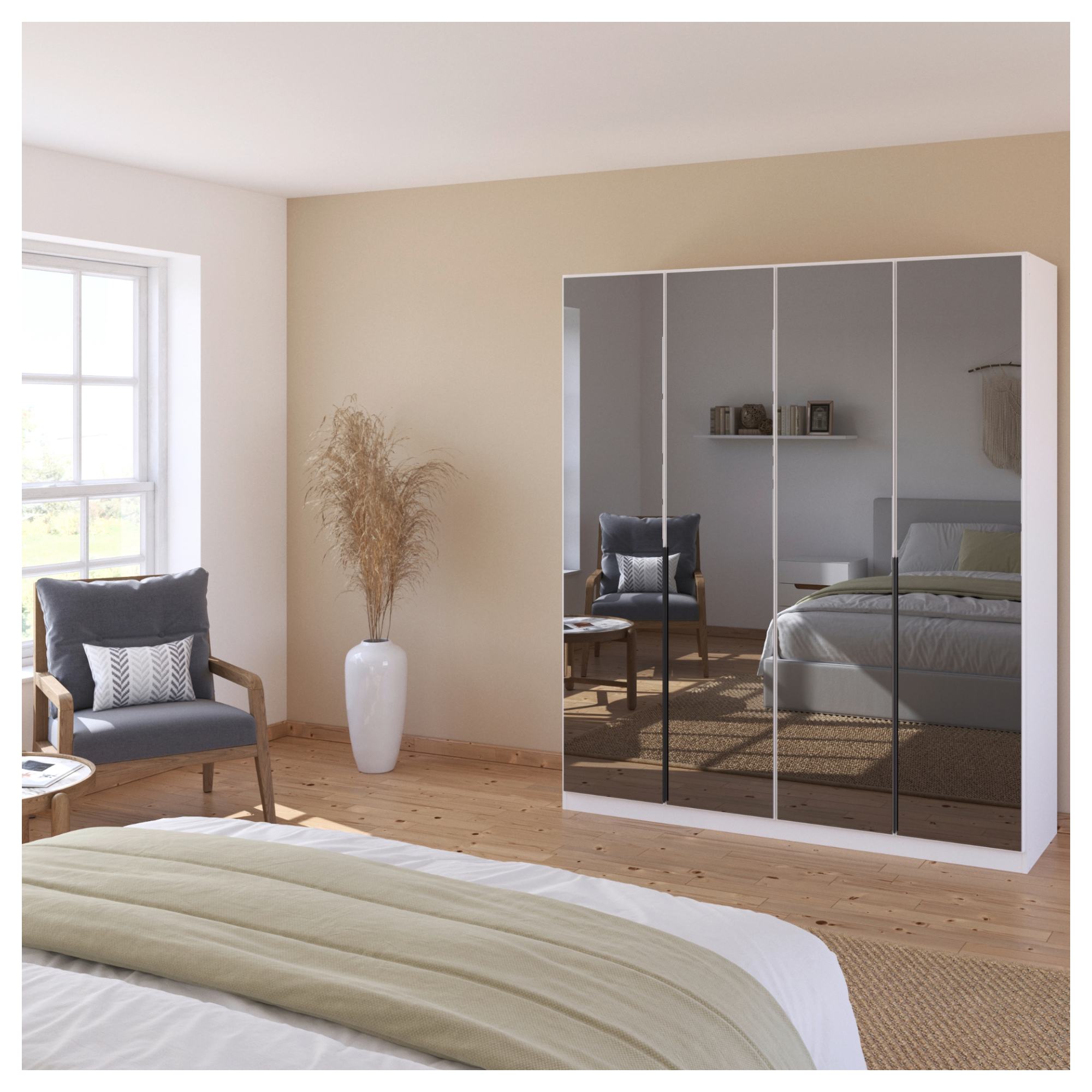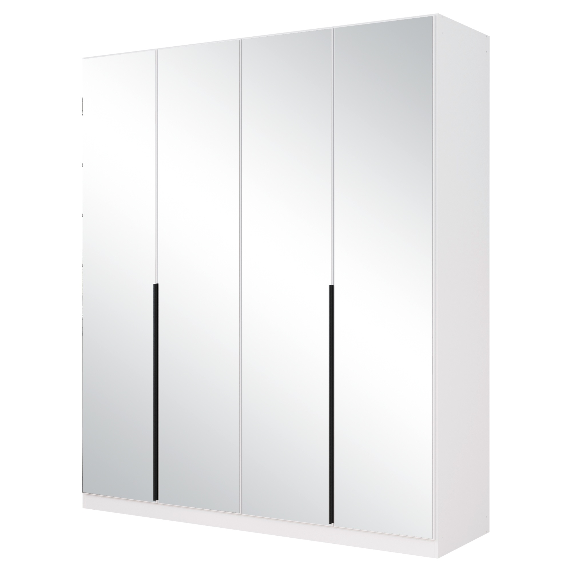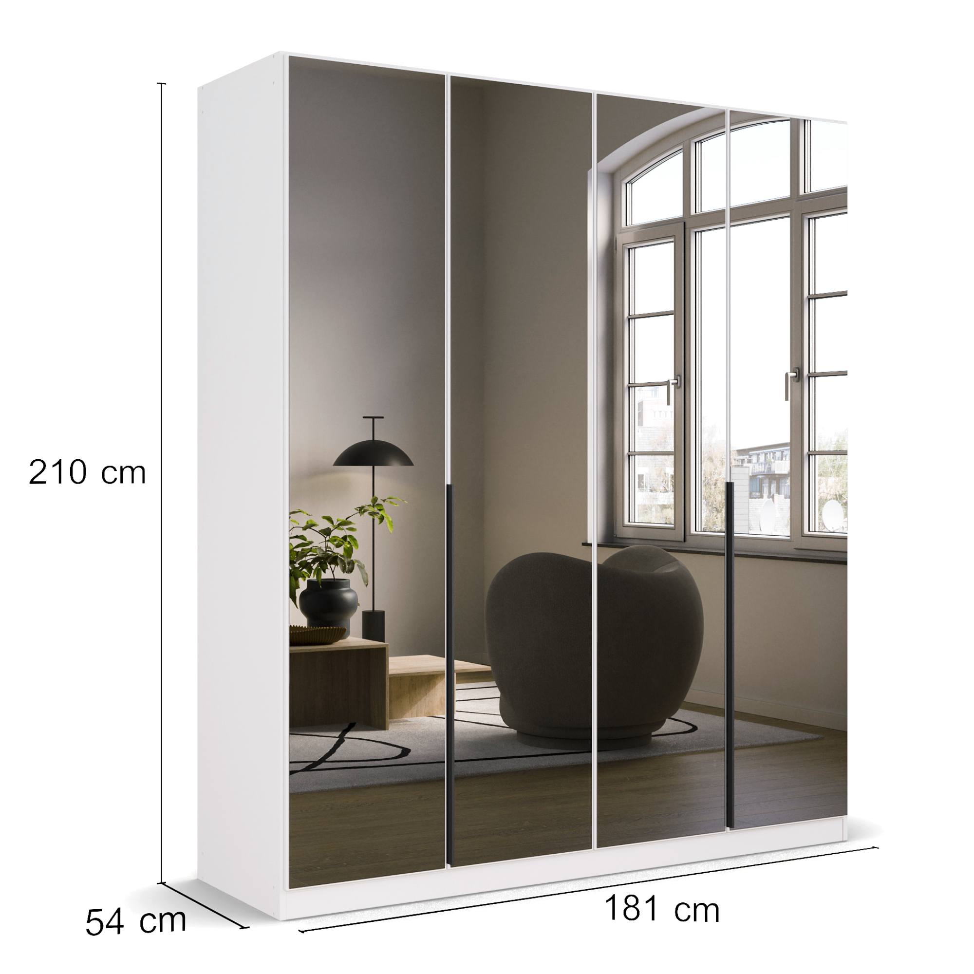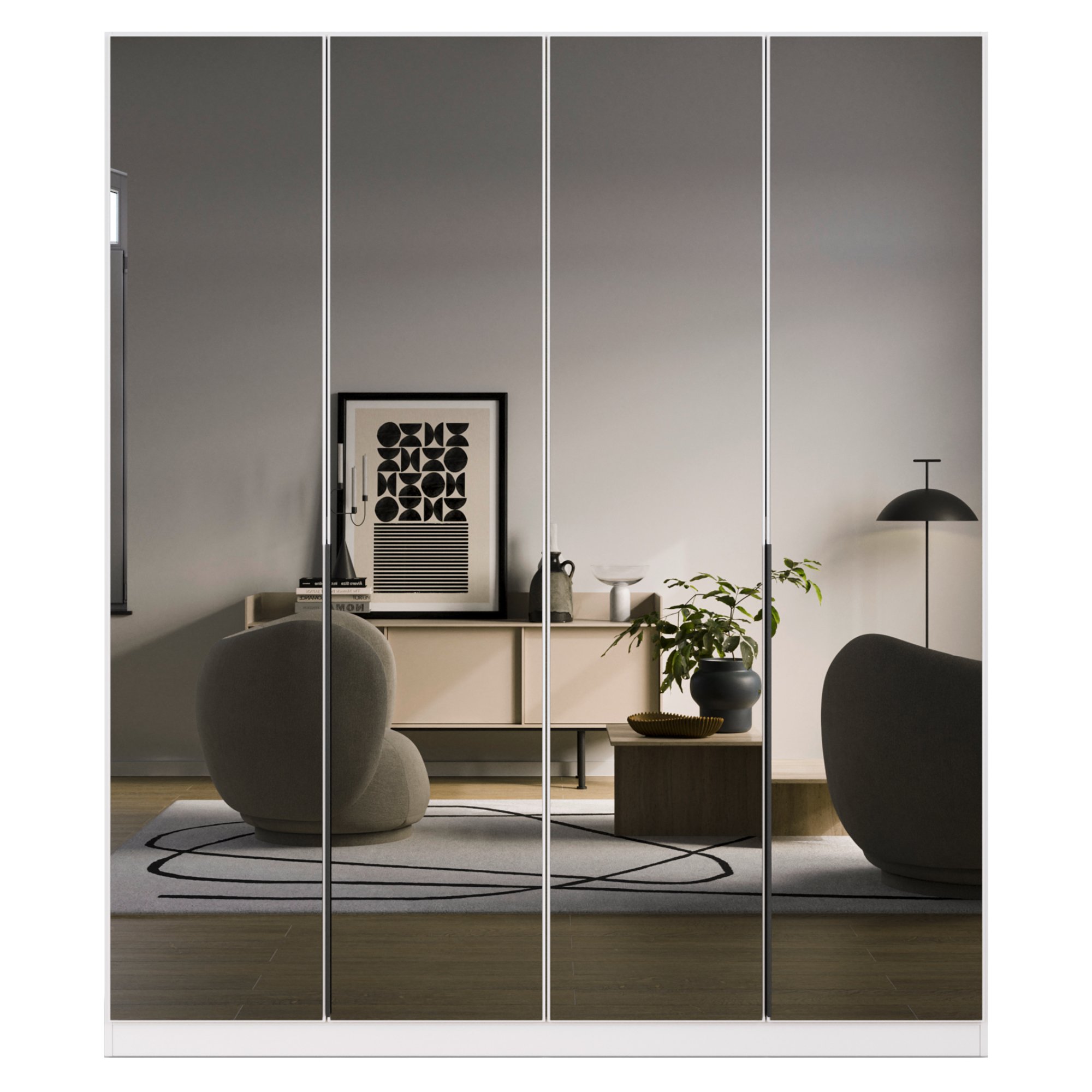 Skriňa je uzatvárateľná 2 pármi otočných dverí, ktoré sú navyše všetky vybavené zrkadlami. Skriňa tak dokonale presvetlí a opticky zväčší miestnosť. Na ľahkú každodennú manipuláciu s dverami slúžia praktické lišty. Vnútorný úložný priestor je rozčlenený do 2 identických blokov, keď každý z nich obsahuje 1 šatníkovú tyč a 1 vloženú policu nad ňou. Skriňa je vyrobená z ekologickej, udržateľnej drevotriesky zaisťujúcej dlhú životnosť a nenáročnú údržbu.