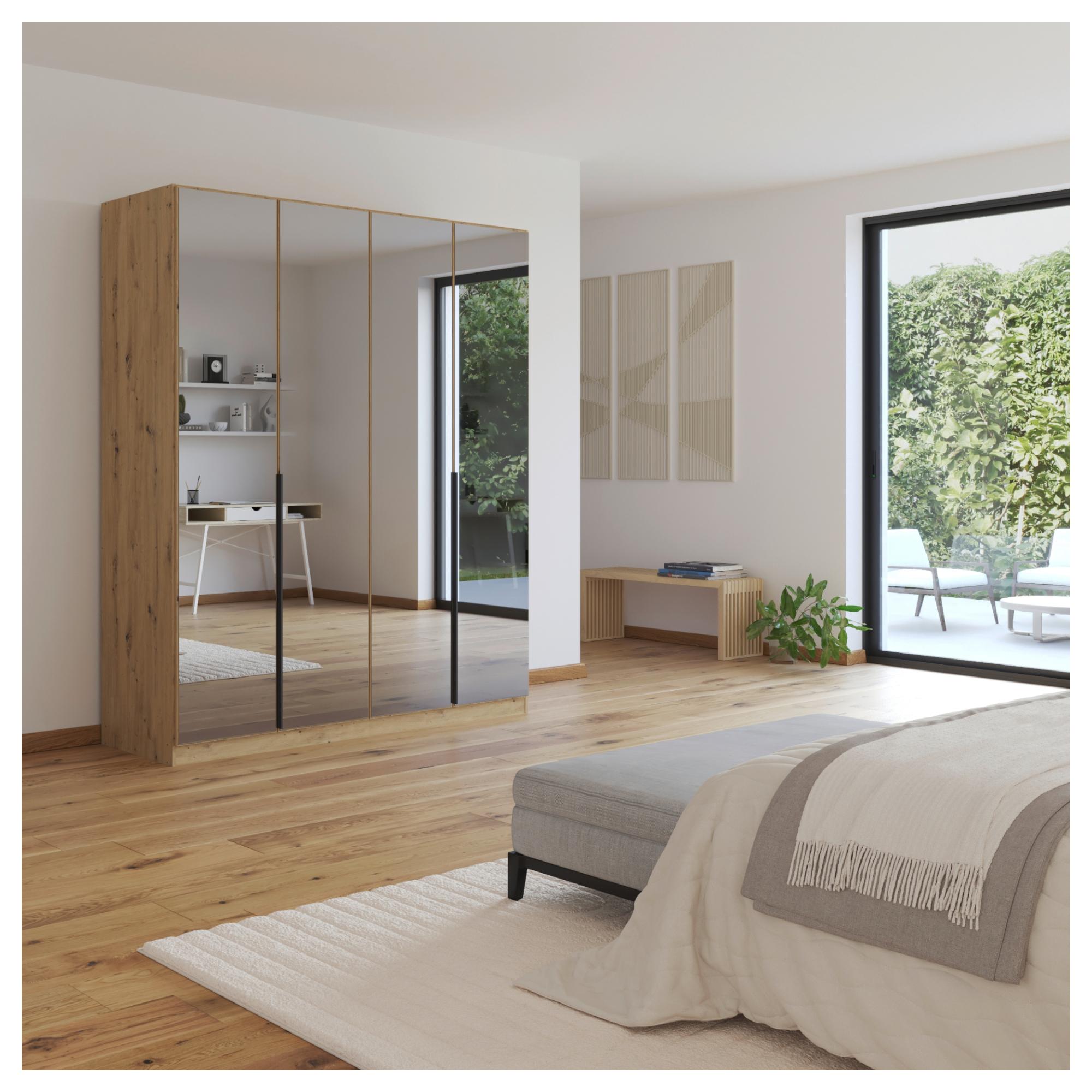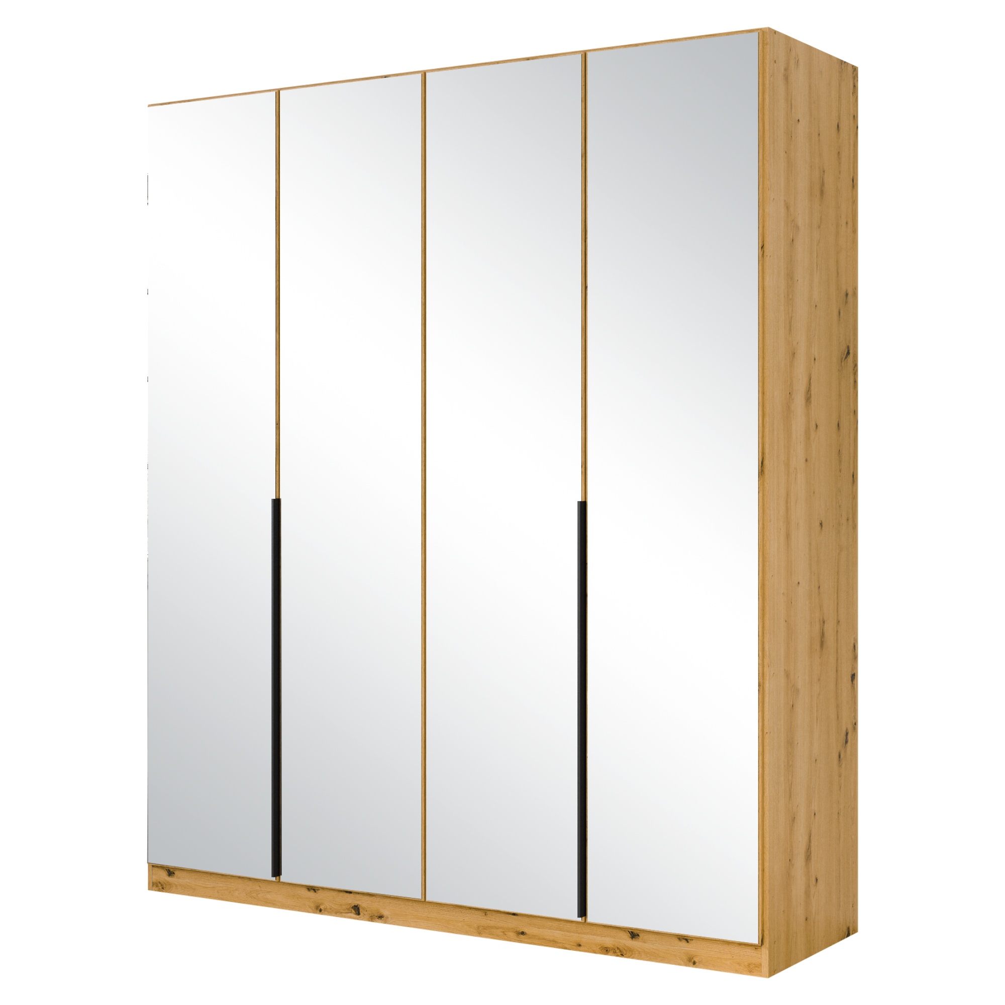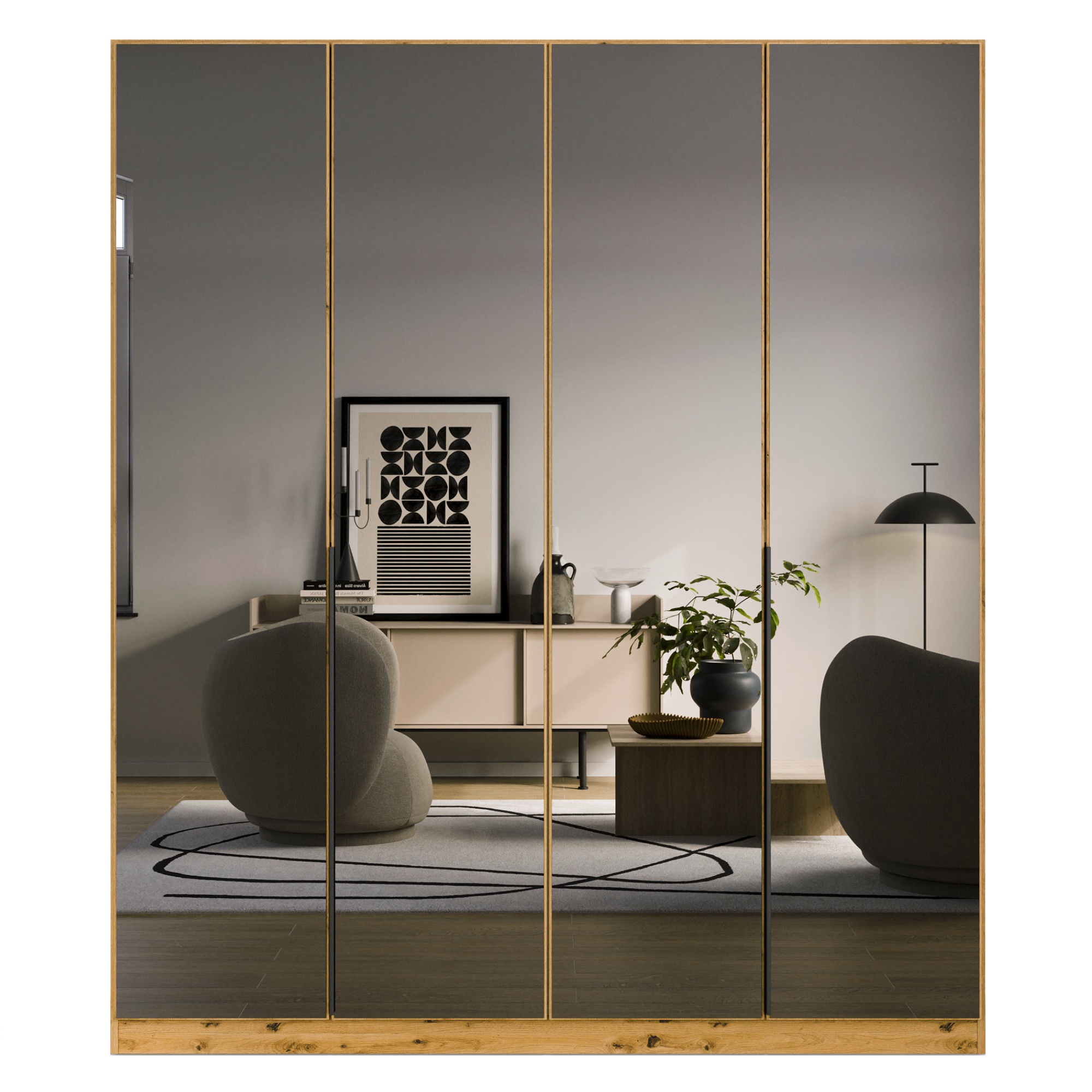 Skriňa je uzatvárateľná 2 pármi otočných dverí, ktoré sú navyše všetky vybavené zrkadlami. Skriňa tak dokonale presvetlí a opticky zväčší miestnosť. Na ľahkú každodennú manipuláciu s dverami slúžia praktické lišty. Vnútorný úložný priestor je rozčlenený do 2 identických blokov, keď každý z nich obsahuje 1 šatníkovú tyč a 1 vloženú policu nad ňou. Skriňa je vyrobená z ekologickej, udržateľnej drevotriesky zaisťujúcej dlhú životnosť a nenáročnú údržbu.