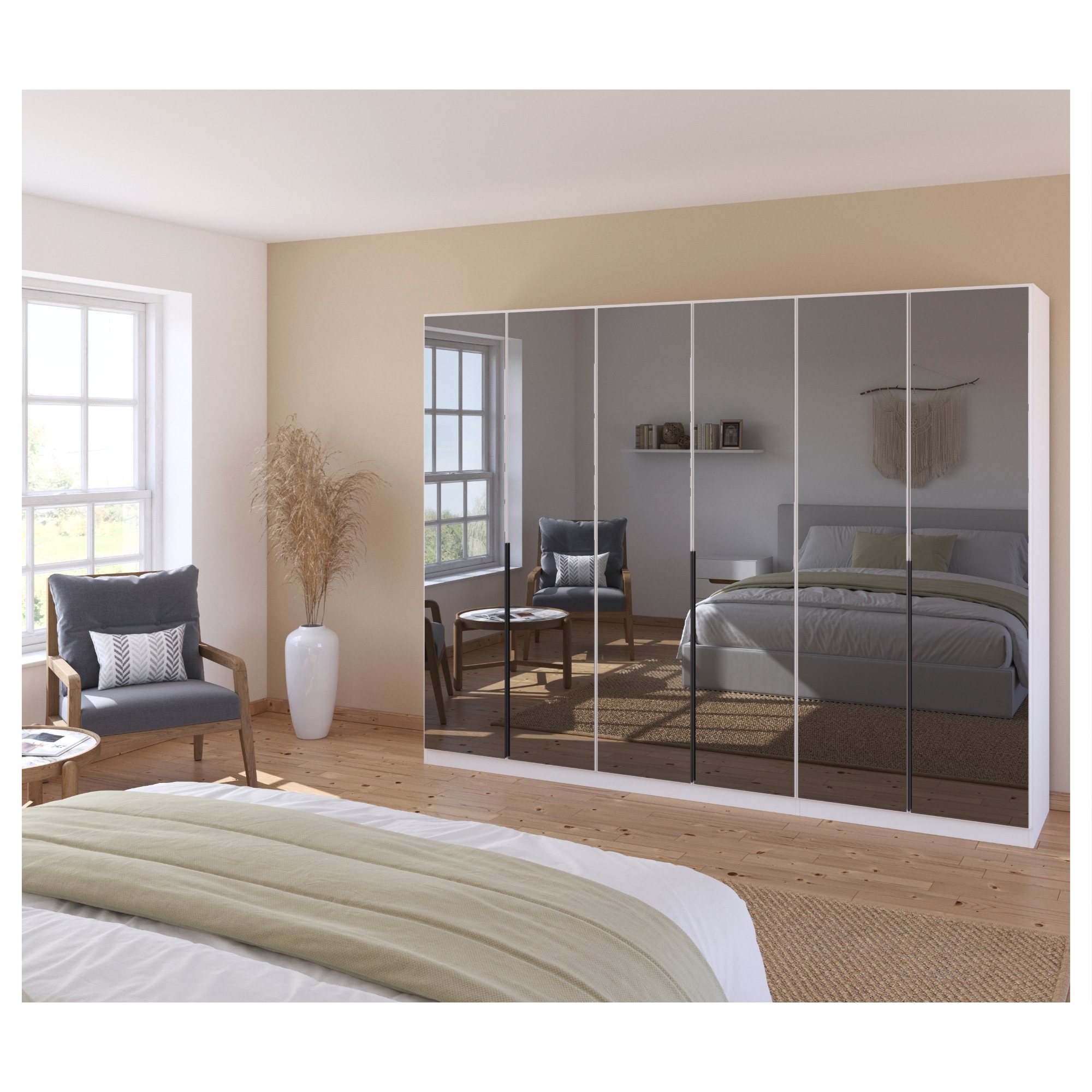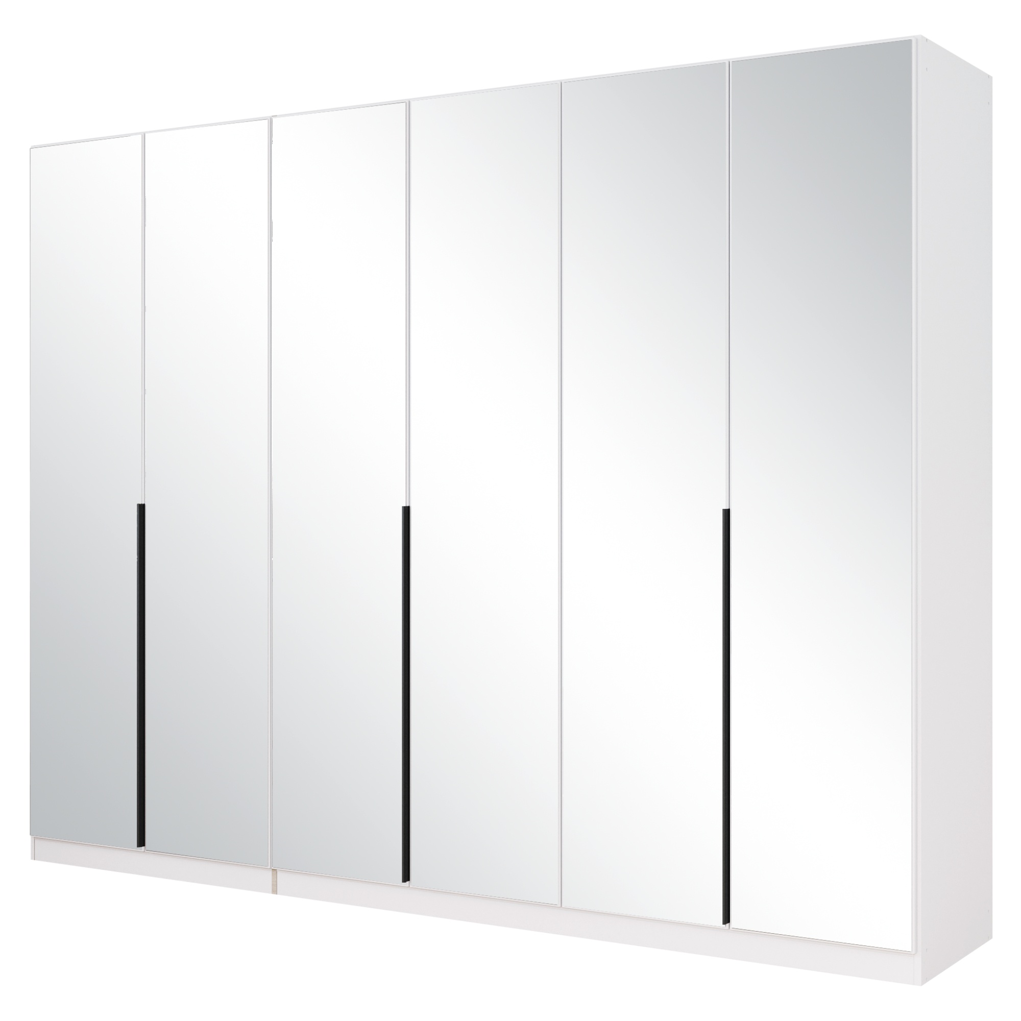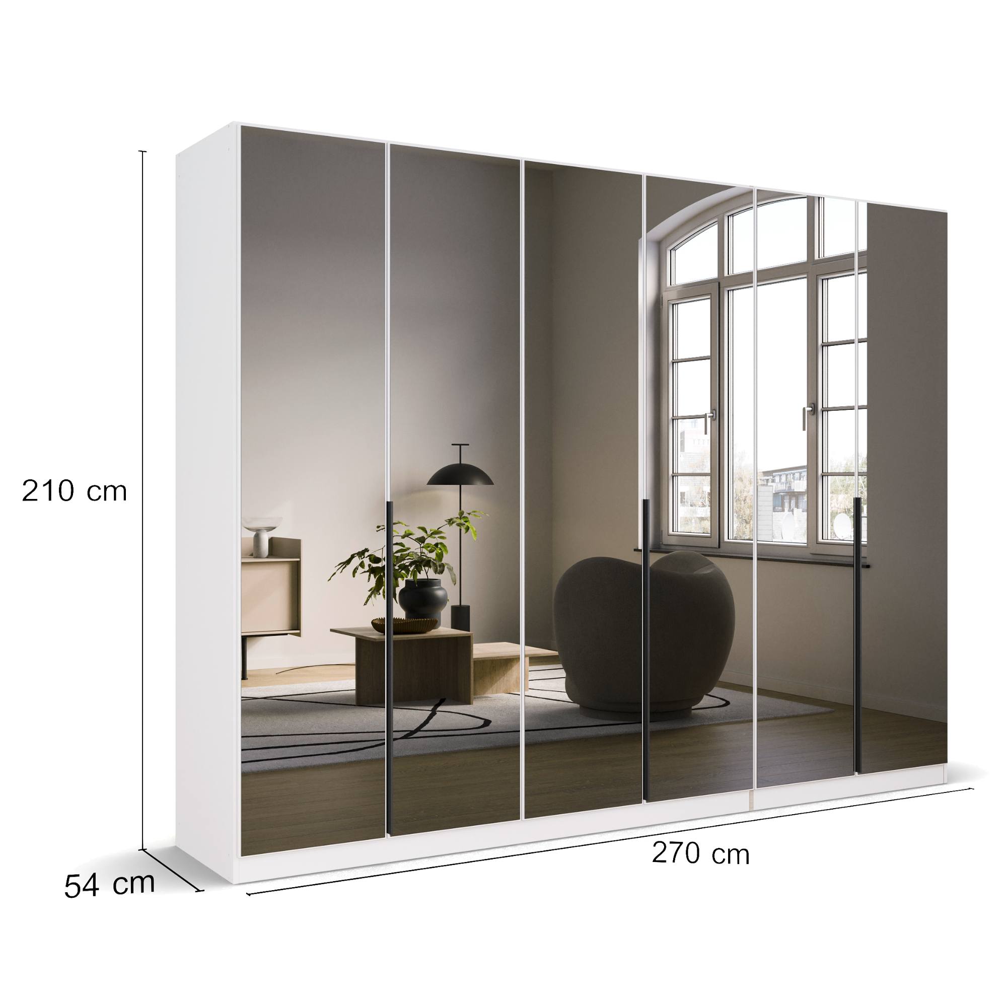 Konštrukcia je vybavená 6 otočnými dverami za ktorými sa nachádza prakticky riešené vnútorné vybavenie. Dvere sú navyše celé vyplnené zrkadlami, ktoré rozjasnia a opticky zväčšia miestnosť. Jednoduchú každodennú manipuláciu s dverami zaisťujú praktické lišty. Za každým z 3 párov dverí sa nachádza veľký priestor s 1 šatníkovou tyčou a 1 vloženou policou nad ňou. Šatníková skriňa je vyrobená z potlačenej ekologickej drevotriesky, ktorá je odolná a nenáročná na údržbu.