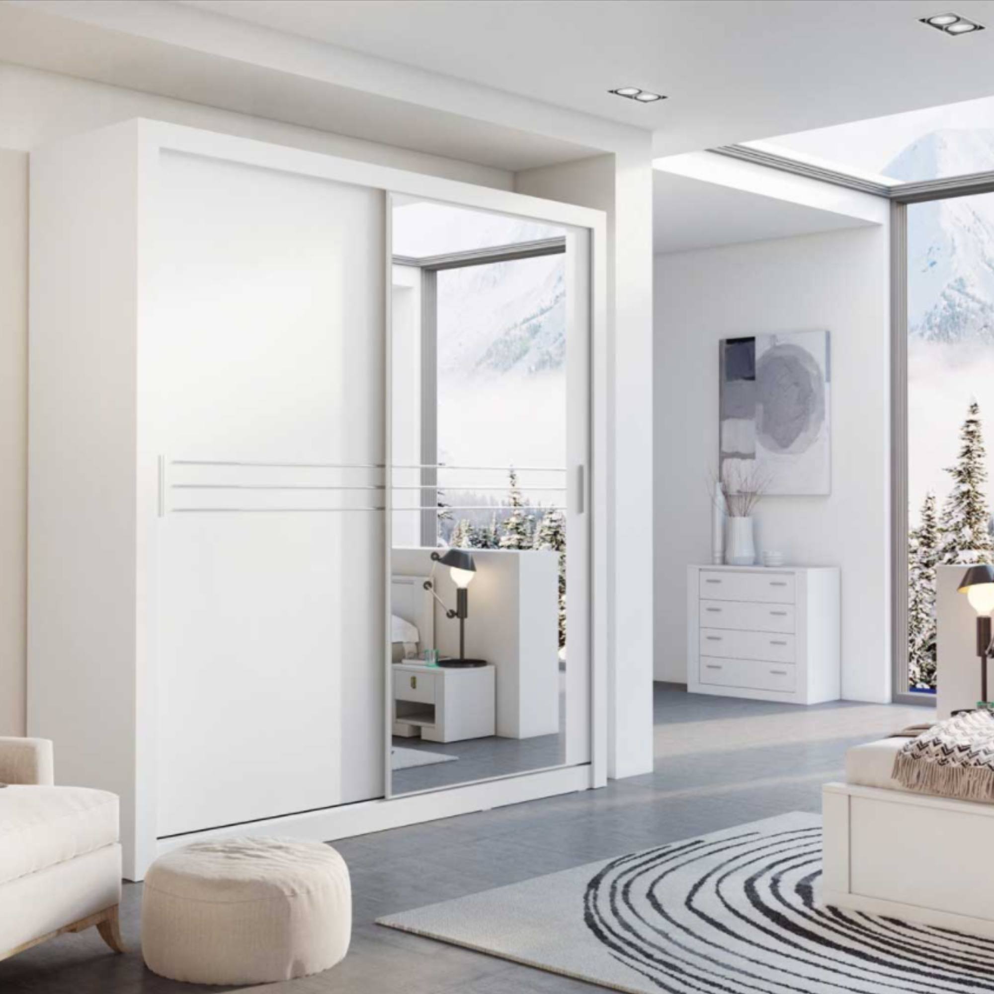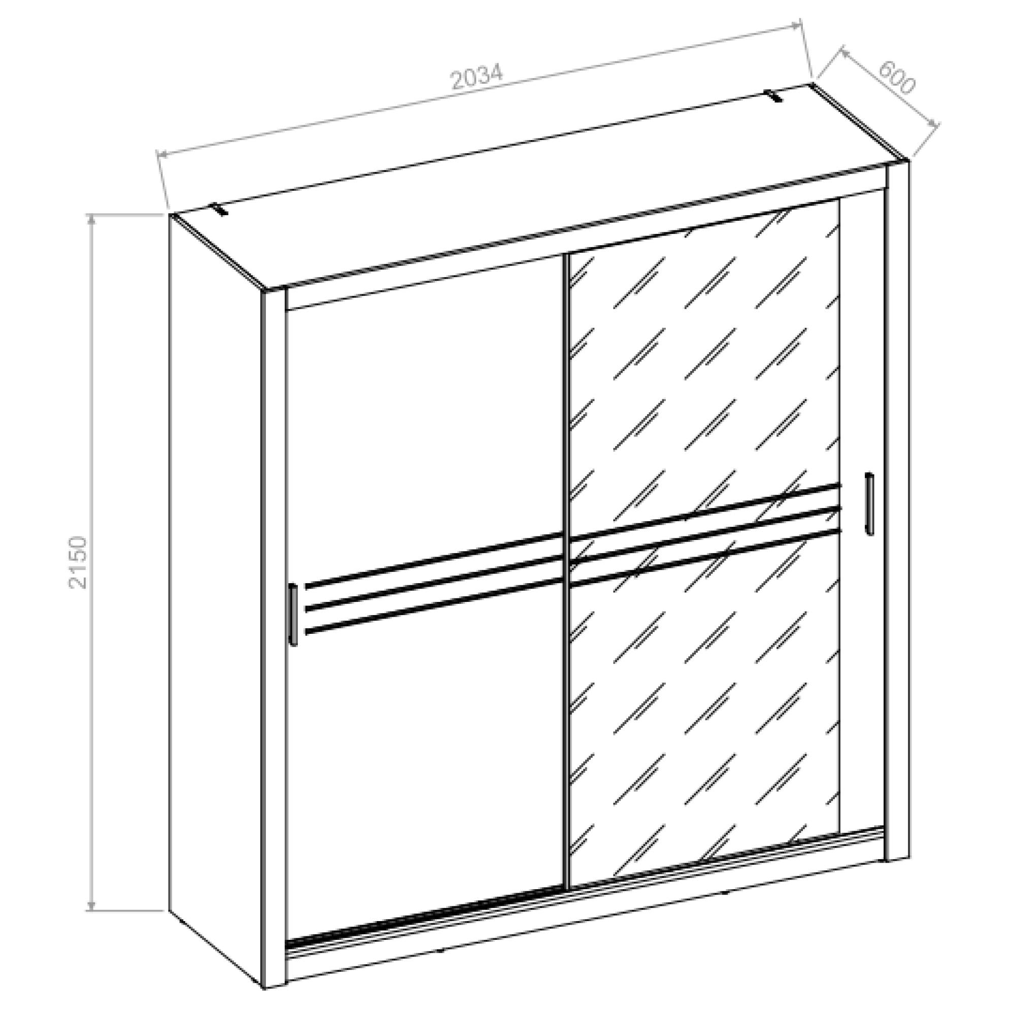 Dominantou skrine sú 1 zrkadlové dvere, ktoré opticky zväčšia váš interiér a prinesú do miestnosti viac svetla. Za posuvnými dverami nájdete 9 vložených políc a šatníkovú tyč na uloženie všetkého vášho oblečenia. Skriňa je vyrobená z laminovaného dreveného materiálu nenáročného na údržbu. Hrany nábytku sú zakončené ABS hranami, ktoré bránia prenikaniu vlhkosti do materiálu a mechanickému opotrebovaniu.