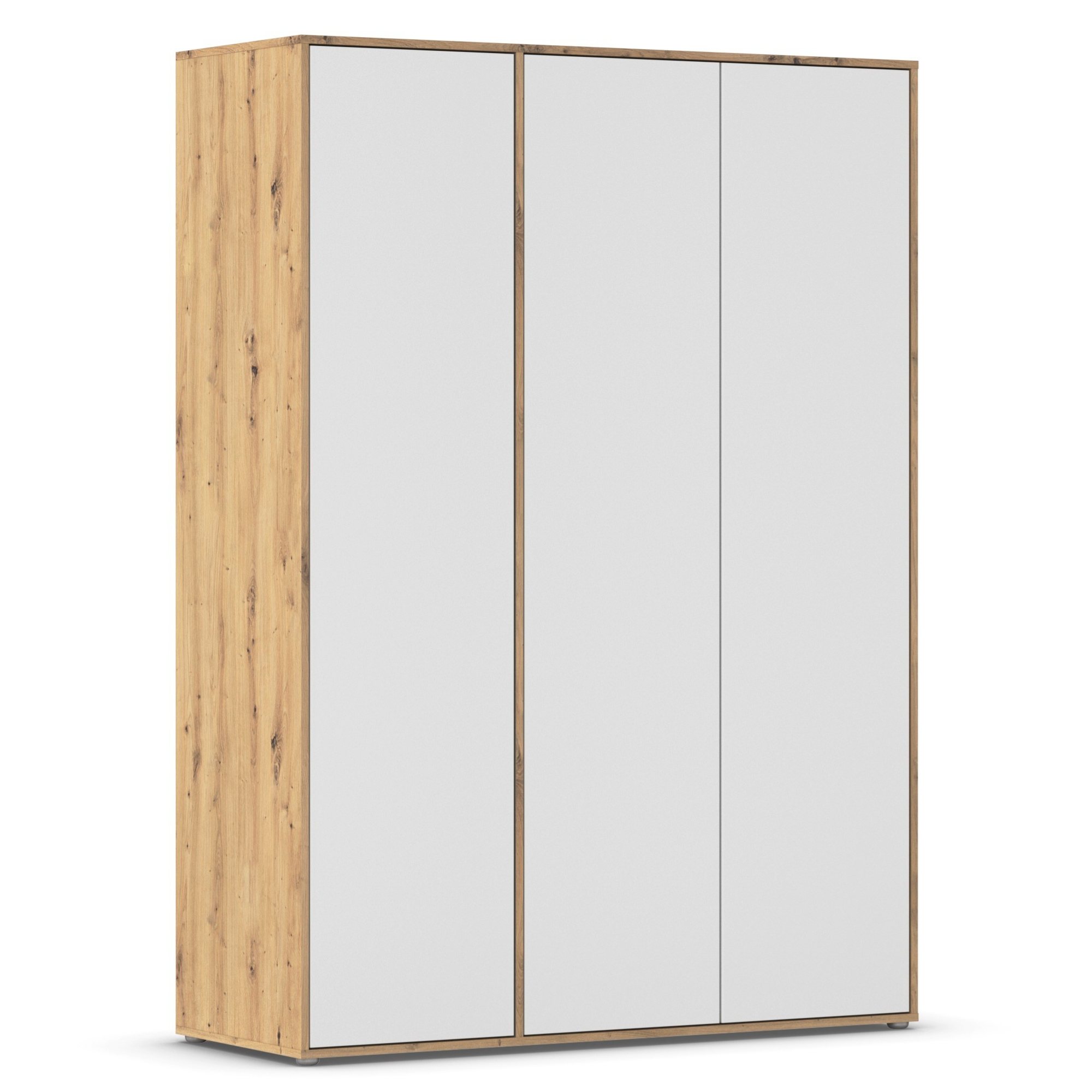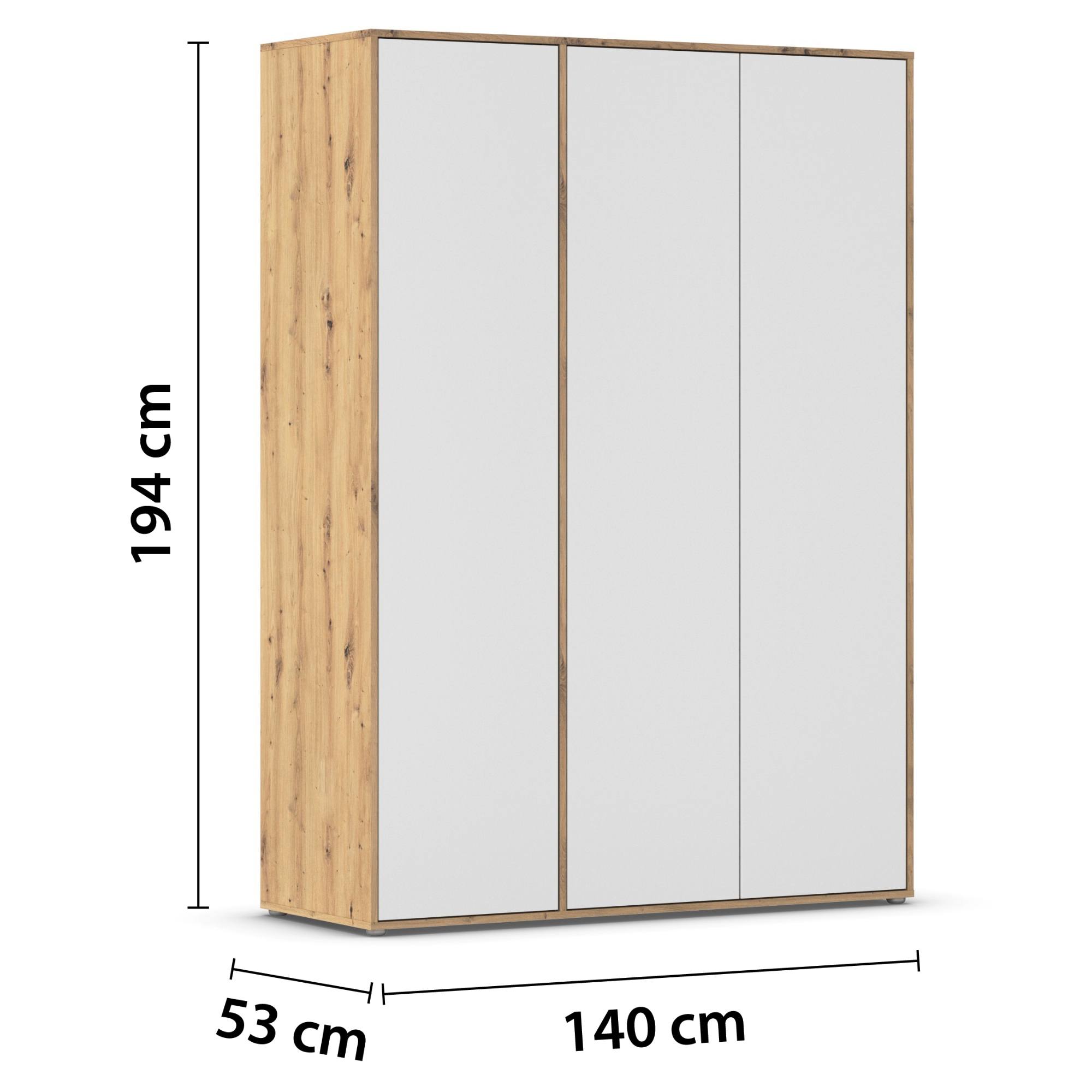 Skriňa je vybavená 3 otočnými dverami ktorých ľahké otváranie umožňuje systém push to open. Pár dverí na pravej strane za sebou ukrýva prepojený priestor s výškovo nastaviteľnou šatníkovou tyčou na zavesenie krčivých a objemnejších kúskov a vloženou policou. Za samostatnými dverami nájdete 3 vložené police na prehľadné skladovanie poskladaného oblečenia a ďalšieho textilu, ktoré je možné voľne usporiadať. Konštrukcia skrine je vyrobená z drevotriesky s povrchom nenáročným na údržbu.