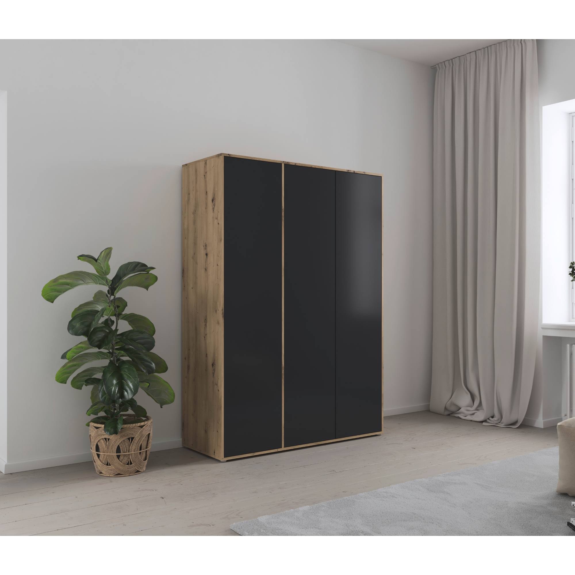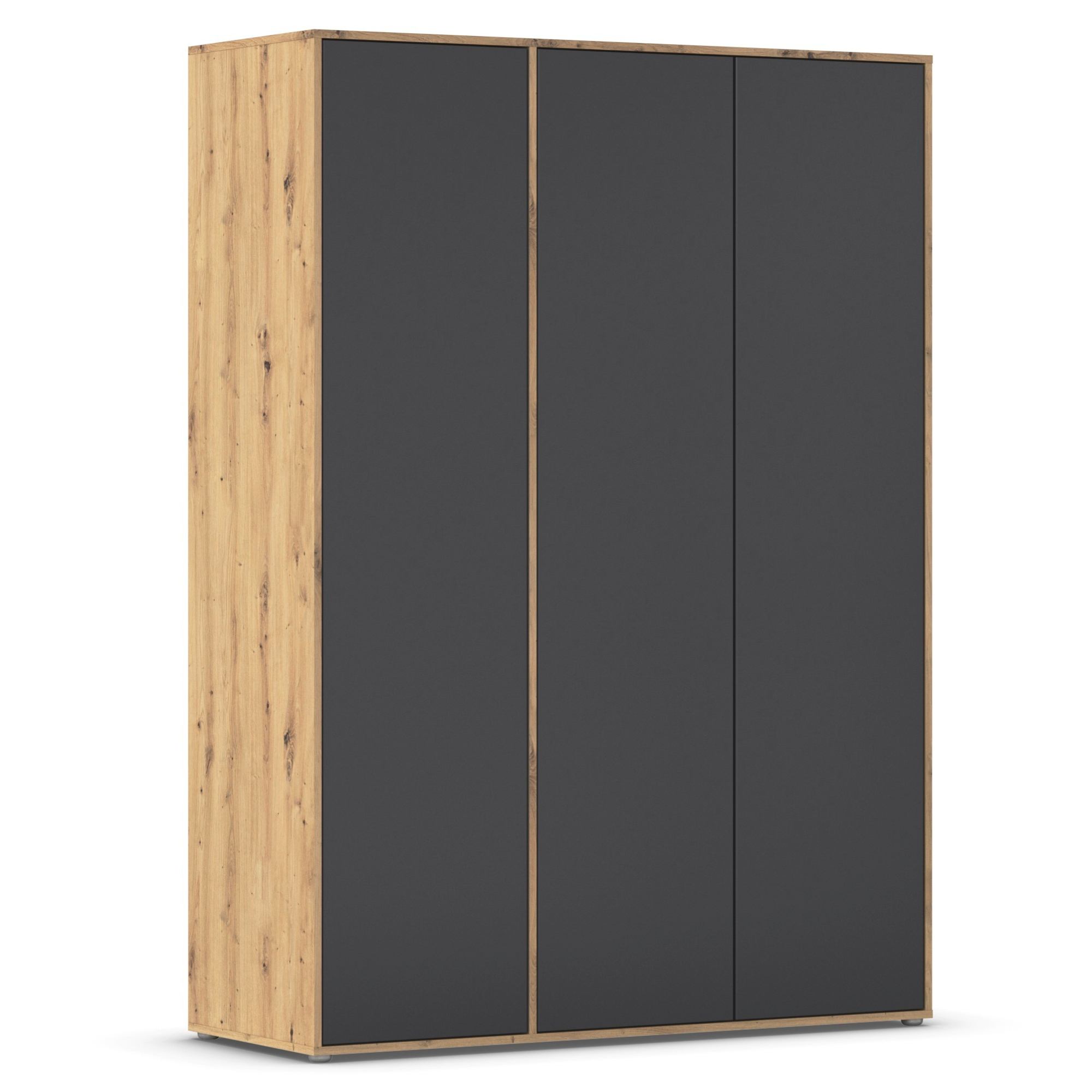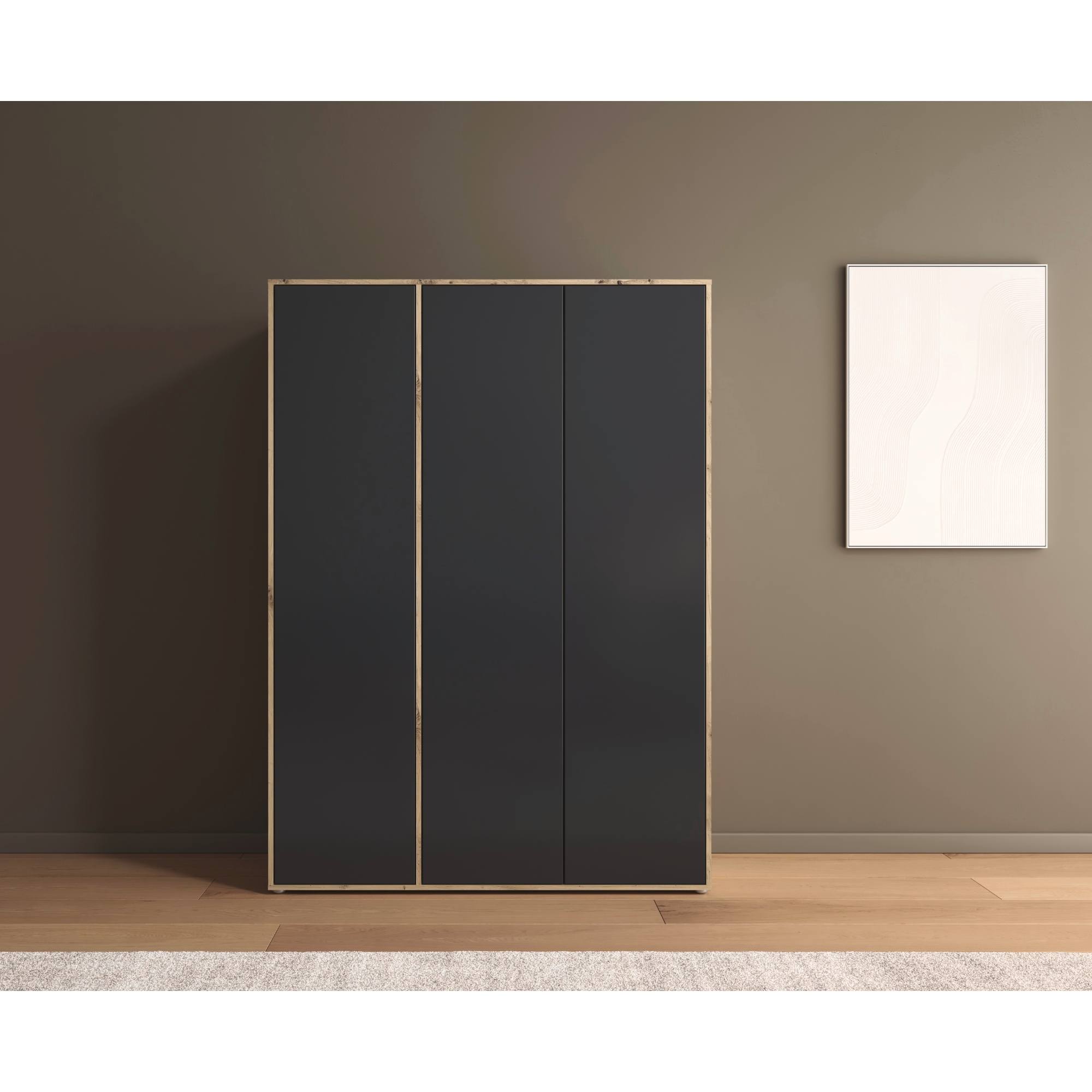 Skriňa je vybavená 3 otočnými dverami ktorých ľahké otváranie umožňuje systém push to open. Pár dverí na pravej strane za sebou ukrýva prepojený priestor s výškovo nastaviteľnou šatníkovou tyčou na zavesenie krčivých a objemnejších kúskov a vloženou policou. Za samostatnými dverami nájdete 3 vložené police na prehľadné skladovanie poskladaného oblečenia a ďalšieho textilu, ktoré je možné voľne usporiadať. Konštrukcia skrine je vyrobená z drevotriesky s povrchom nenáročným na údržbu.