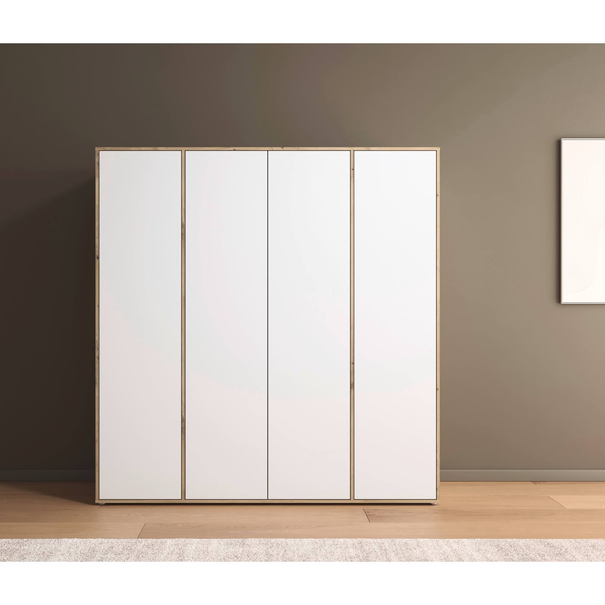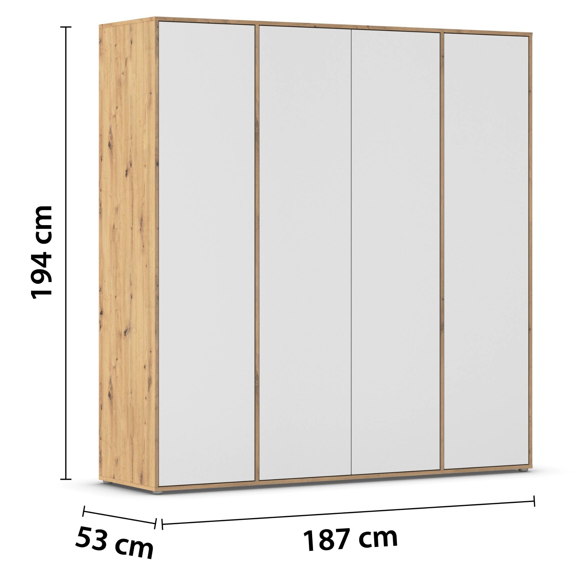Skriňa je vybavená 4 otočnými dverami ktorých ľahké otváranie umožňuje systém push to open. Stredový pár dverí za sebou ukrýva prepojený priestor s výškovo nastaviteľnou šatníkovou tyčou na zavesenie krčivých a objemnejších kúskov a vloženou policou. Za každými z 2 samostatných dverí nájdete 3 vložené police na prehľadné skladovanie poskladaného oblečenia a ďalšieho textilu, ktoré je možné voľne usporiadať. Konštrukcia skrine je vyrobená z drevotriesky s povrchom nenáročným na údržbu.
