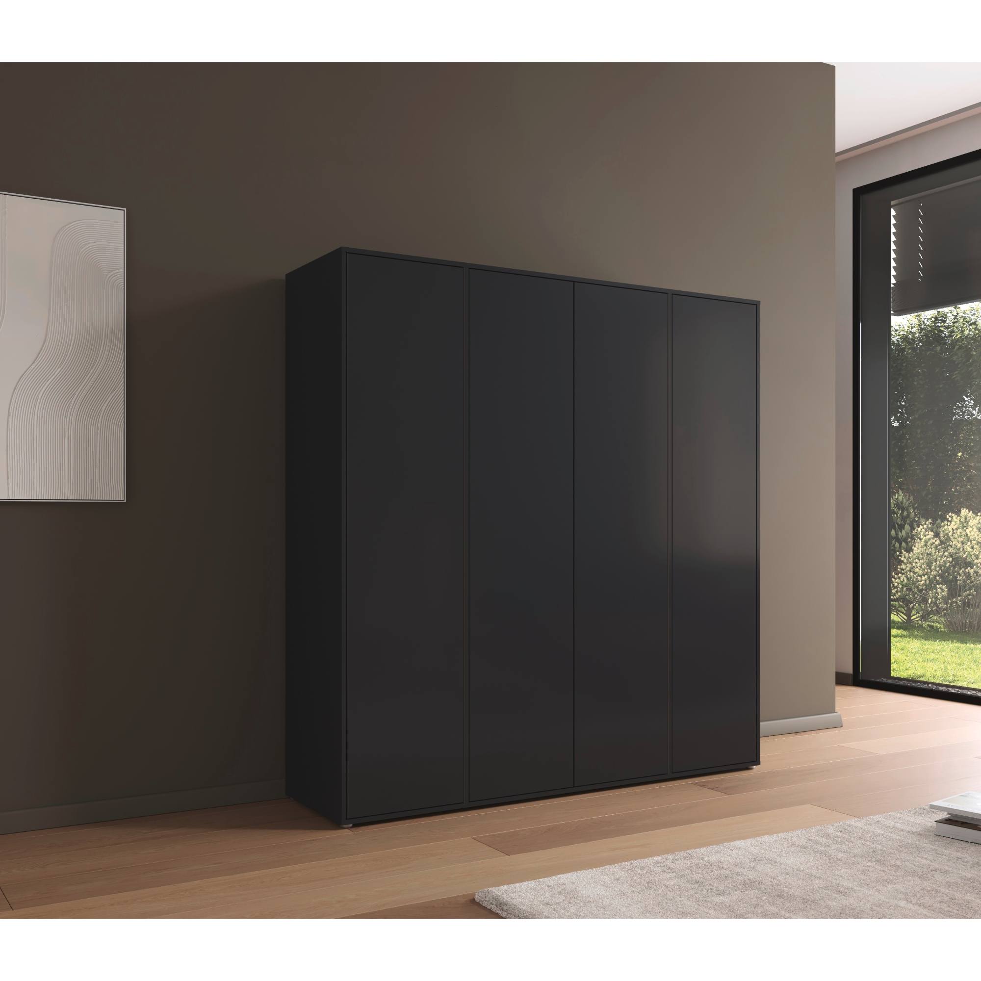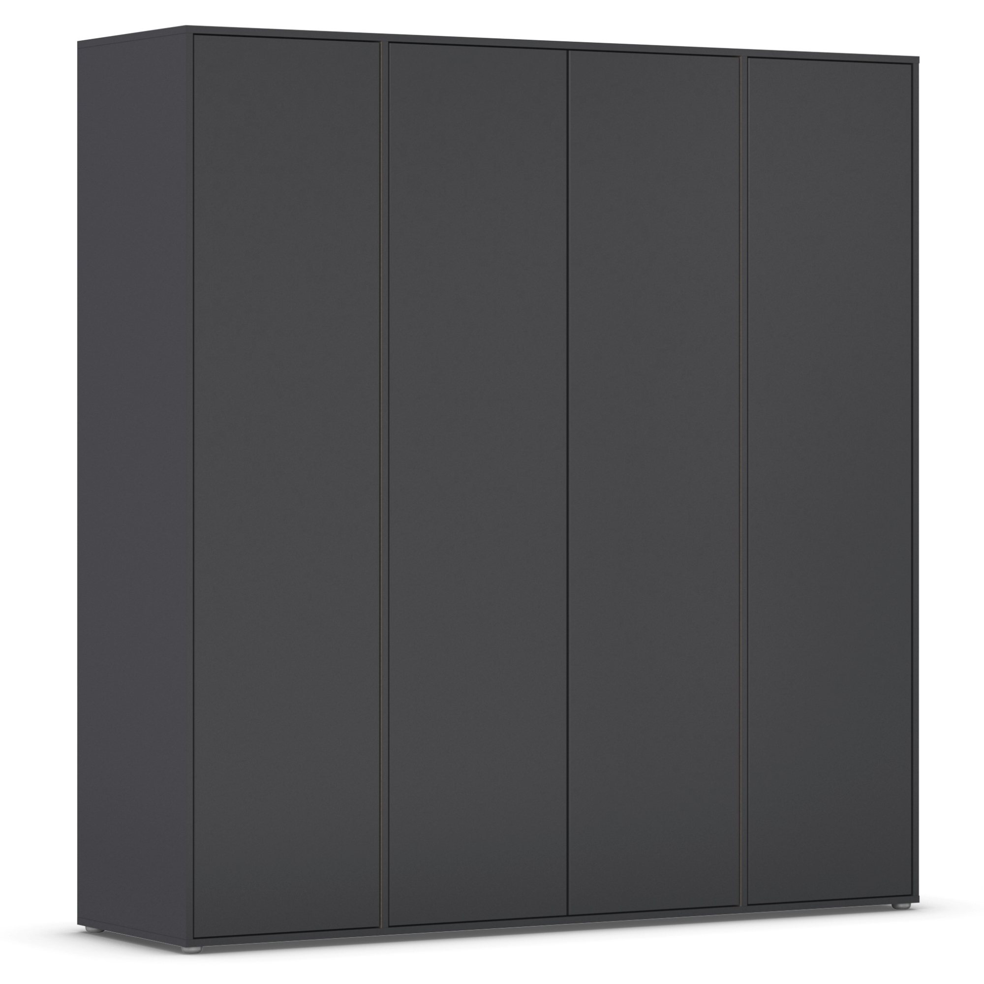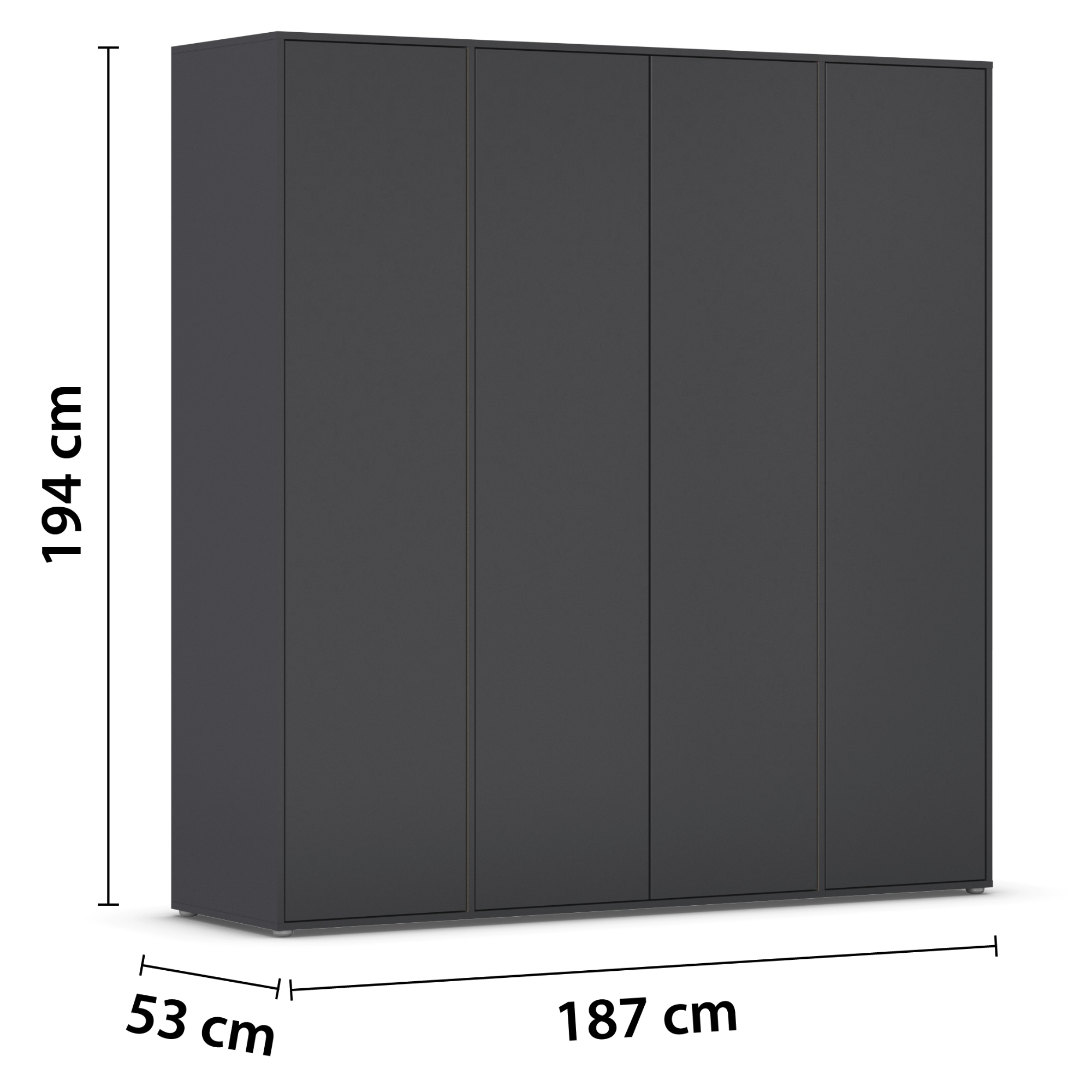 Skriňa je vybavená 4 otočnými dverami ktorých ľahké otváranie umožňuje systém push to open. Stredový pár dverí za sebou ukrýva prepojený priestor s výškovo nastaviteľnou šatníkovou tyčou na zavesenie krčivých a objemnejších kúskov a vloženou policou. Za každými z 2 samostatných dverí nájdete 3 vložené police na prehľadné skladovanie poskladaného oblečenia a ďalšieho textilu, ktoré je možné voľne usporiadať. Konštrukcia skrine je vyrobená z drevotriesky s povrchom nenáročným na údržbu.