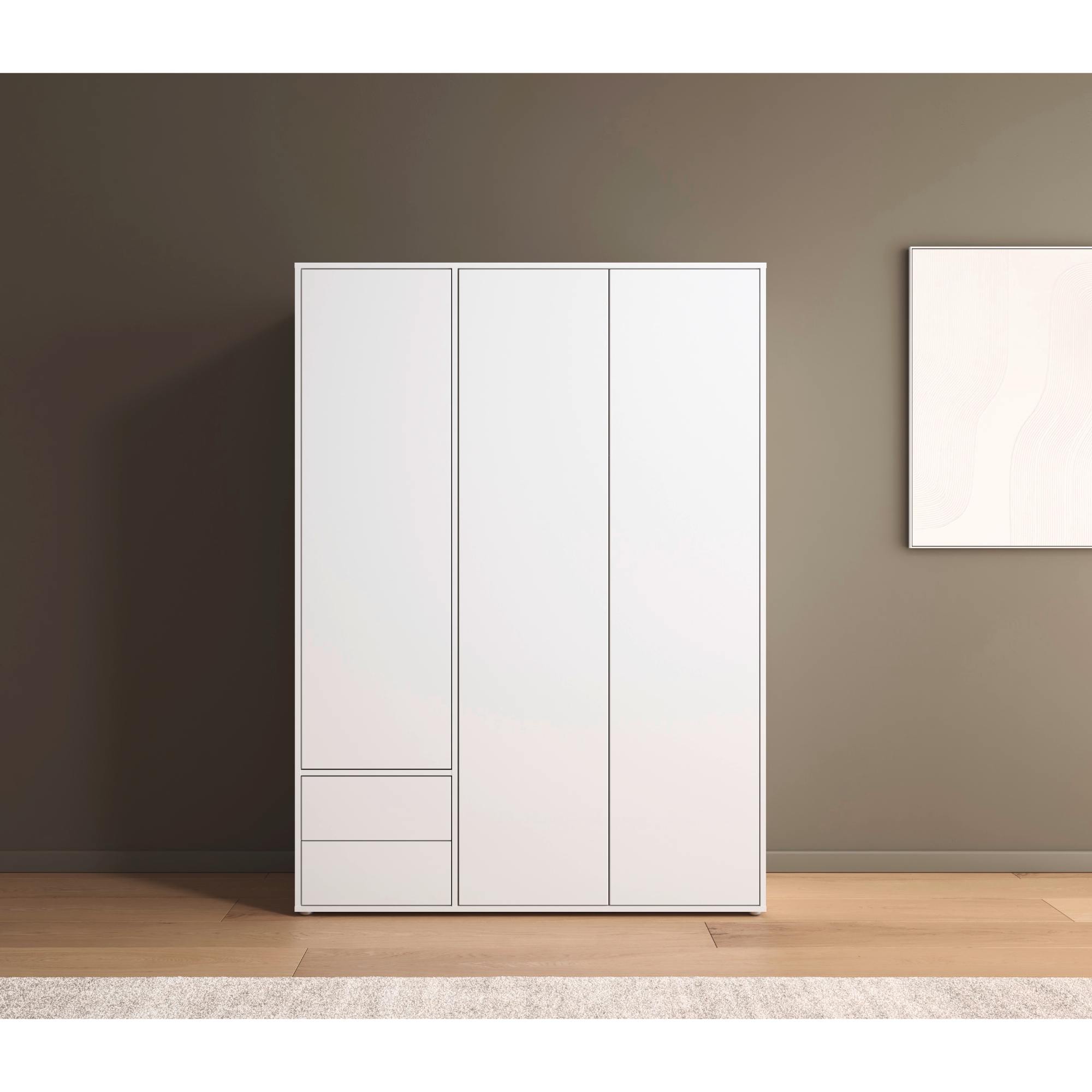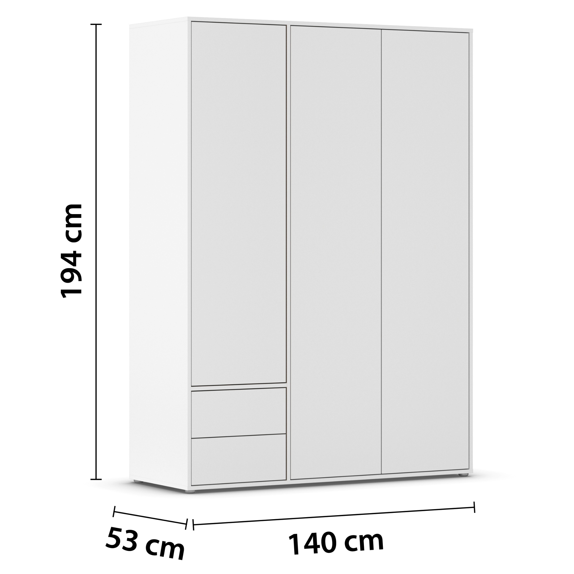 Skriňa je vybavená 3 otočnými dverami ktorých ľahké otváranie umožňuje systém push to open. Pár dverí na pravej strane za sebou ukrýva prepojený priestor s výškovo nastaviteľnou šatníkovou tyčou na zavesenie krčivých a objemnejších kúskov a vloženou policou. Za samostatnými dverami nájdete 2 vložené police na prehľadné skladovanie poskladaného oblečenia a ďalšieho textilu, ktoré je možné voľne usporiadať. Na oddelenie drobného oblečenia a doplnkov môžete využiť ešte 2 zásuvky v spodnej časti. Konštrukcia skrine je vyrobená z drevotriesky s povrchom nenáročným na údržbu.